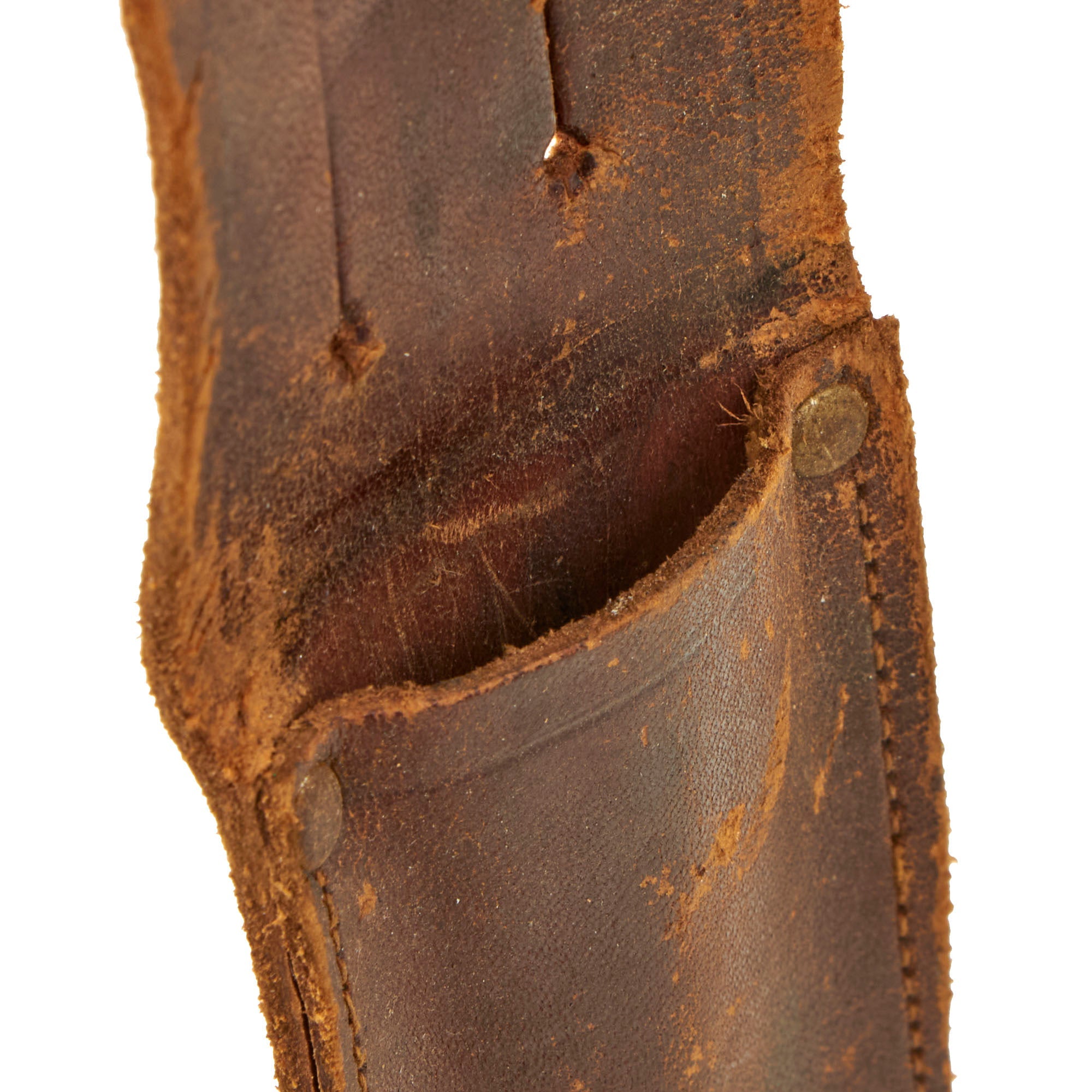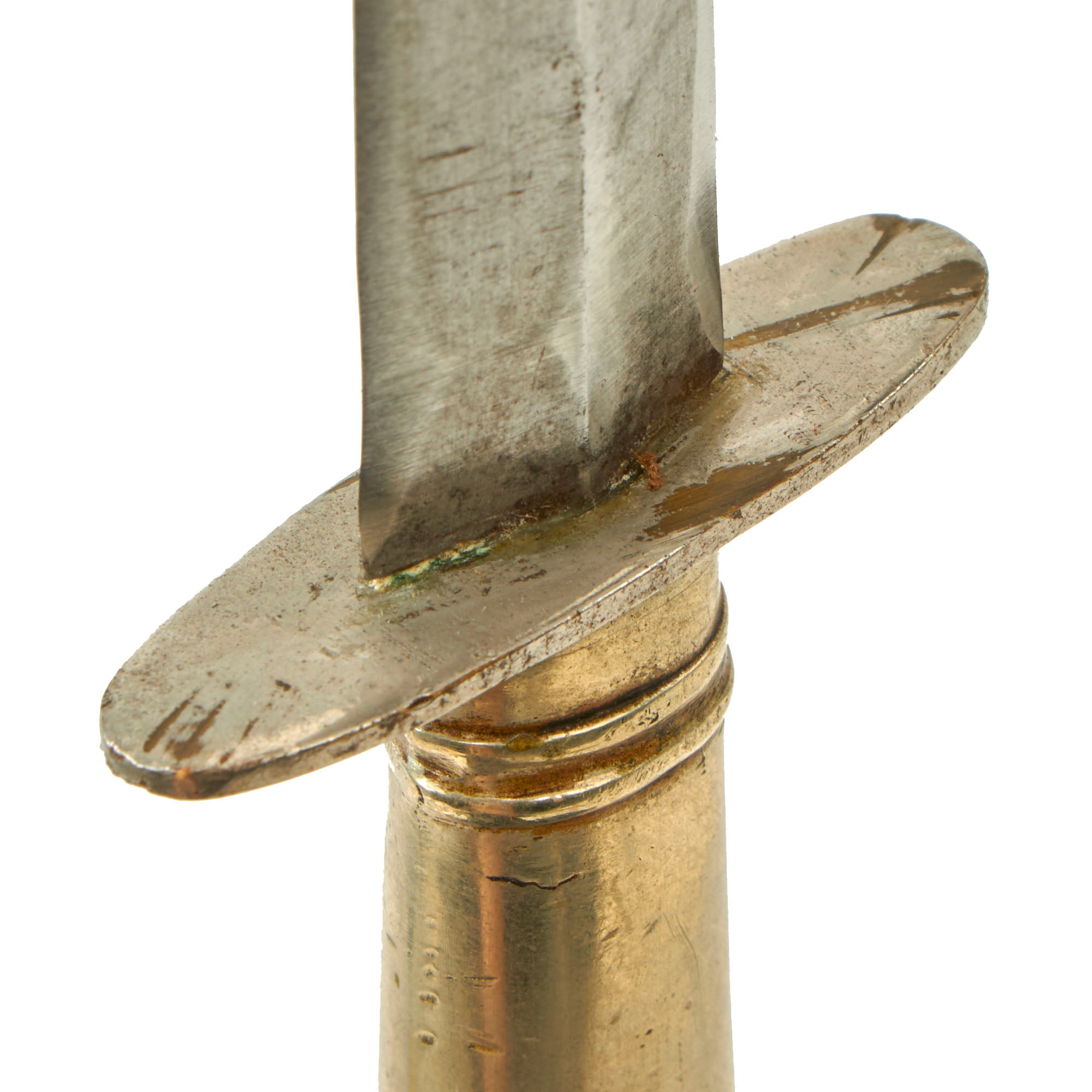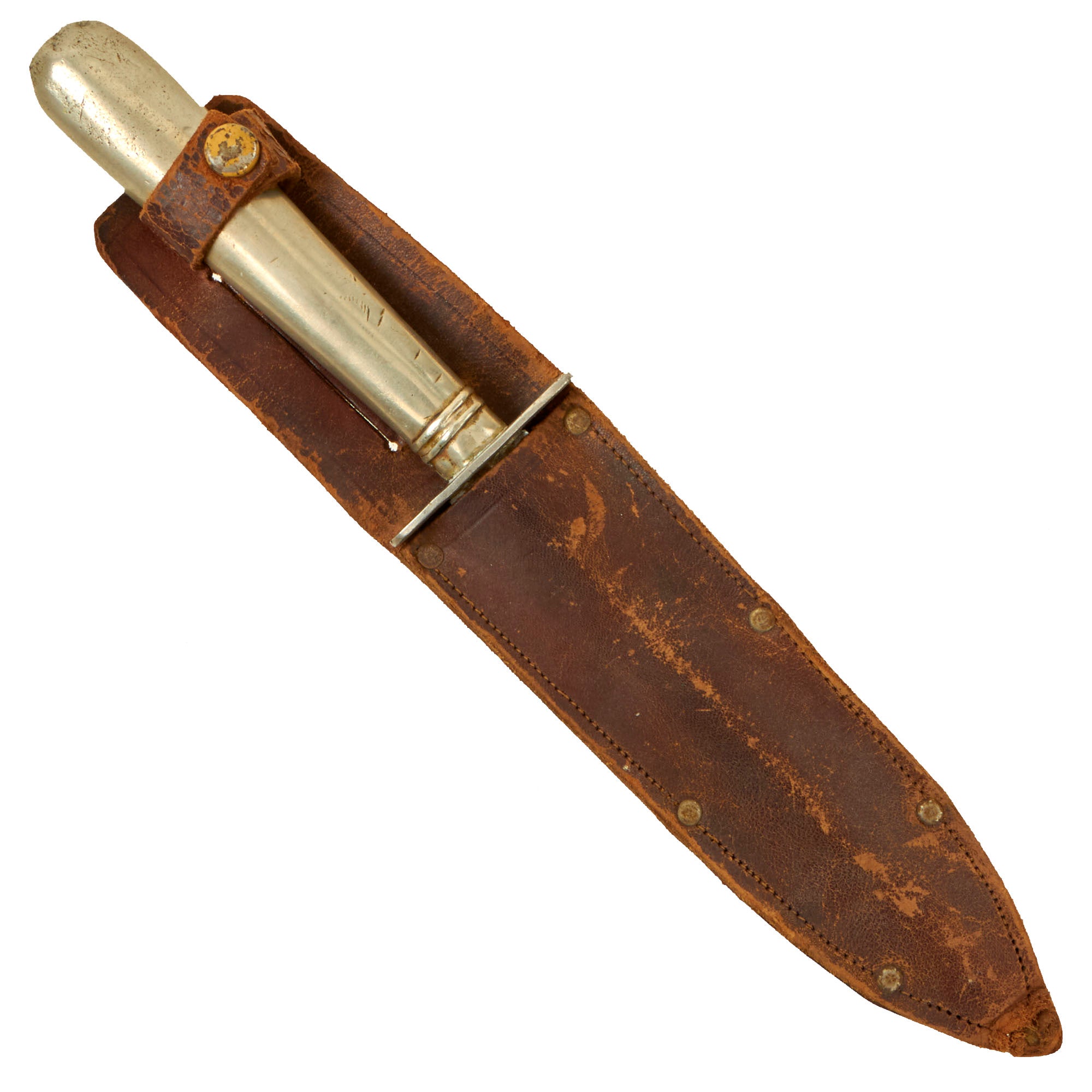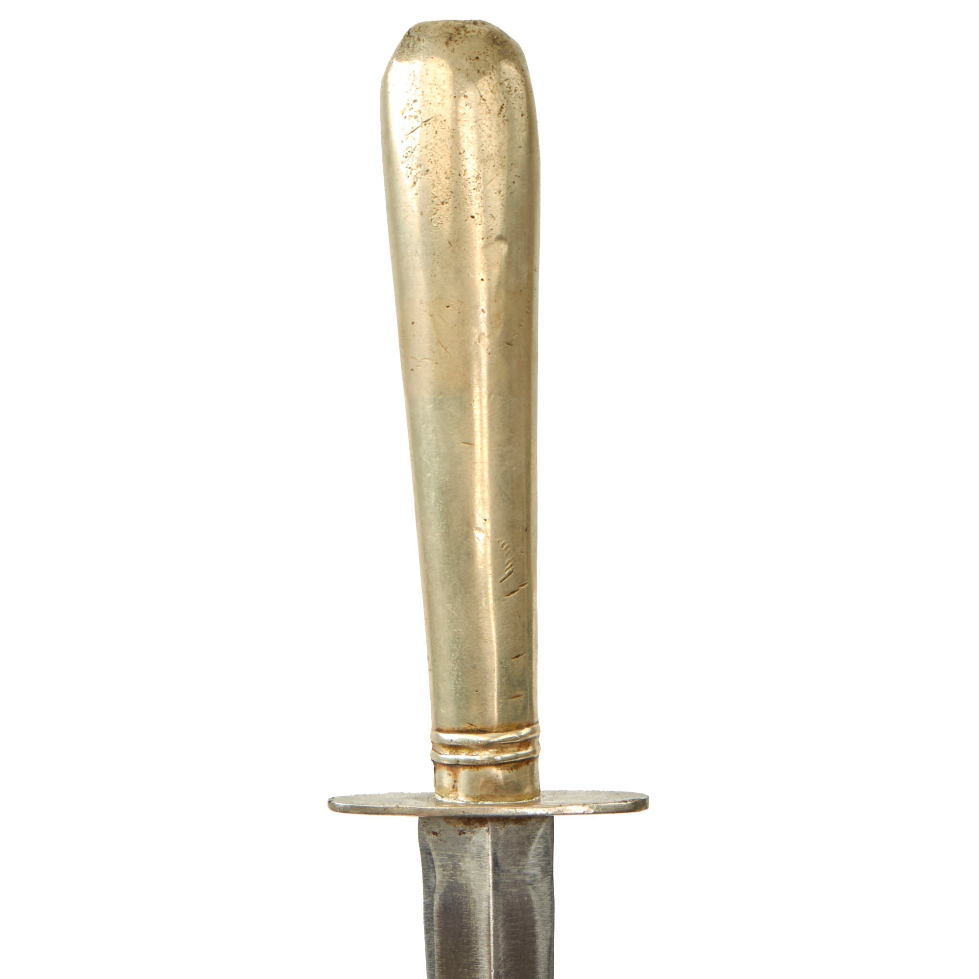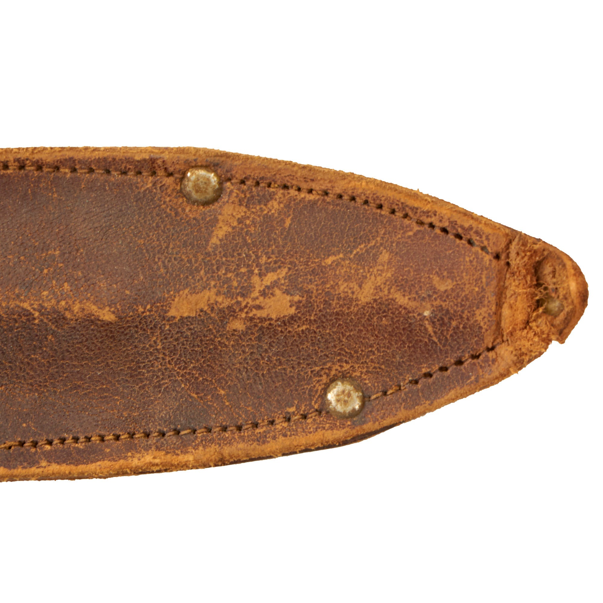 This is one of the most interesting F-S daggers we have come across. The crossguard is nickel-plated brass, and the hilt is German silver, as can be ascertained from the tarnish. The leather sheath is marked as shown and the leather is in fair condition with some damage. The blade shows heavy use, meaning any markings it once had have faded away from use and time. The hilt has several scuffs and dents at the bottom as shown. This is a very beautiful and unique F-S knife, the first we have come across in this configuration.