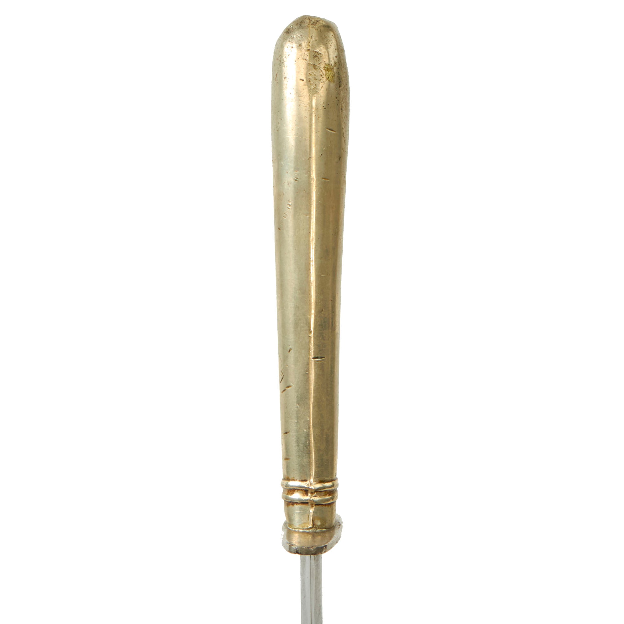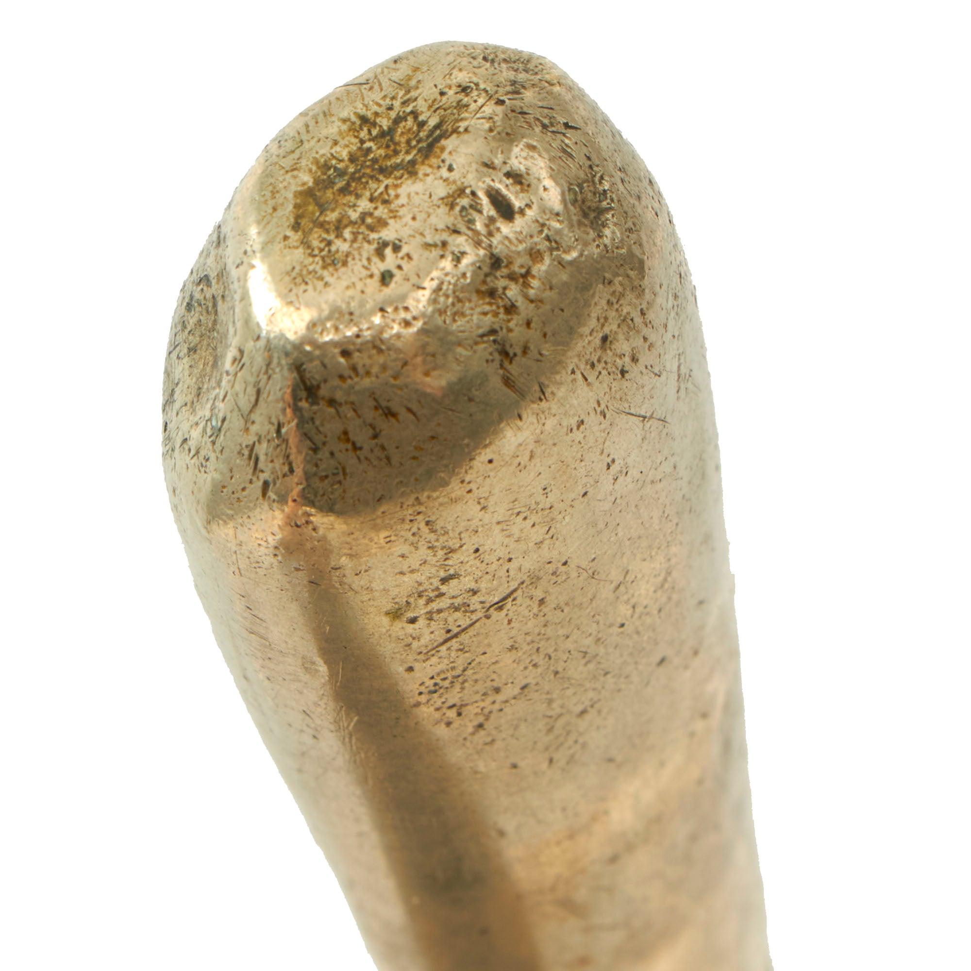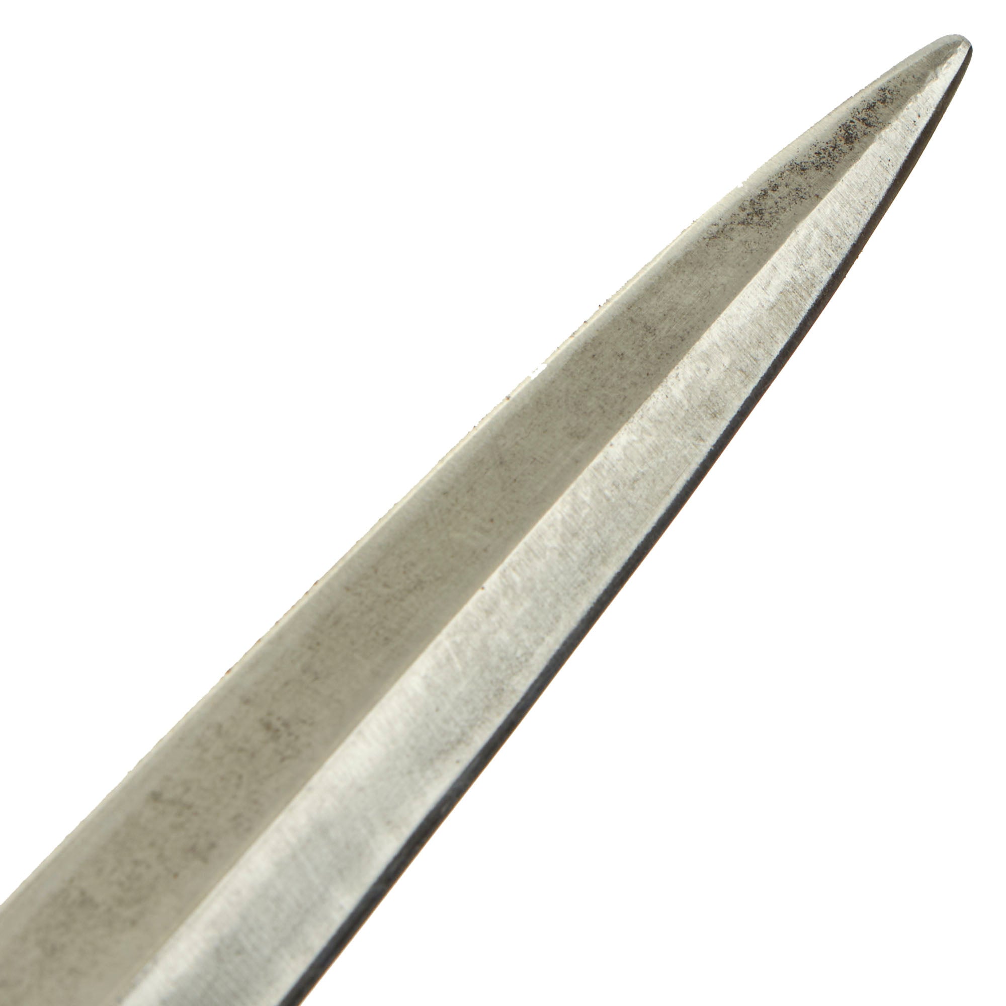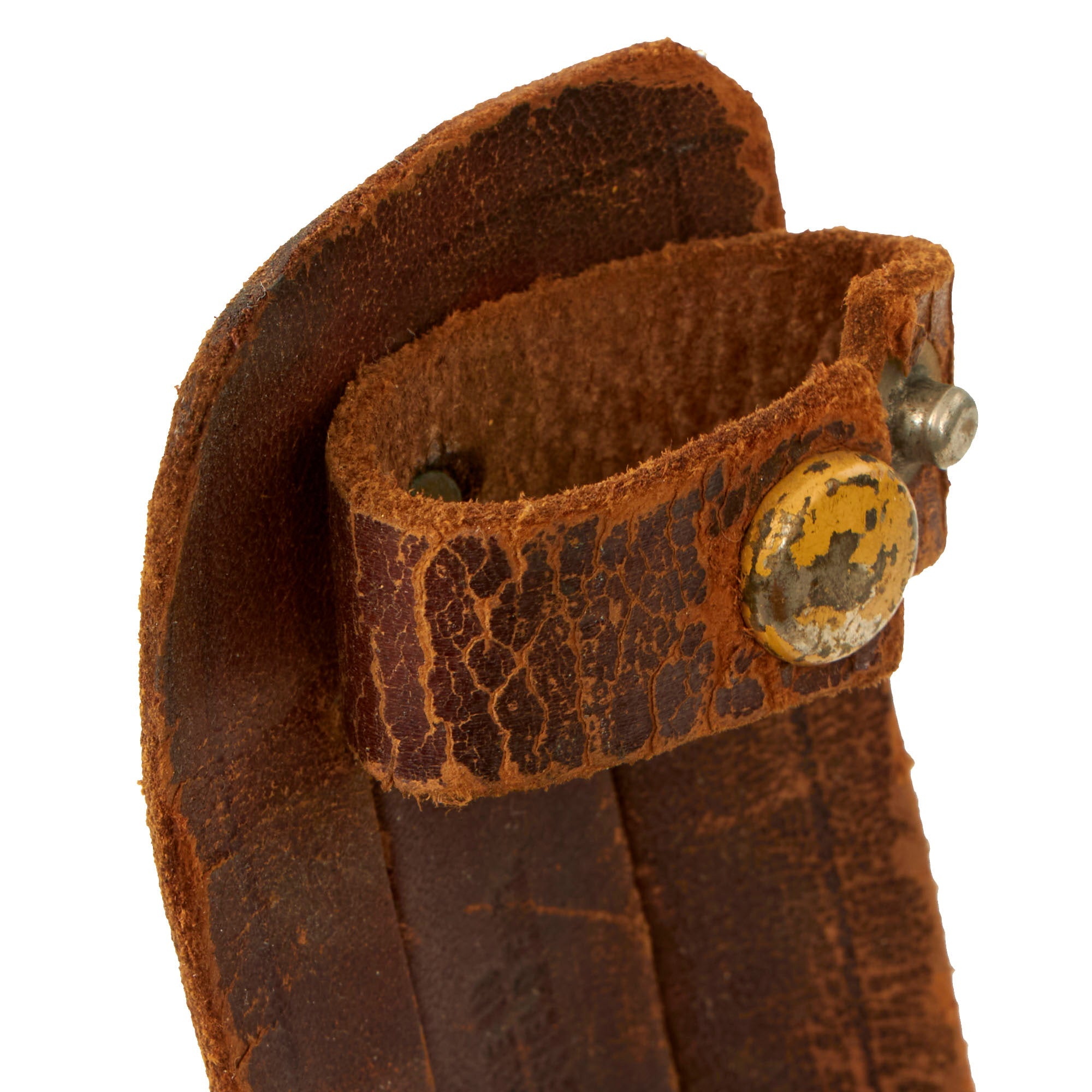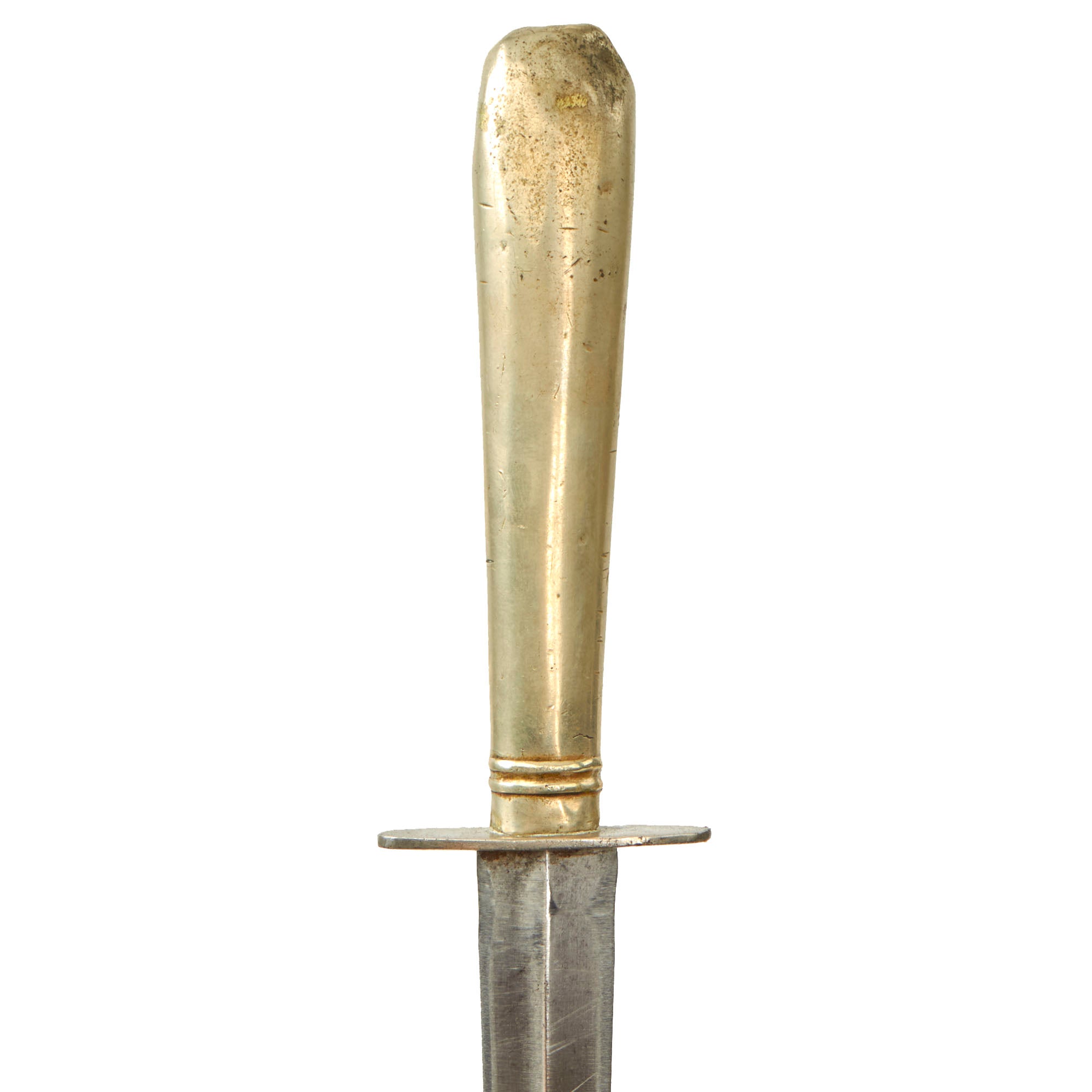This is one of the most interesting F-S daggers we have come across. The crossguard is nickel-plated brass, and the hilt is German silver, as can be ascertained from the tarnish. The leather sheath is marked as shown and the leather is in fair condition with some damage. The blade shows heavy use, meaning any markings it once had have faded away from use and time. The hilt has several scuffs and dents at the bottom as shown. This is a very beautiful and unique F-S knife, the first we have come across in this configuration.