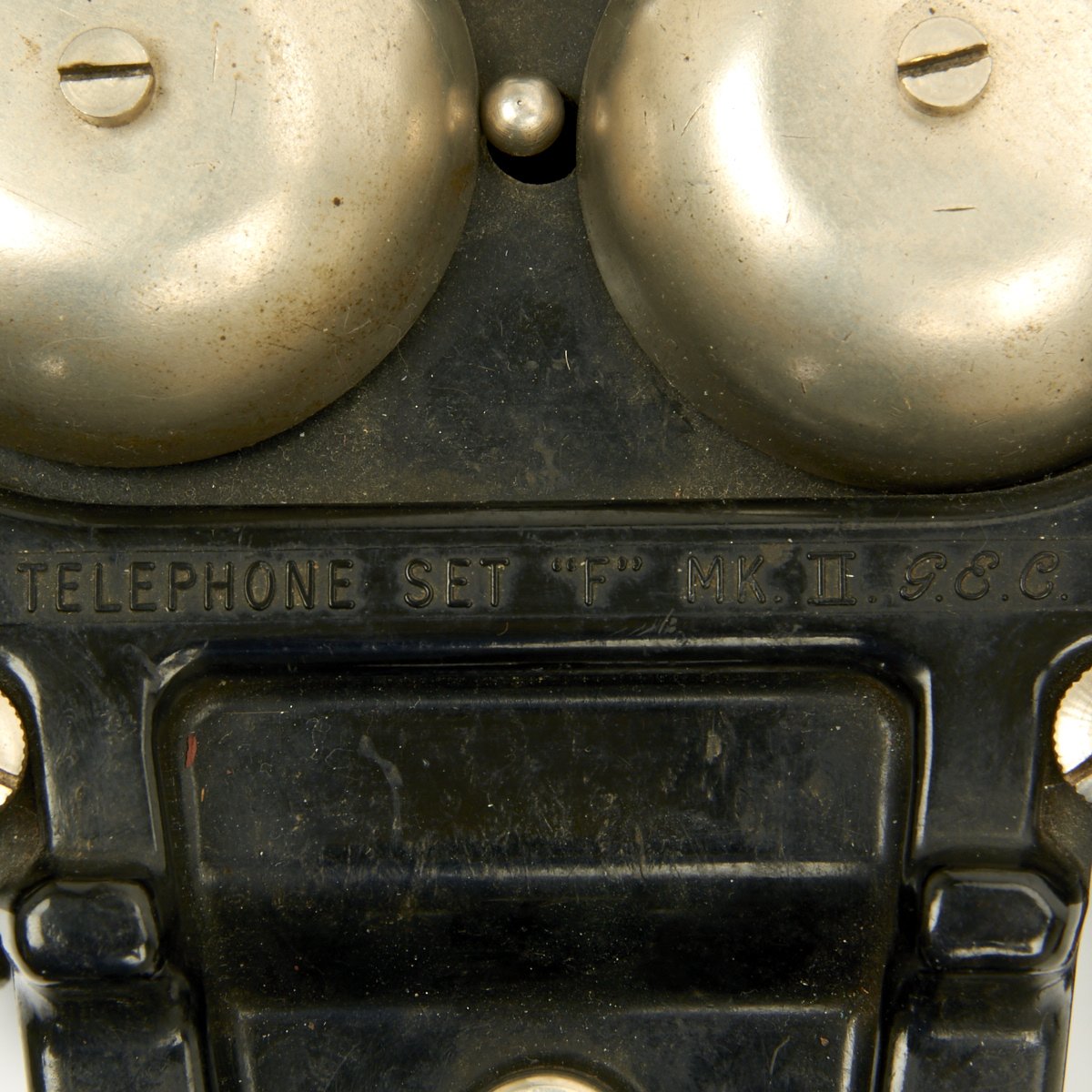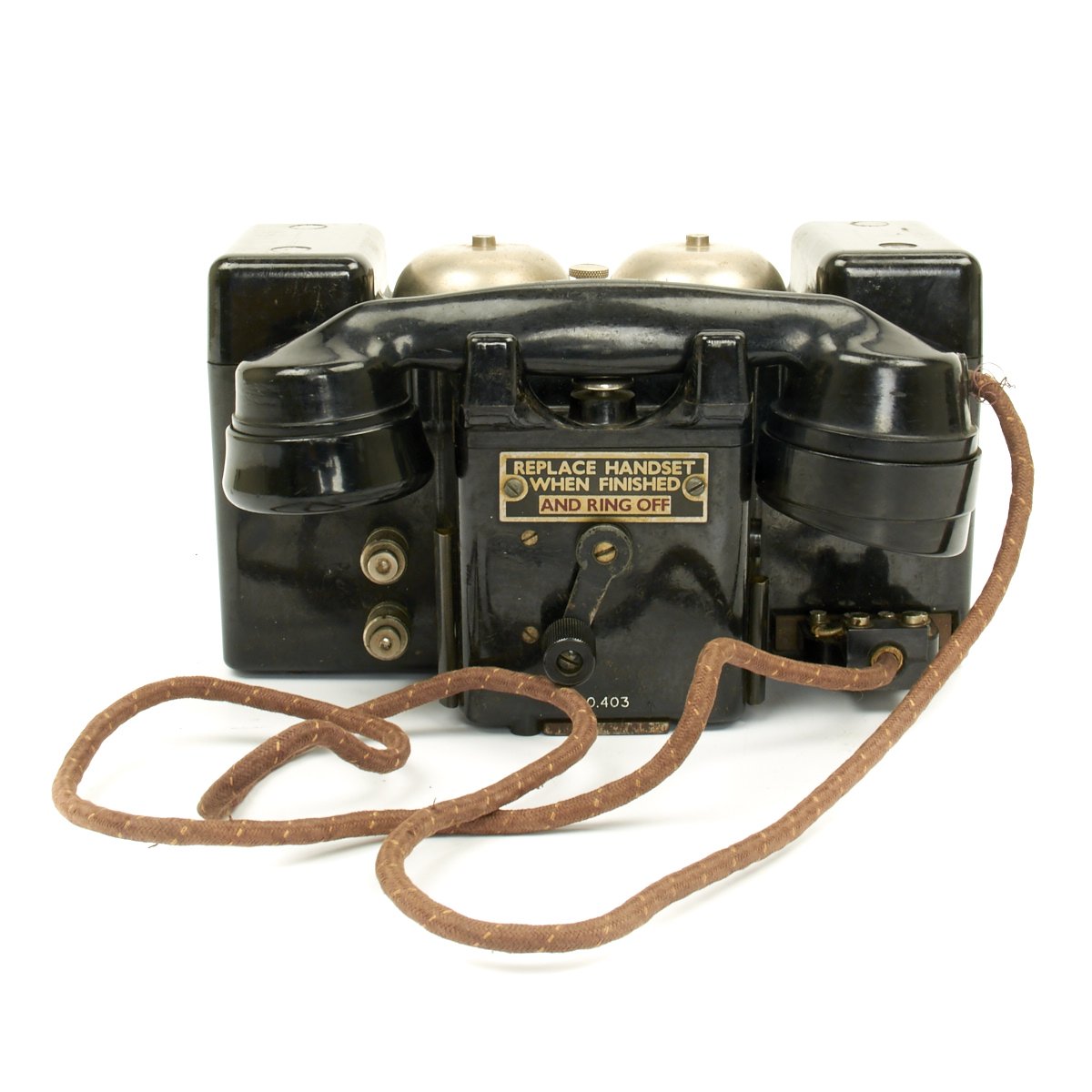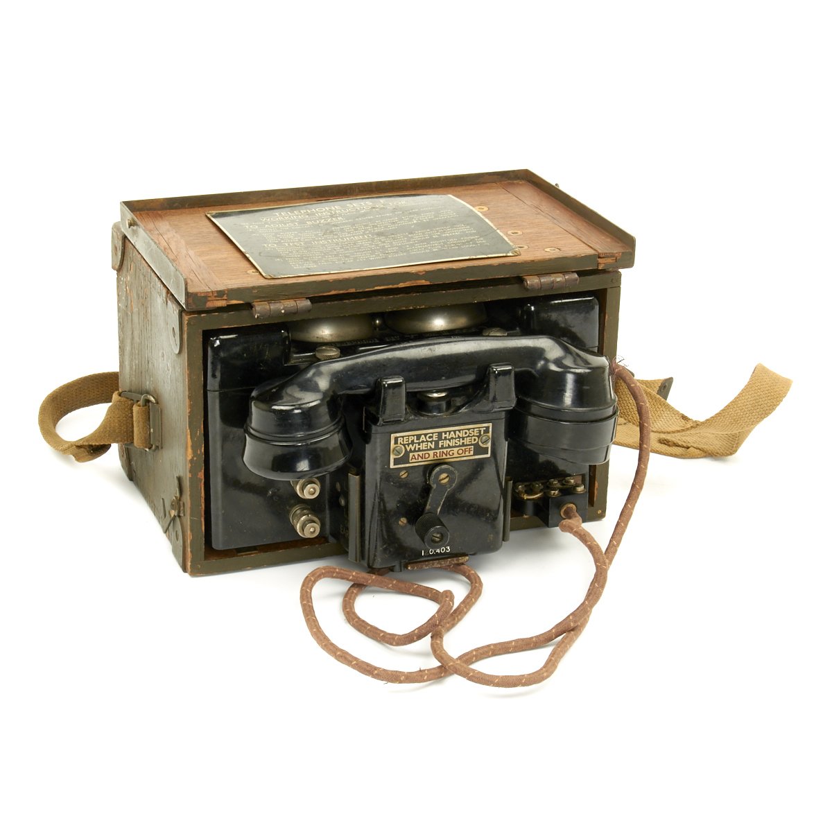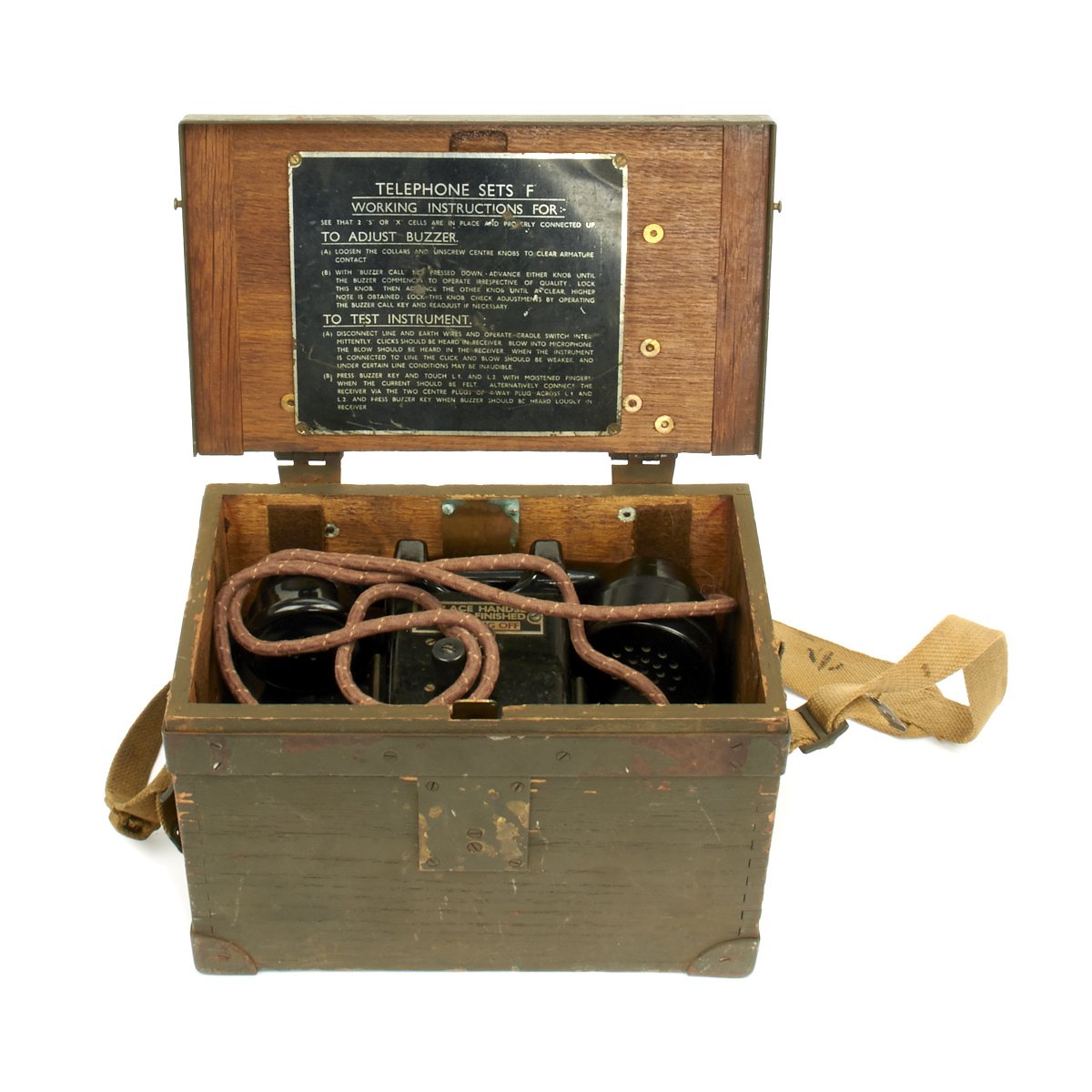 Original Items: Only One Available. This is a genuine fully functional Type F British World War Two field telephone, constructed of bakelite and housed in its original wooden transit case with khaki canvas carry strap. These were Constructed in the early 1940s during WW2 by various contractors. The case is nicely marked: