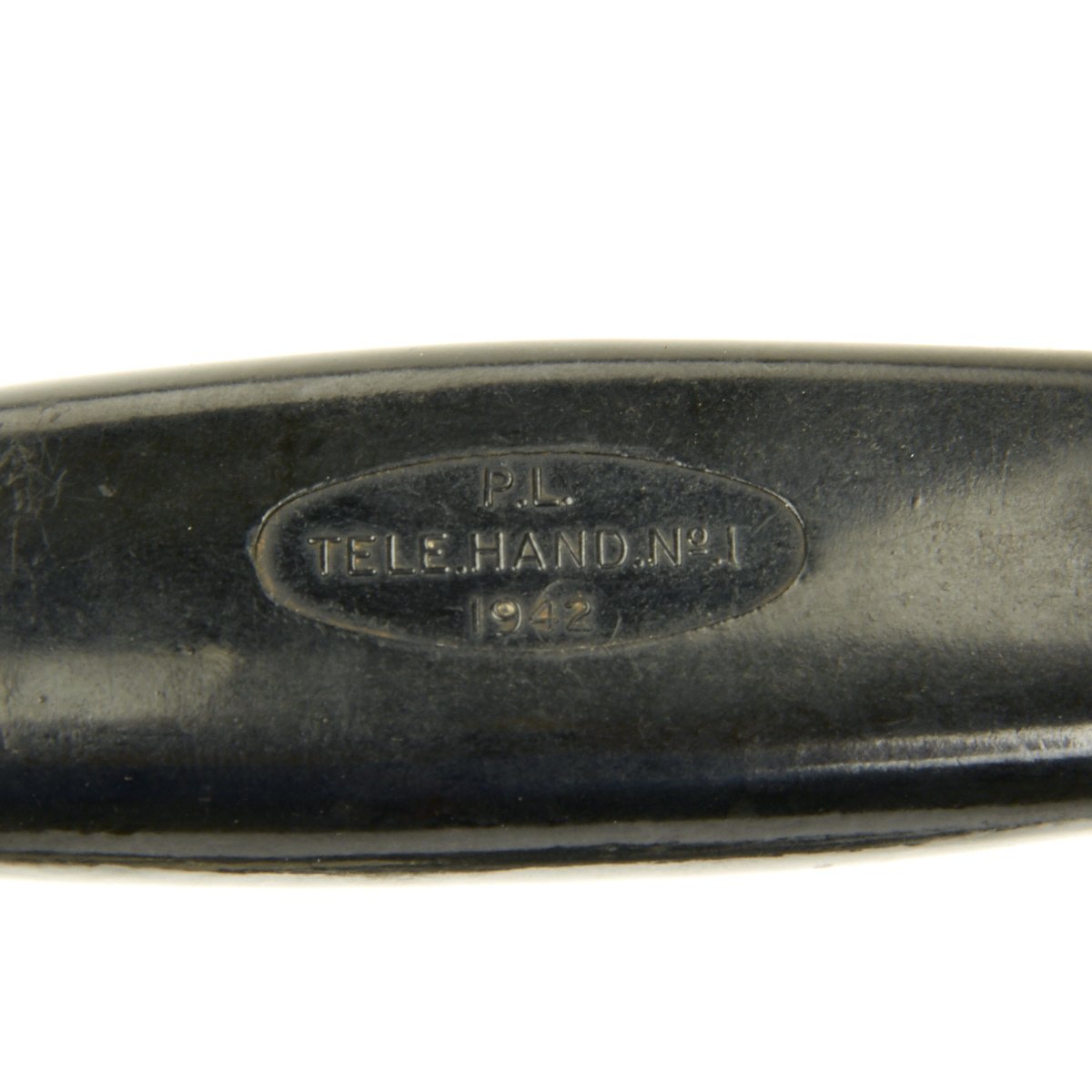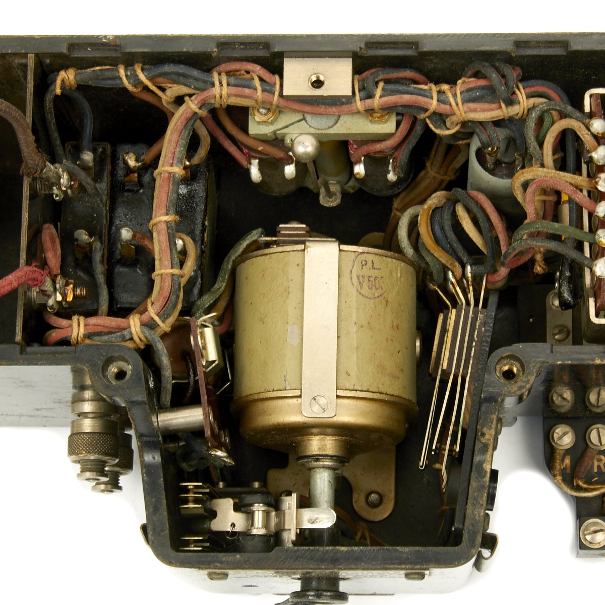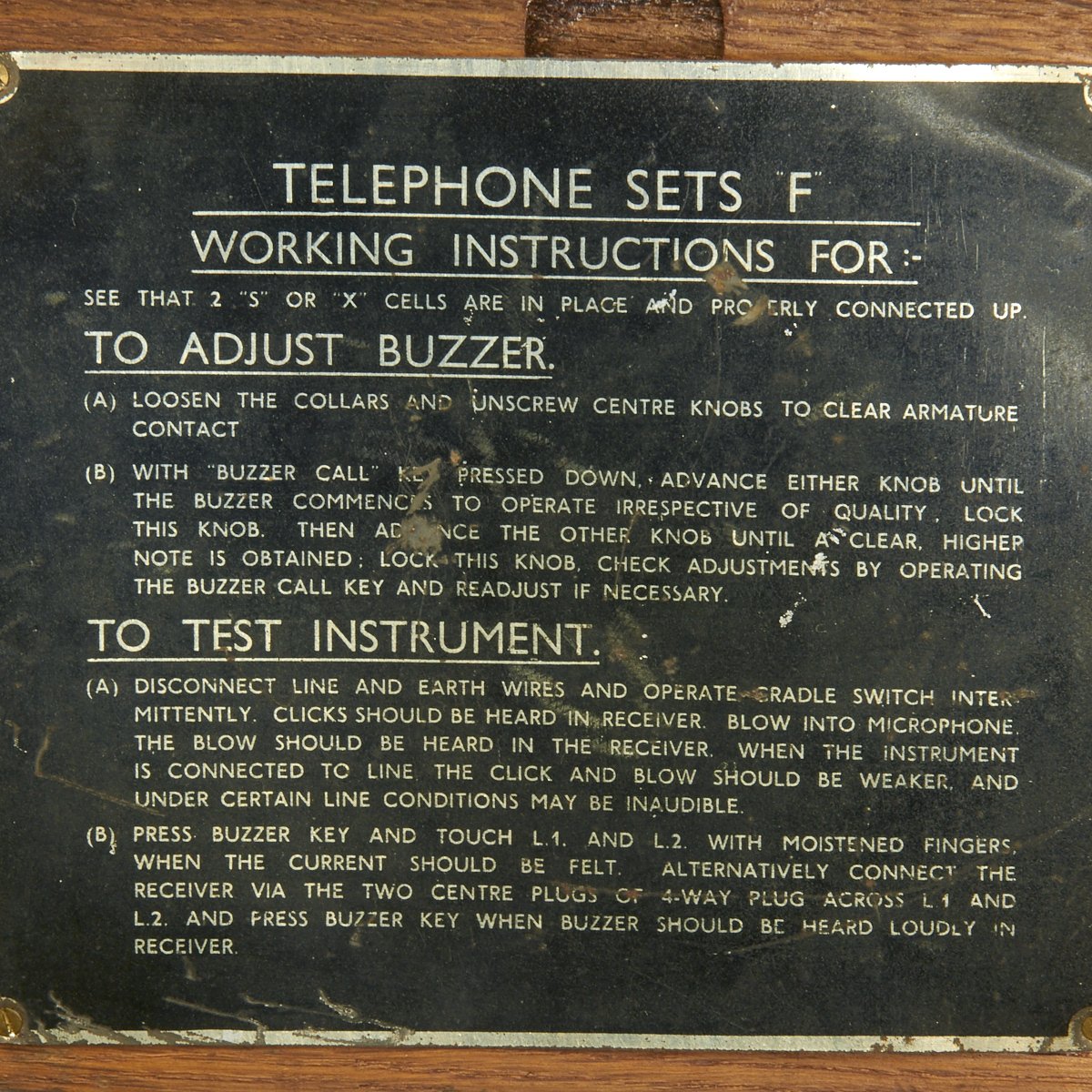 The bakelite handset is in great condition, and is marked P.L. / TELE.HAND.No.1 / 1942. The canvas carry strap is marked B.B. & Co. 1942, along with stock number Y.A. 1532. The interior of the box lid has a data plate on the inside with instructions on the operation of the phone.