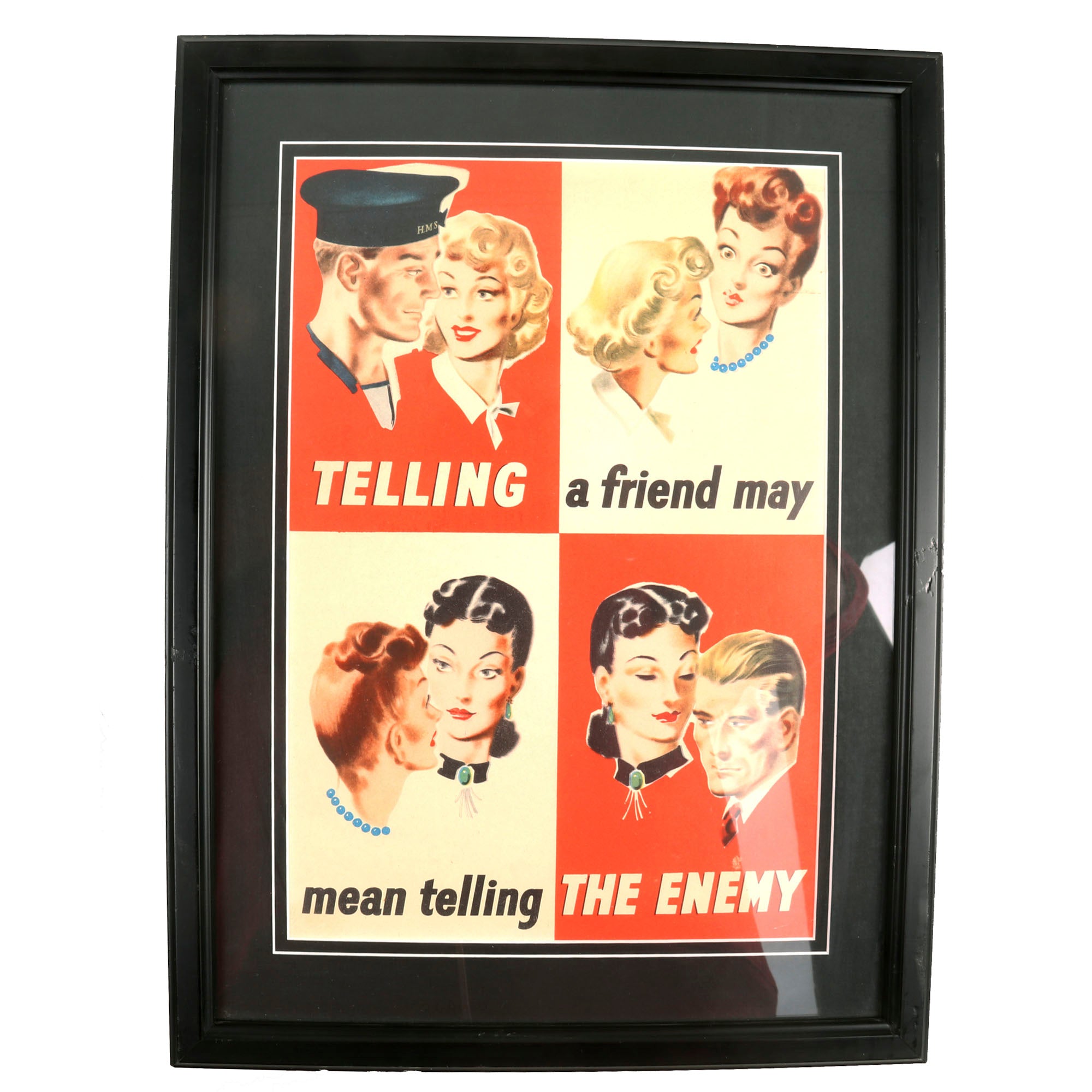 “Telling a Friend May Mean Telling the Enemy” is a WWII poster created in the United Kingdom to help raise awareness of espionage in England during WWII. During the Second World War, there was a constant concern in the UK about inappropriate information being overheard by enemy agents both domestically and abroad.