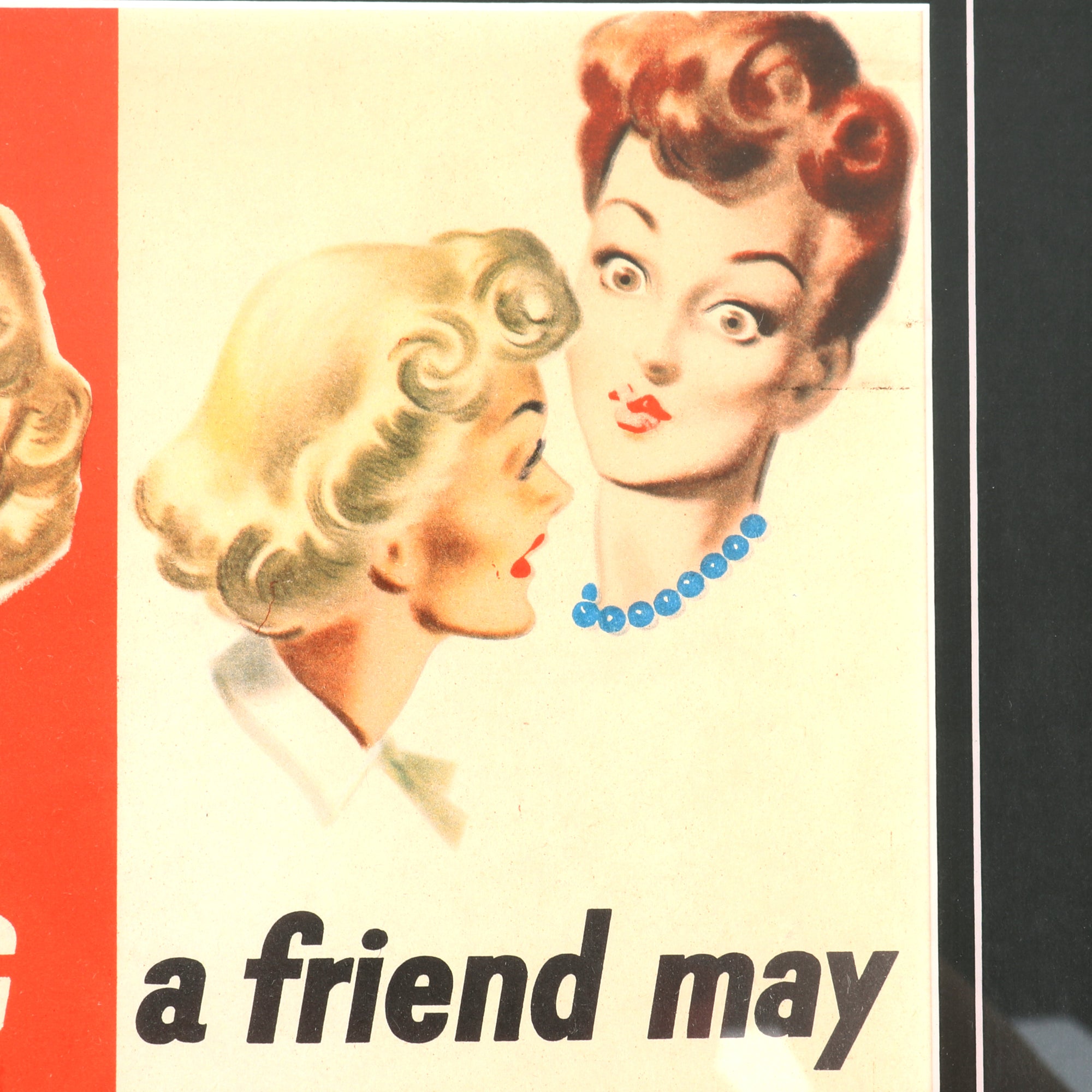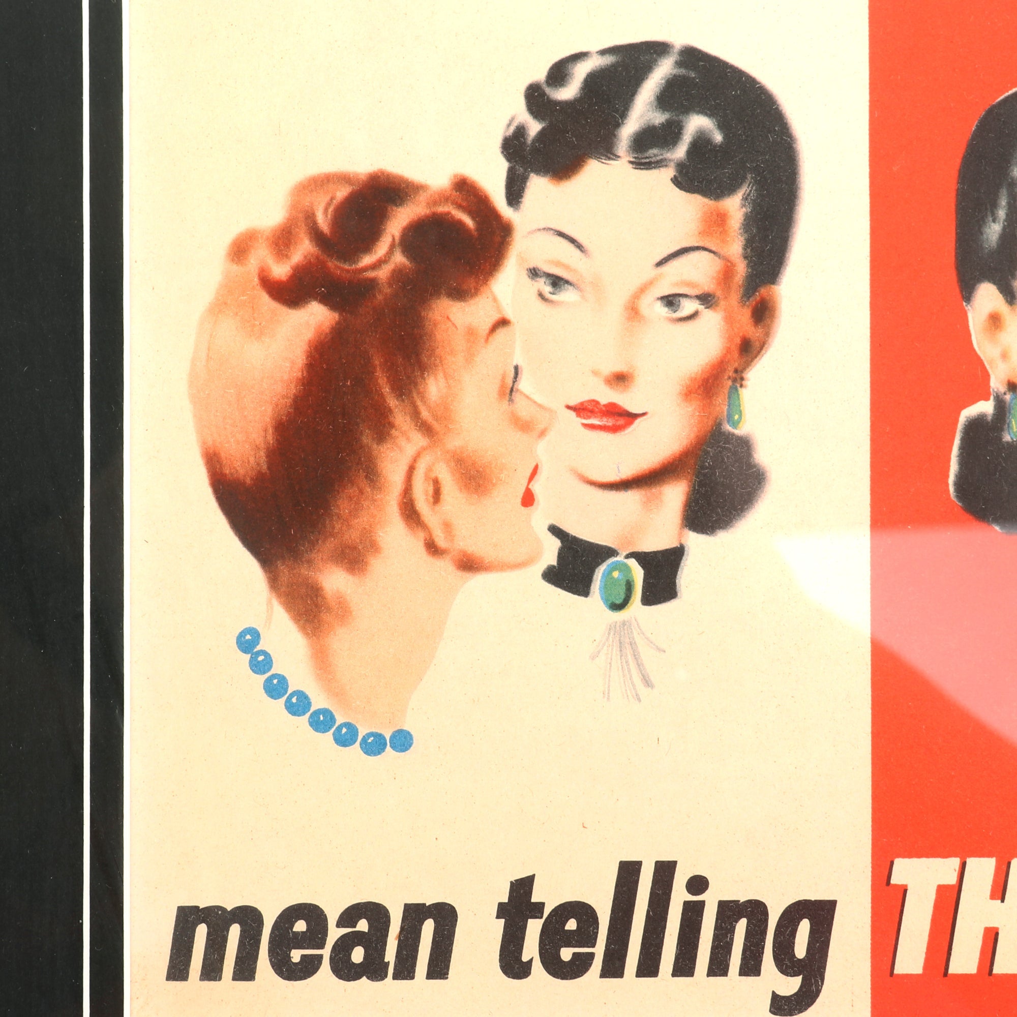 The poster, divided into quadrants (two red, two white), depicts gossip being passed from person to person: sailor to a blonde woman, from her to a redheaded woman, from her to a black haired woman, and from her to a blond male.