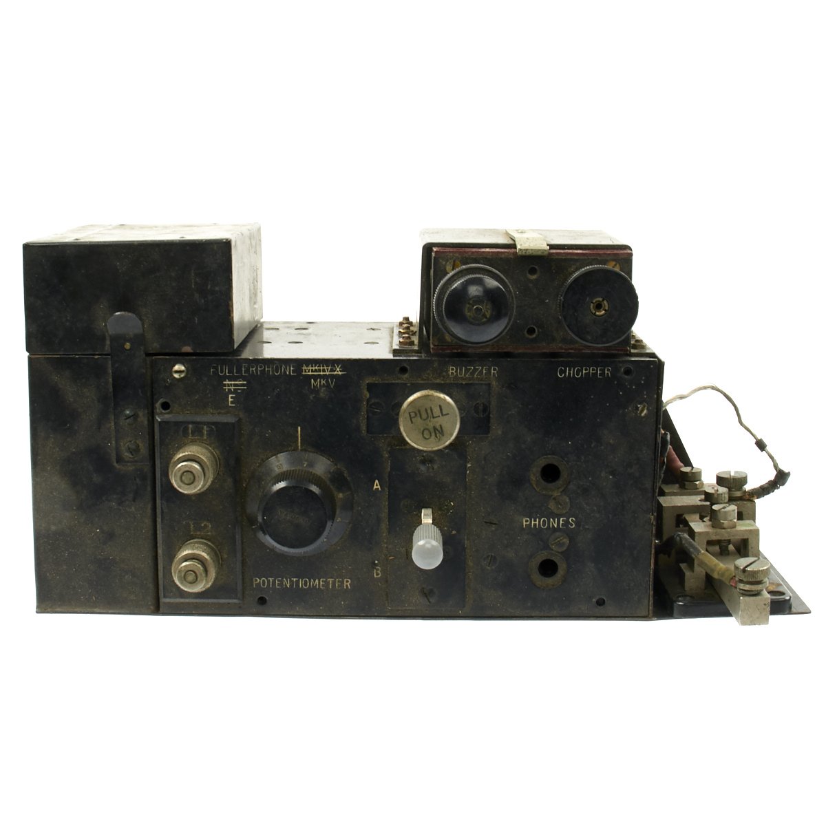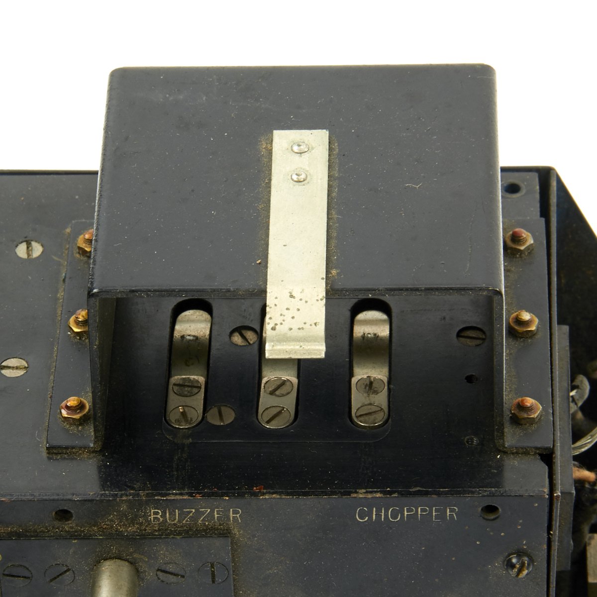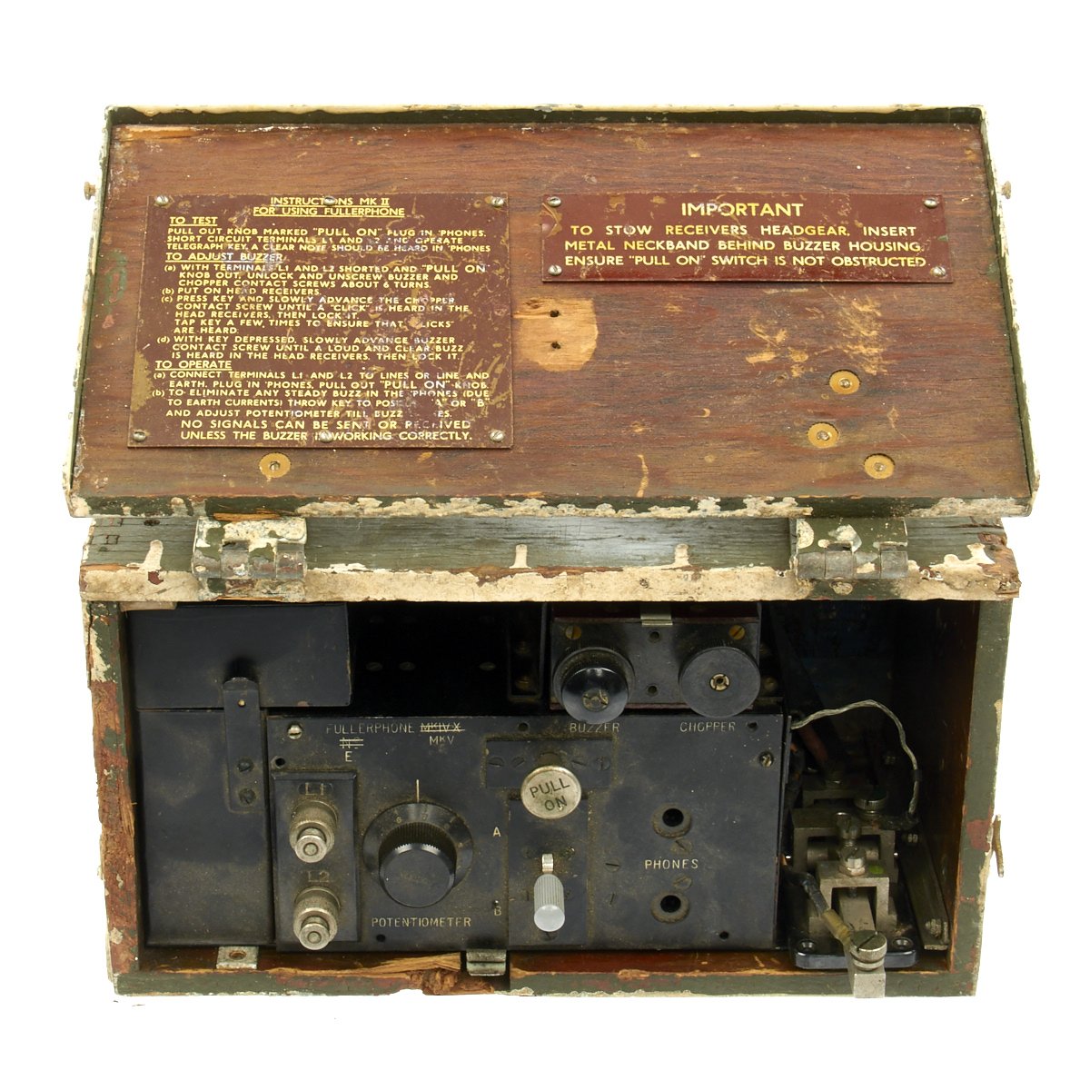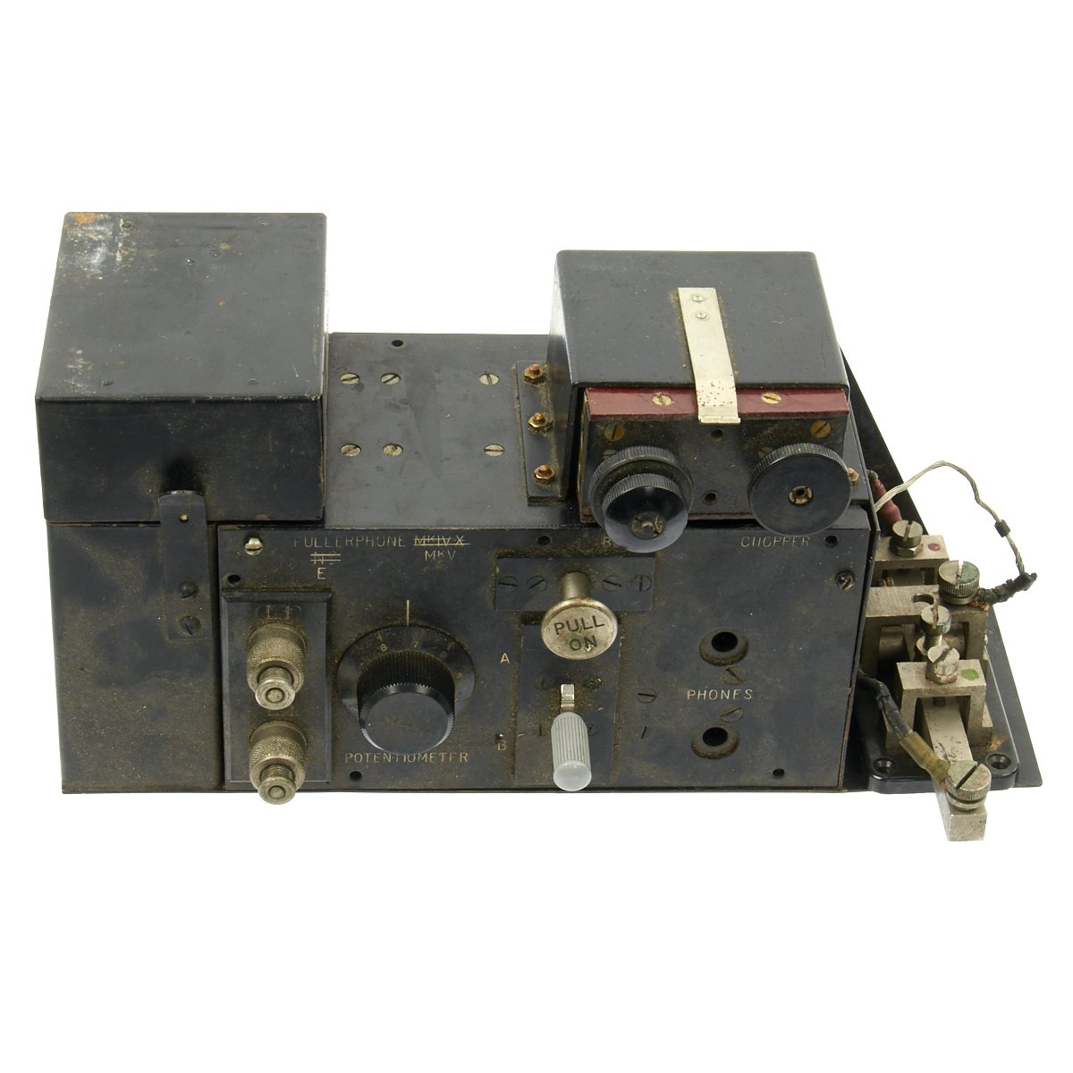 Original Item: Only One Available. This set consists of a key, battery, and buzzer. It was used for field communication over wires. It is based on the design originated in 1915 by A.C. Fuller. This design used Direct Current telegraph signals which were impossible for the enemy to intercept and decode. The design allowed much better security than the American and other 'buzzer sets' which sent code signals in the form of AC buzzing voltages. The fullerphone decodes the D.C. voltages by using an interrupter and handset or earphones.