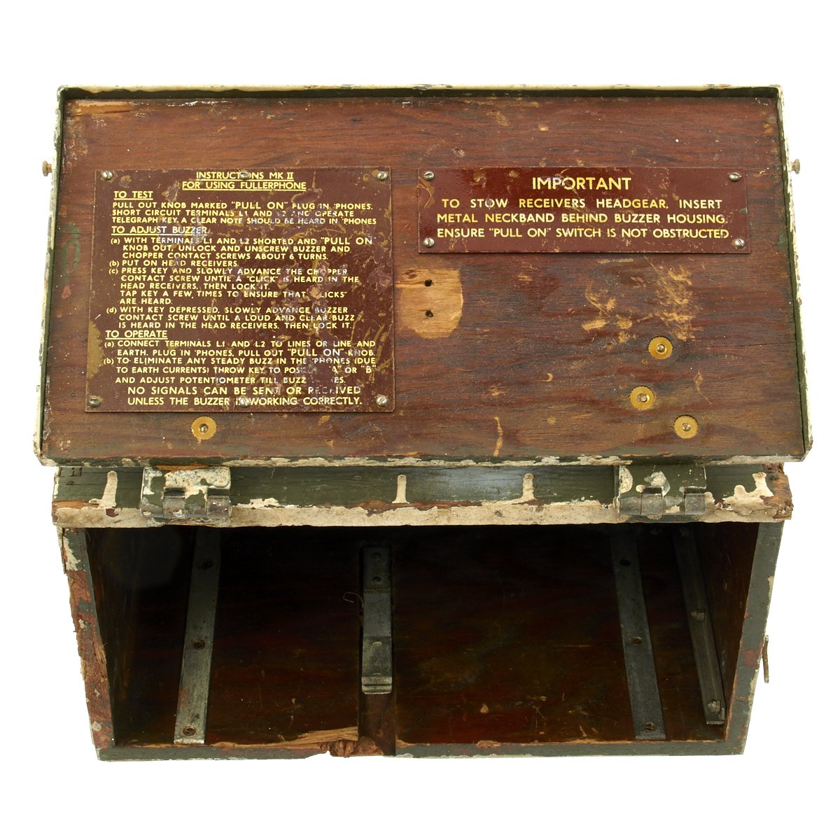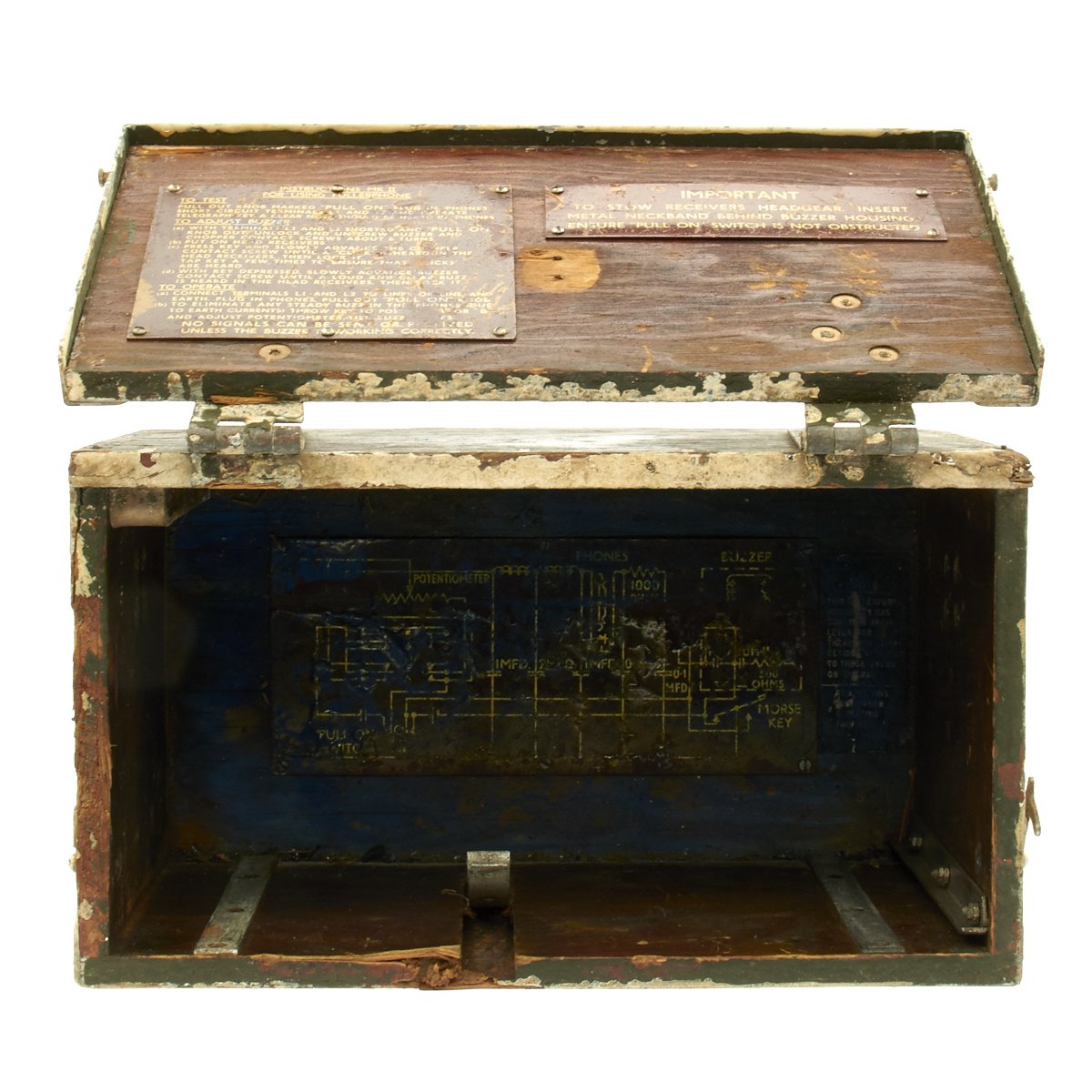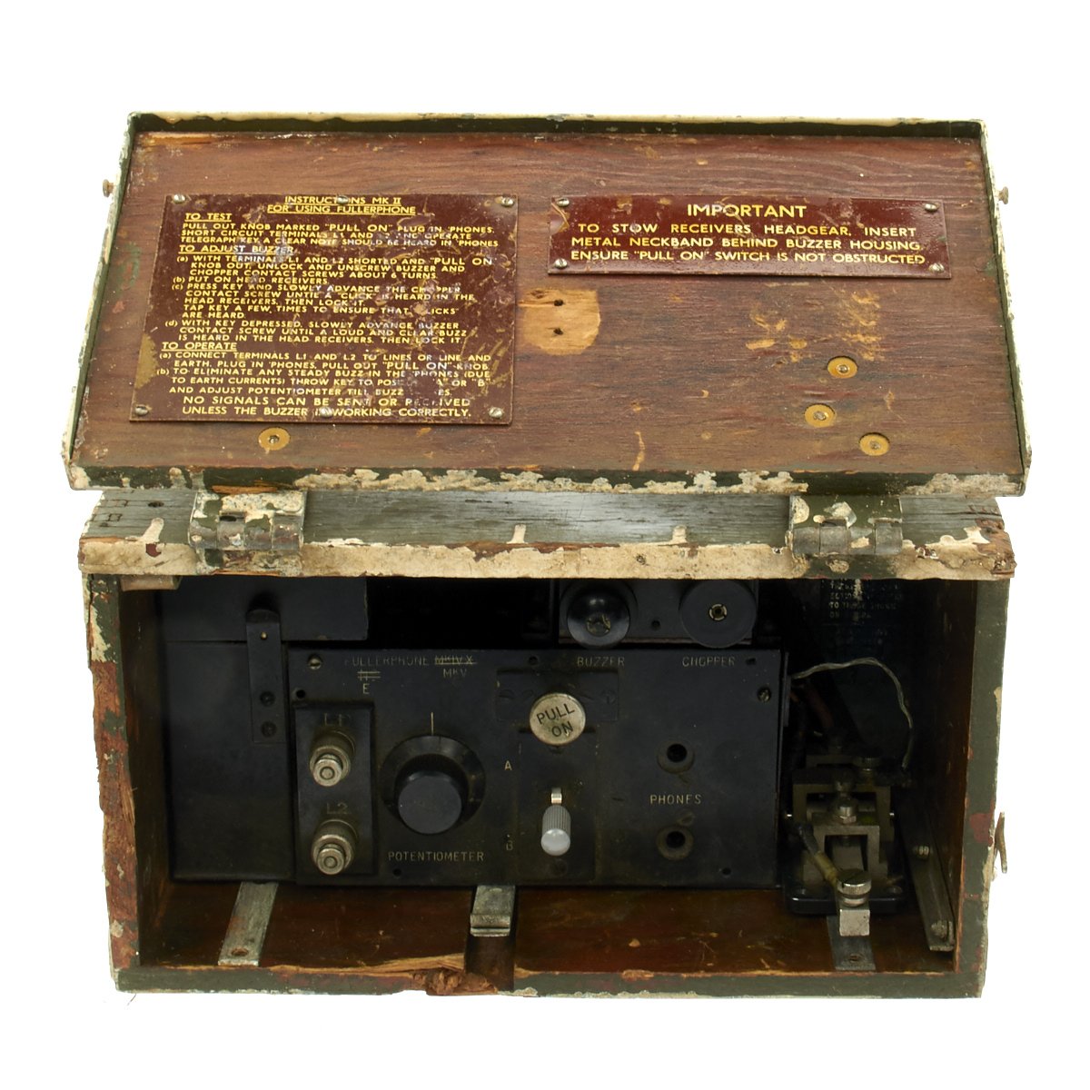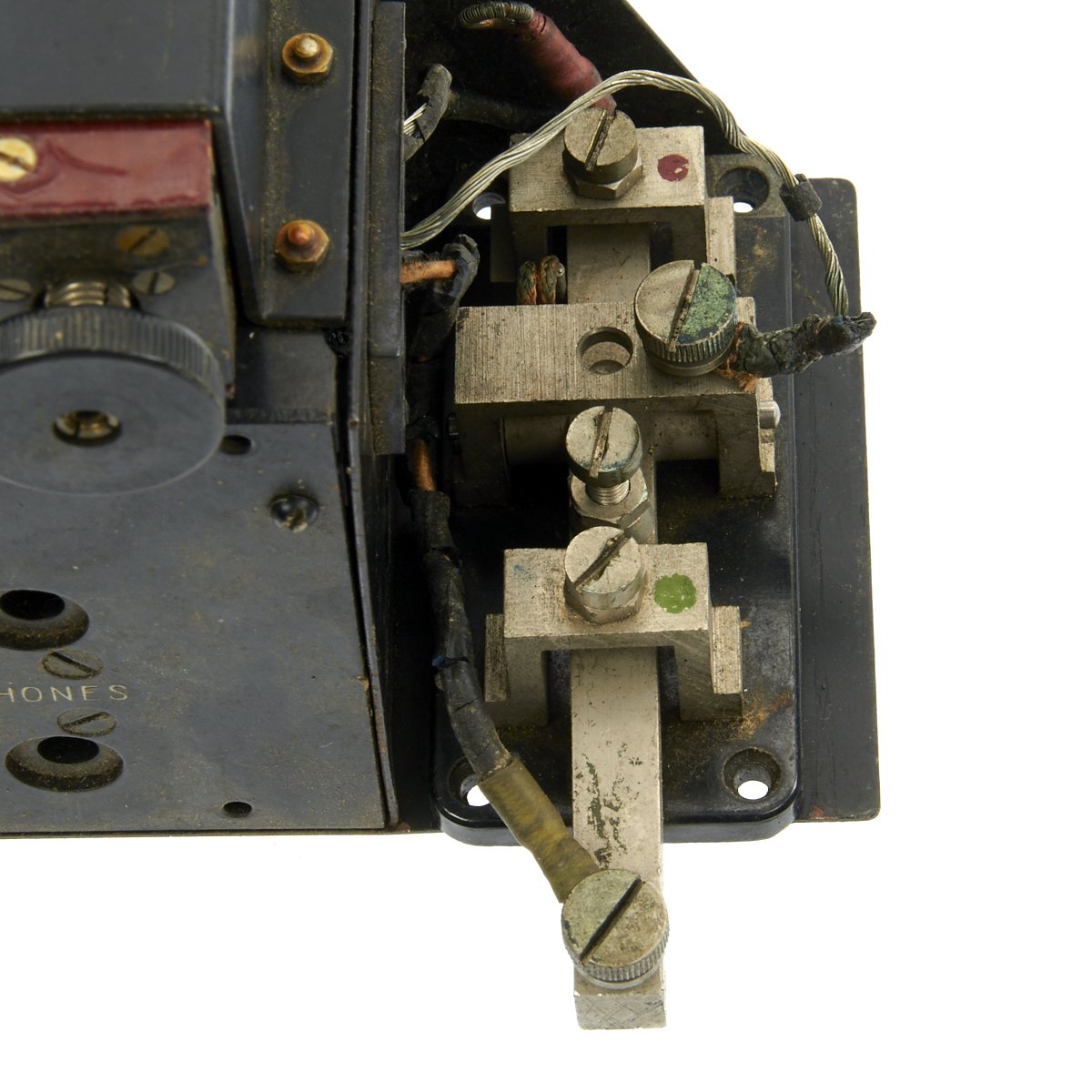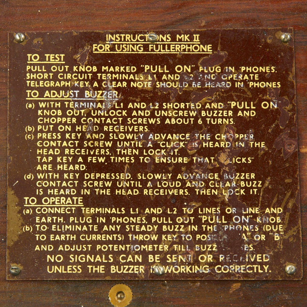 Original Item: Only One Available. This set consists of a key, battery, and buzzer. It was used for field communication over wires. It is based on the design originated in 1915 by A.C. Fuller. This design used Direct Current telegraph signals which were impossible for the enemy to intercept and decode. The design allowed much better security than the American and other 'buzzer sets' which sent code signals in the form of AC buzzing voltages. The fullerphone decodes the D.C. voltages by using an interrupter and handset or earphones.