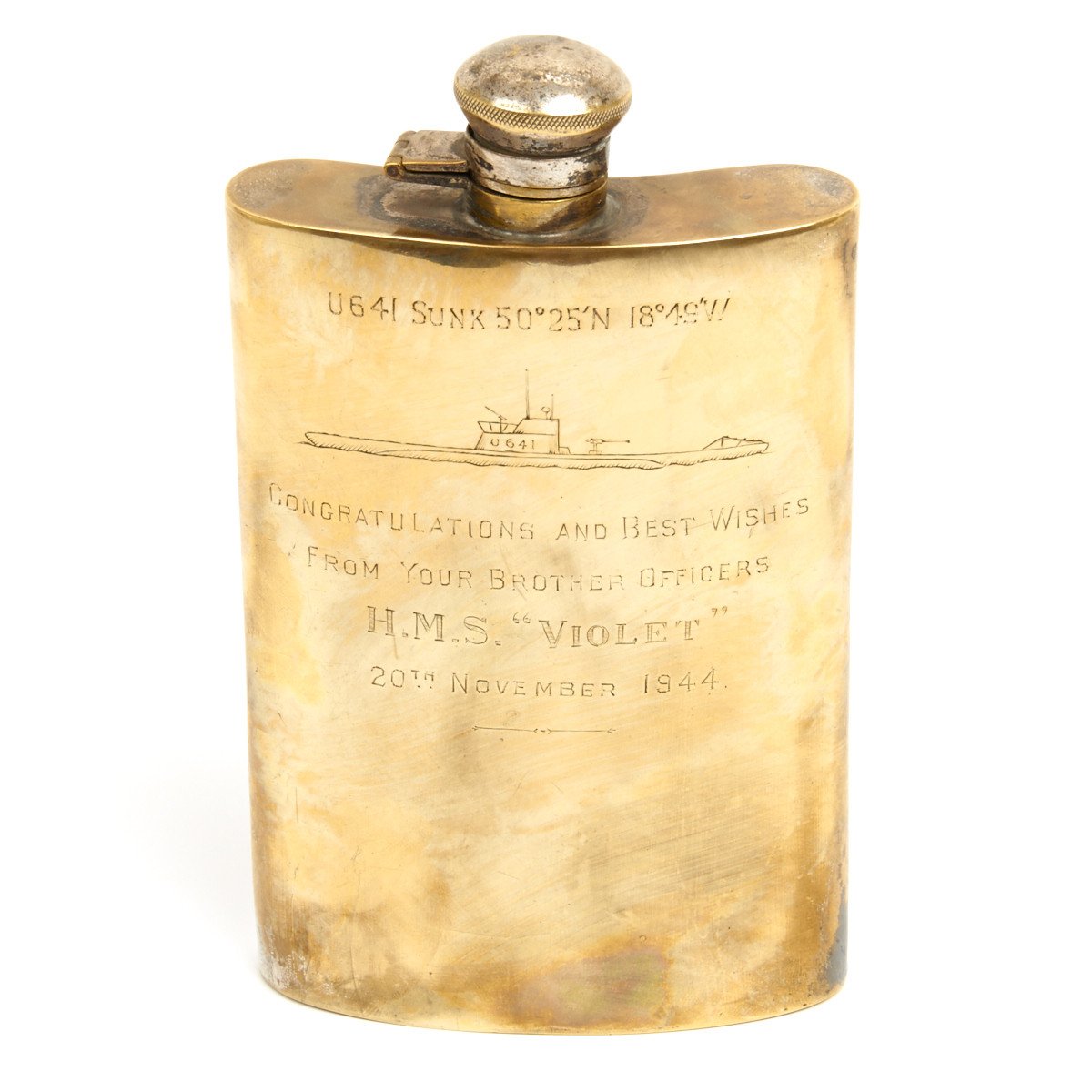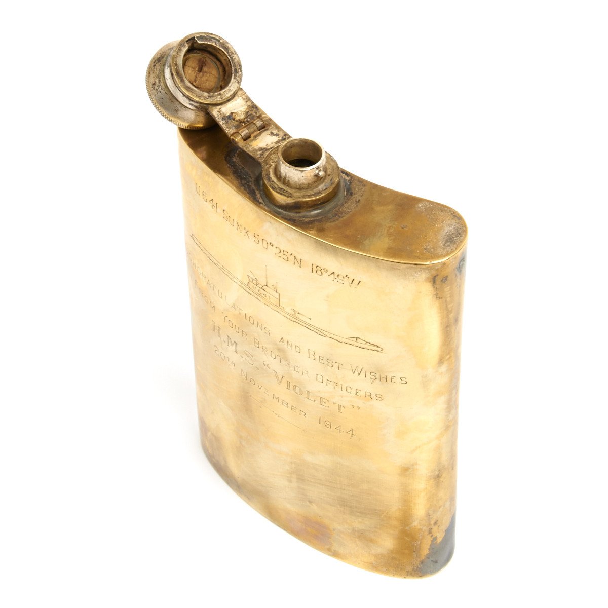 We do not know the name of the recipient of this flask but clearly he was a "brother" officer aboard the HMS Violet.