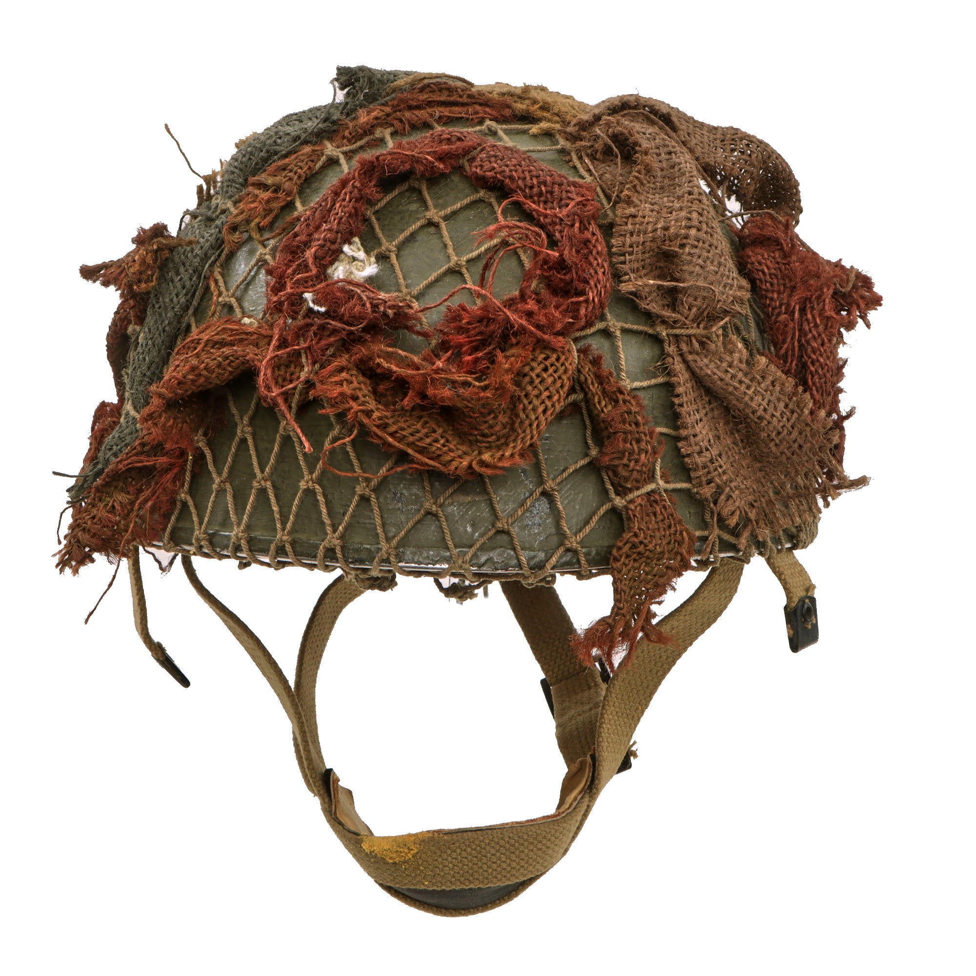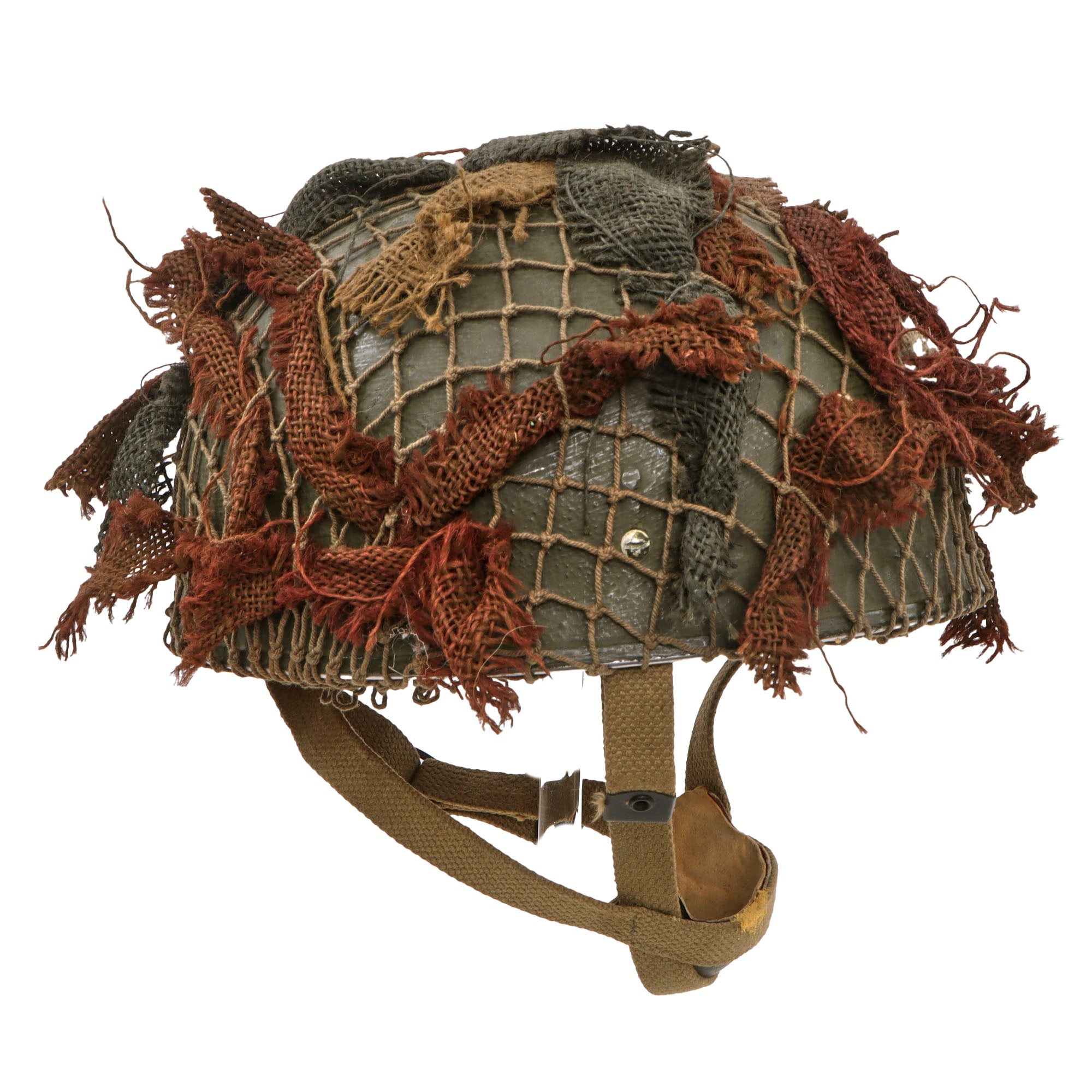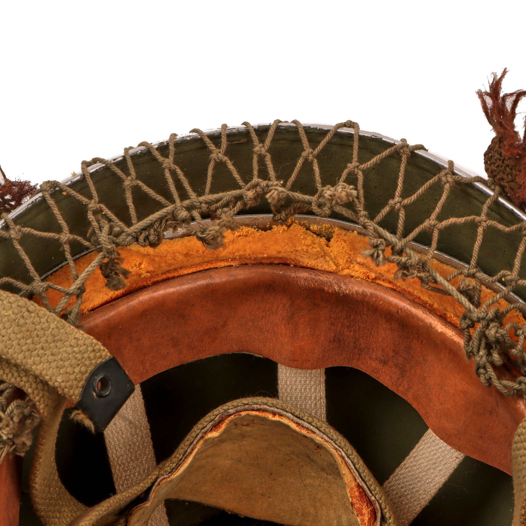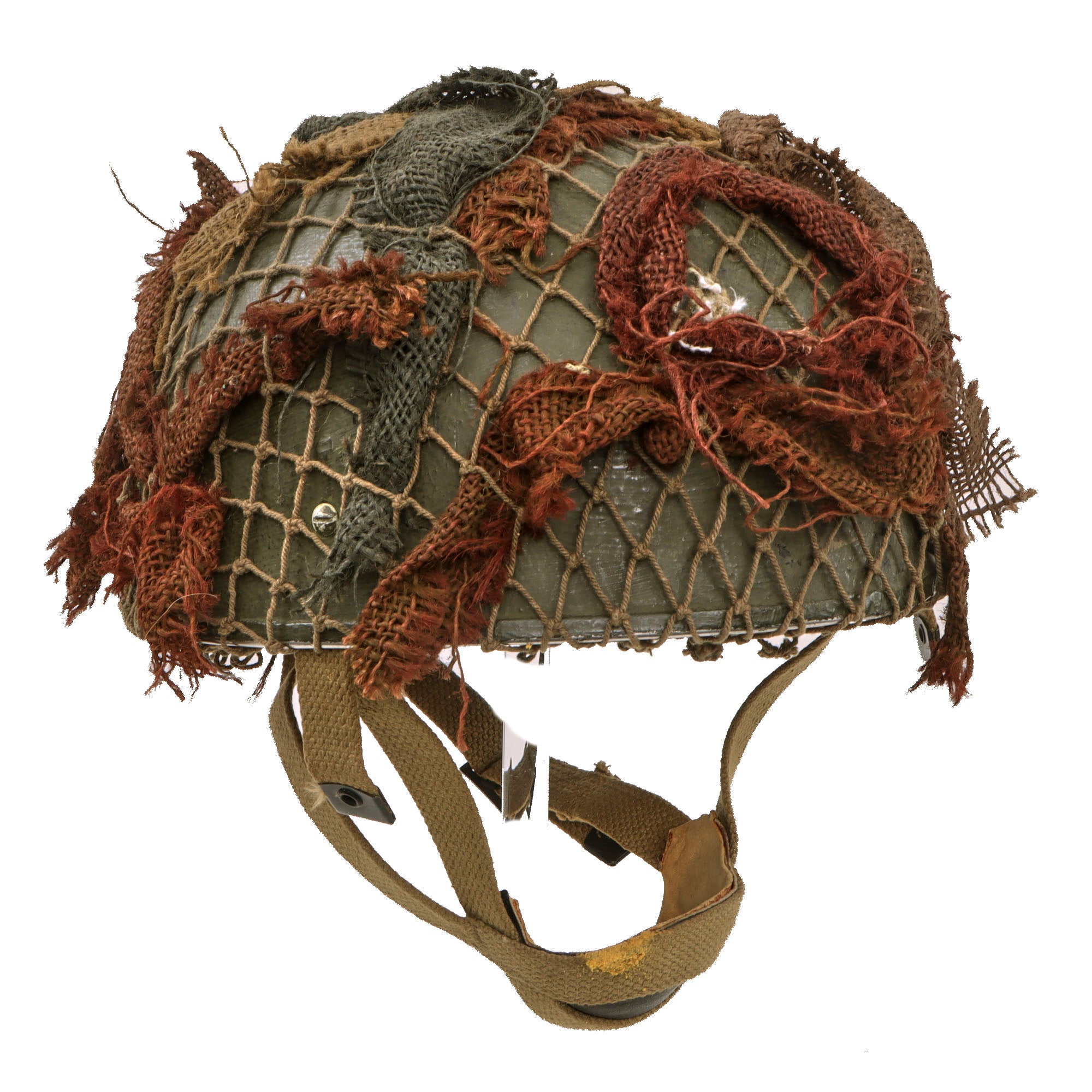 Original Item: Only One Available. Now this is a very nice restored example of the “Helmet, Steel, Airborne, Troops” HSAT MKII British Paratrooper helmet. The helmet has been expertly restored, with the liner and chinstrap both being modern reproductions. The helmet net and its scrim are also reproduction, added for display. The shell is original, but all other pieces are added.