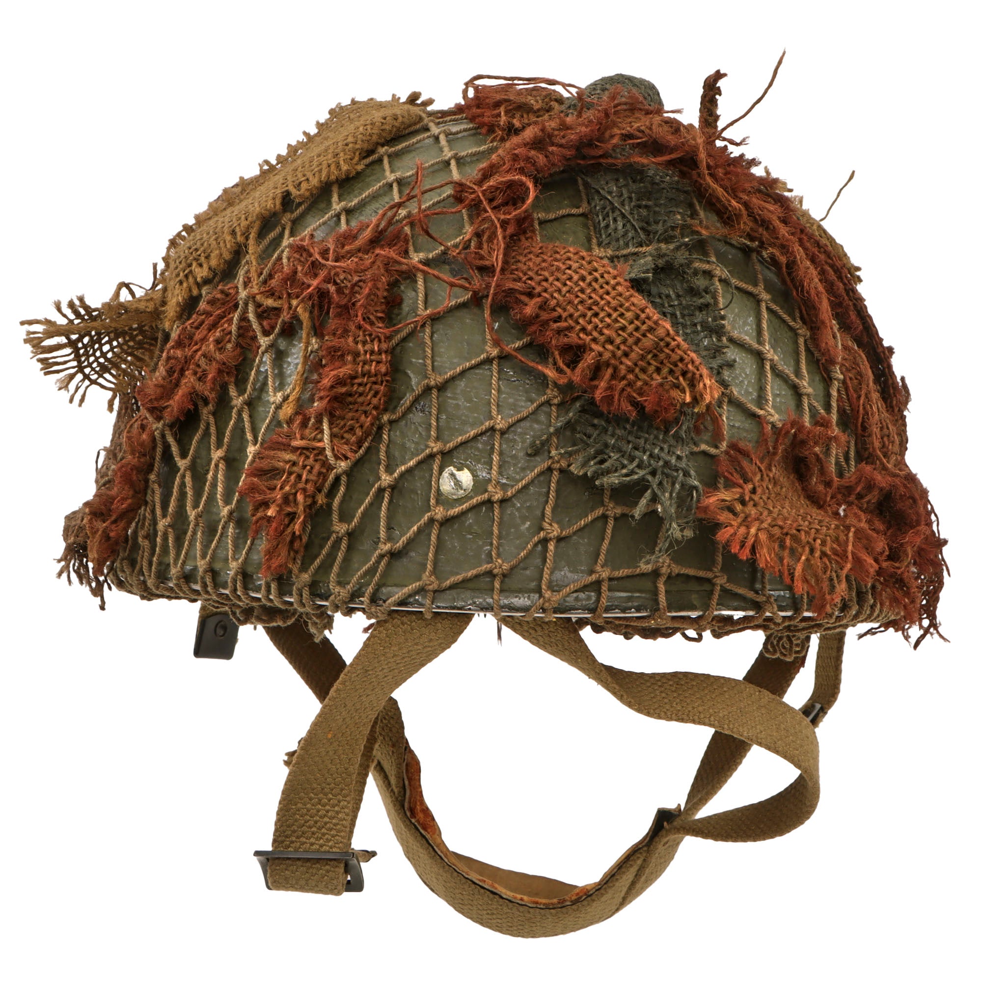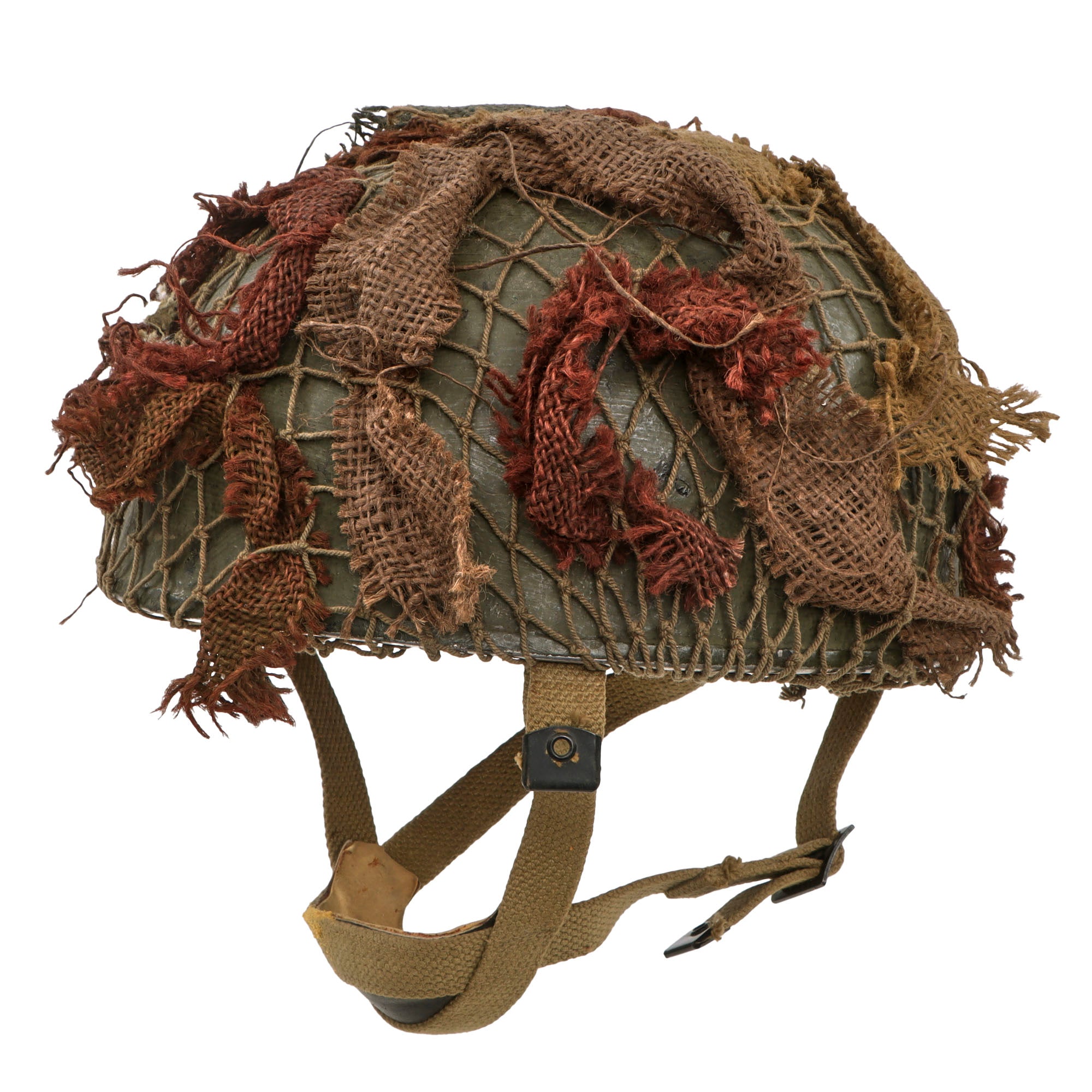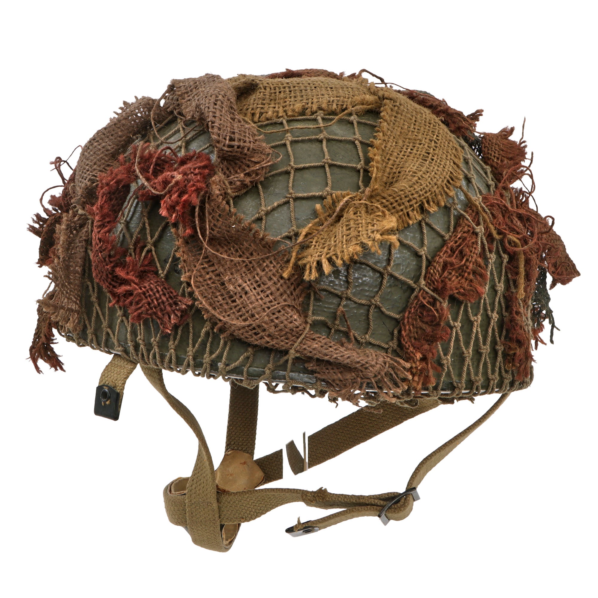 Original Item: Only One Available. Now this is a very nice restored example of the “Helmet, Steel, Airborne, Troops” HSAT MKII British Paratrooper helmet. The helmet has been expertly restored, with the liner and chinstrap both being modern reproductions. The helmet net and its scrim are also reproduction, added for display. The shell is original, but all other pieces are added.