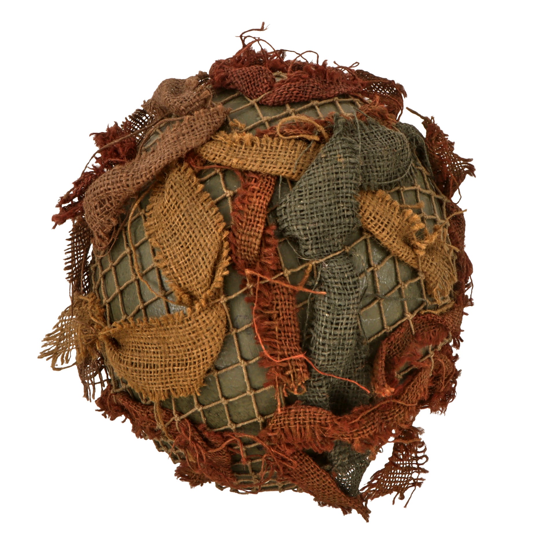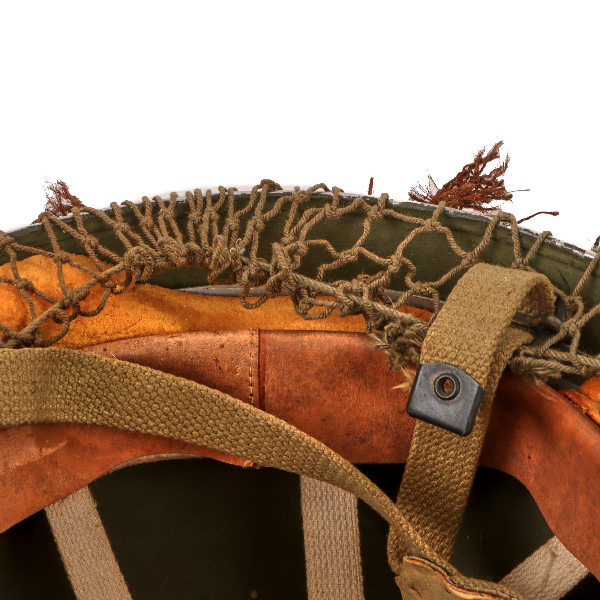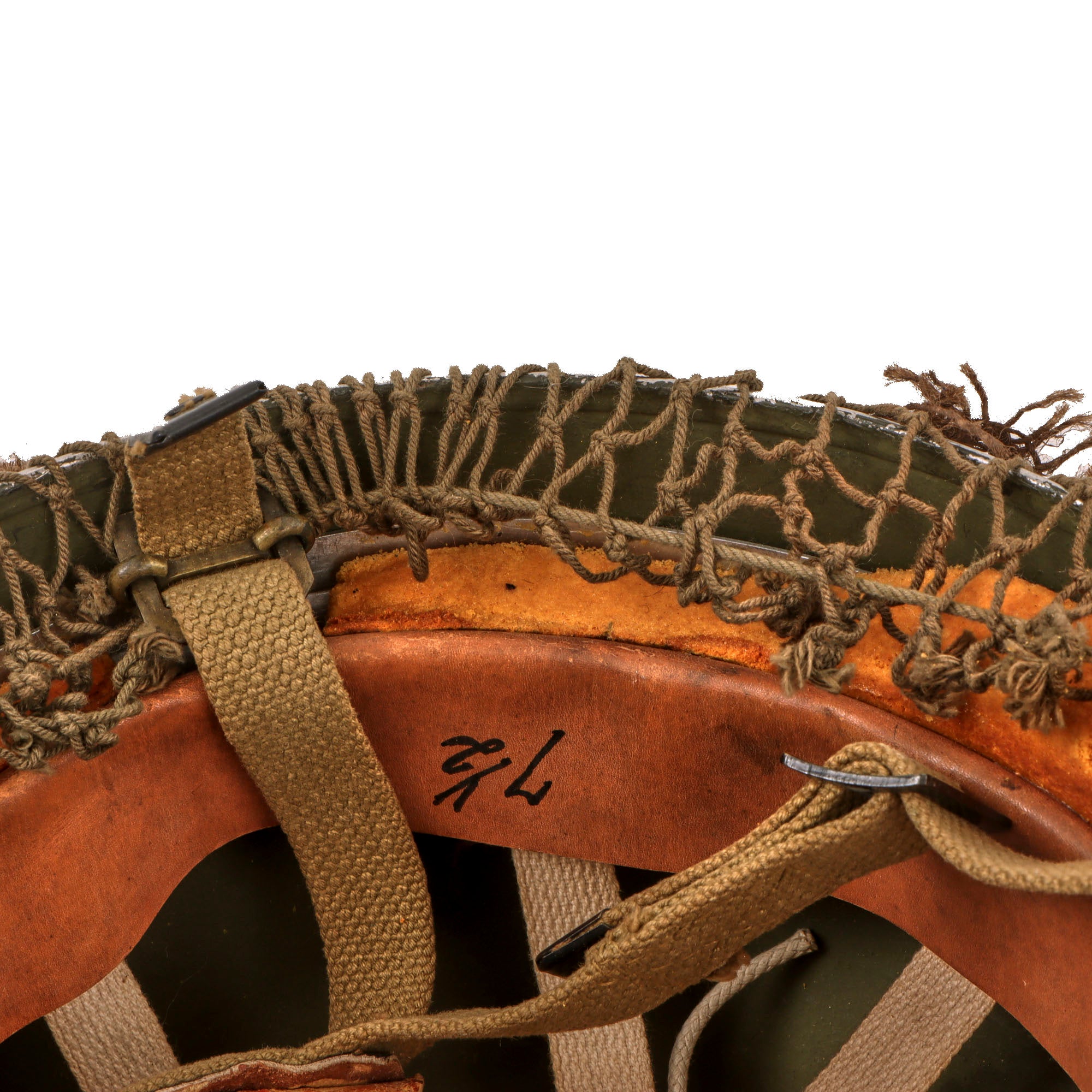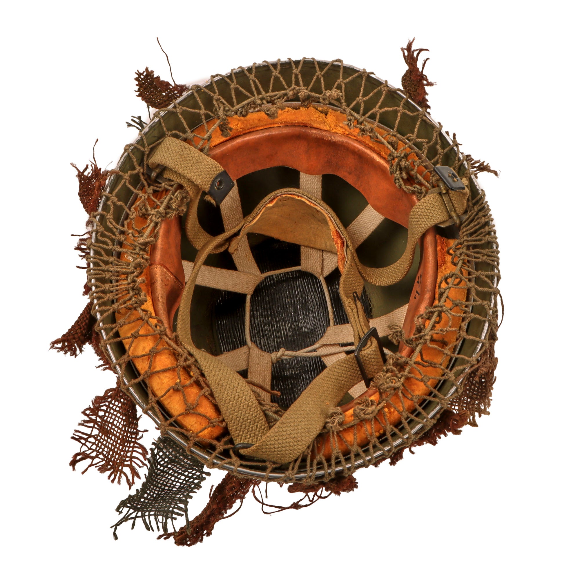 Original Item: Only One Available. Now this is a very nice restored example of the “Helmet, Steel, Airborne, Troops” HSAT MKII British Paratrooper helmet. The helmet has been expertly restored, with the liner and chinstrap both being modern reproductions. The helmet net and its scrim are also reproduction, added for display. The shell is original, but all other pieces are added.