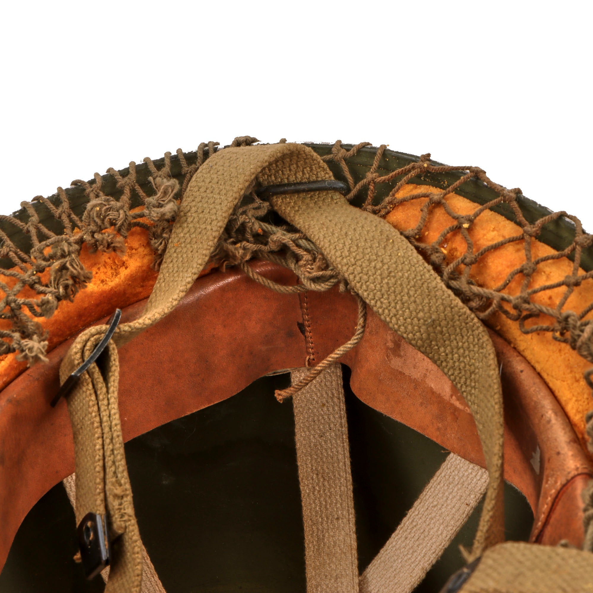 The next step in the evolution of the British helmet came in 1942. This helmet featured a similar shell design, but with a thick vulcanized fiber band rim that clearly distinguishes it from the German model, along with a four-point chinstrap system and a band of sorbo rubber for padding. These early helmets used leather chinstraps and are considered quite rare.
