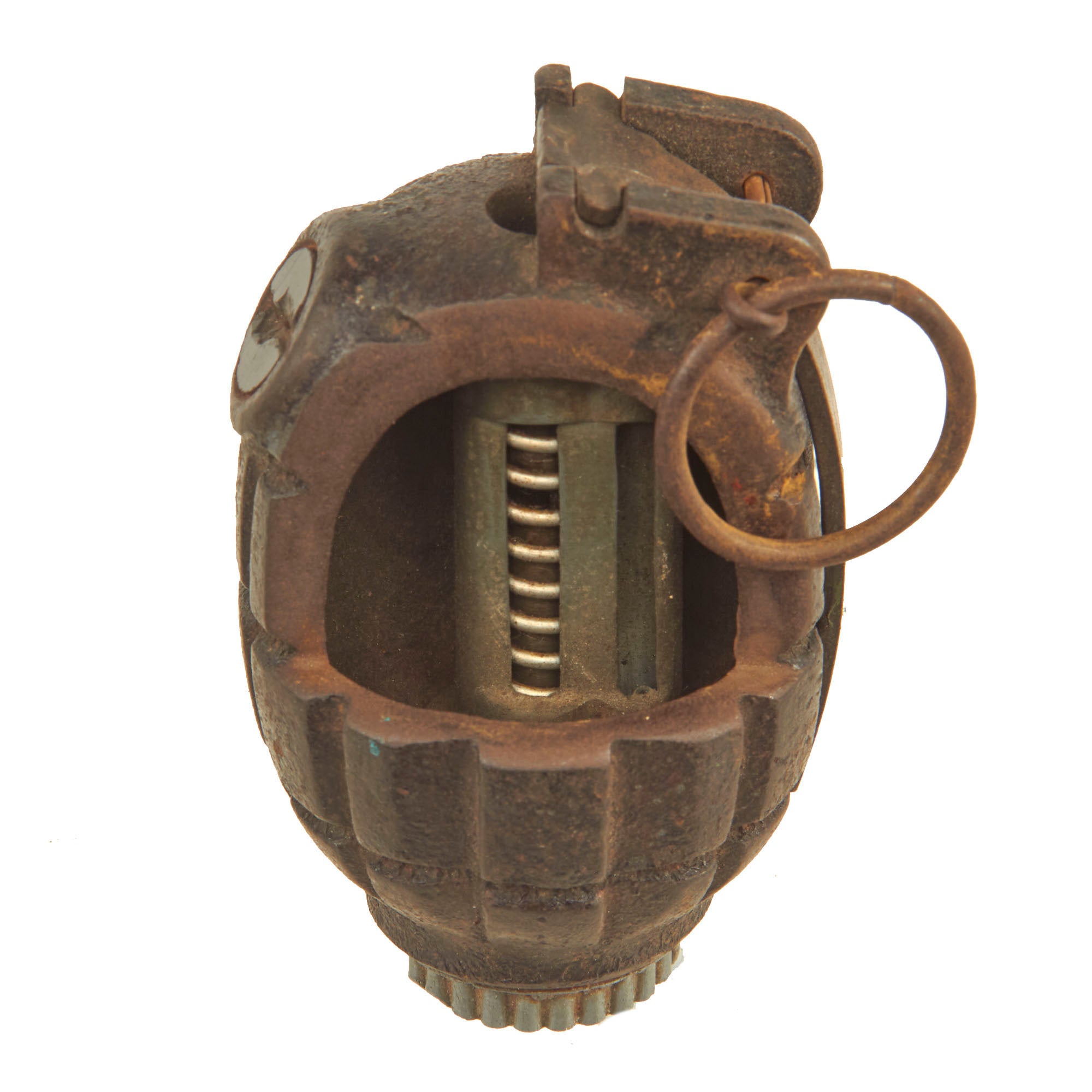 • Original Item: Only One Available. This is a very nice BATF approved totally inert example of a 1941 dated No. 36M MkI Grenade. The No. 36M was the British army's standard hand-grenade during WWII, and long afterwards. This wonderful example is complete with internal parts (no explosives!) and no original paint. The grenade appears to have been excavated and extensively cleaned to remove most of the rust.