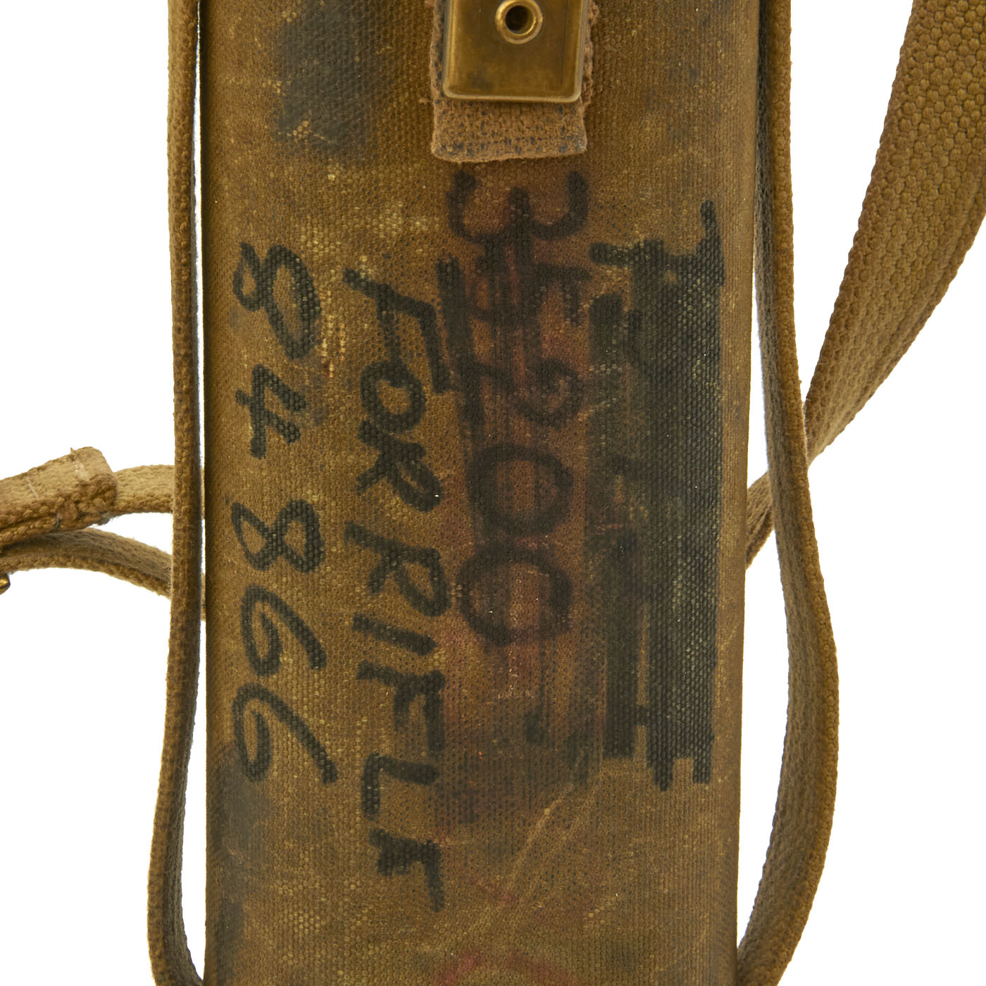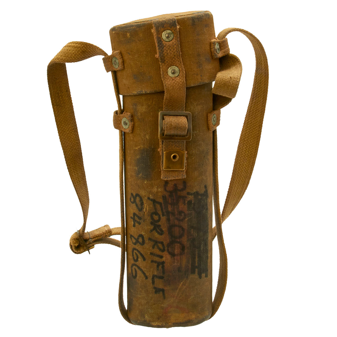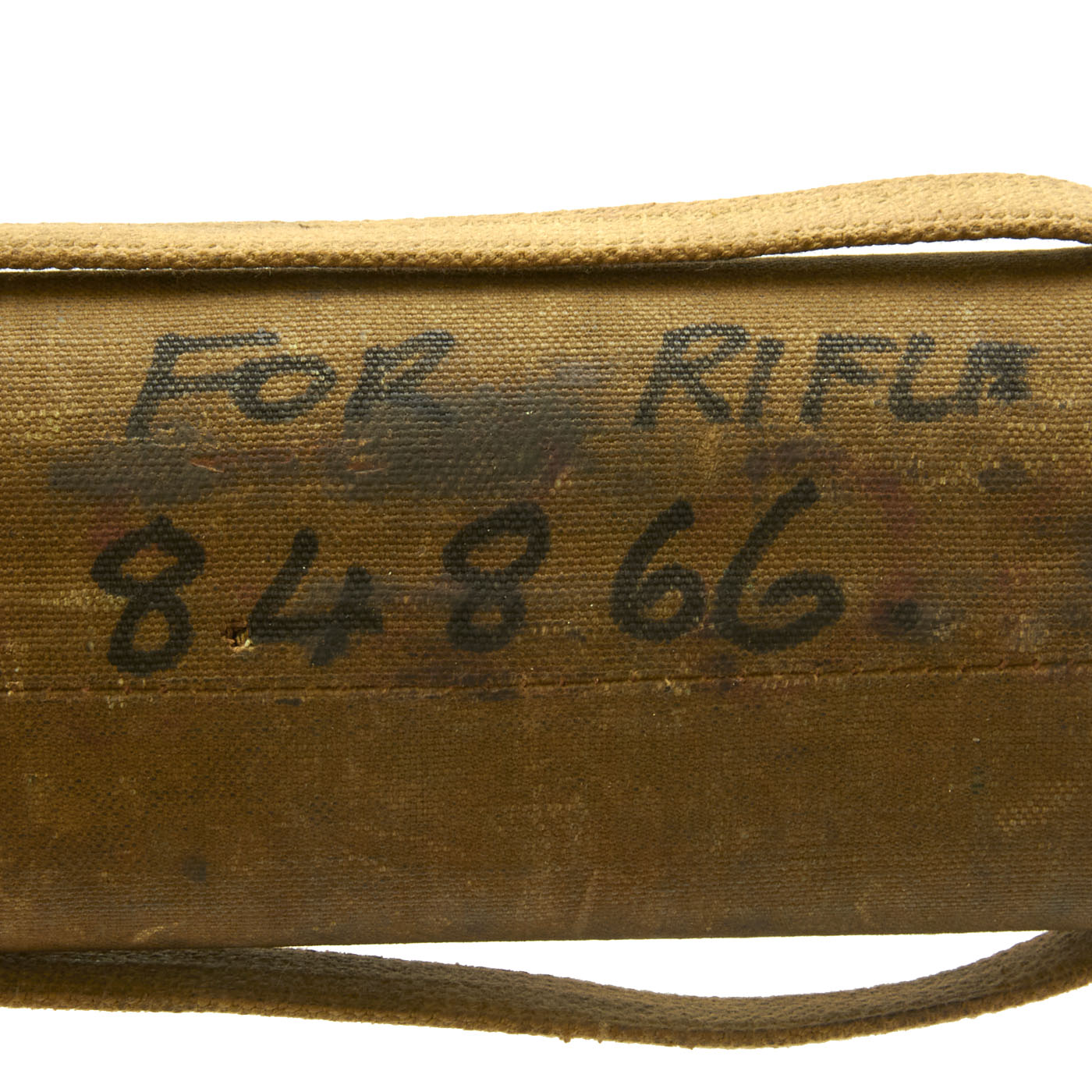 This case shows signs of being heavily used, but is without damage. There's multiple areas with handwriting on it, some crossed out with others rewritten. The main writing featured on the case appears to be a possible serial number for a rifle in which the case was used with. The writing is: “FOR RIFLE / 84866”. It is written on both the front and back. This hard canvas case appears to be complete. There is staining throughout and some verdigris on the fittings and rivets. The straps are without damage and the inner leather pieces are still present and without damage. If you have yourself a loose scope for your Enfield, then this is the perfect match!