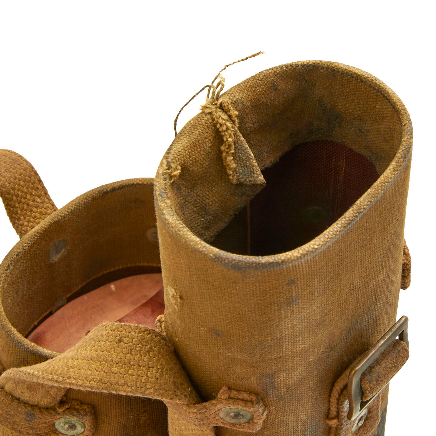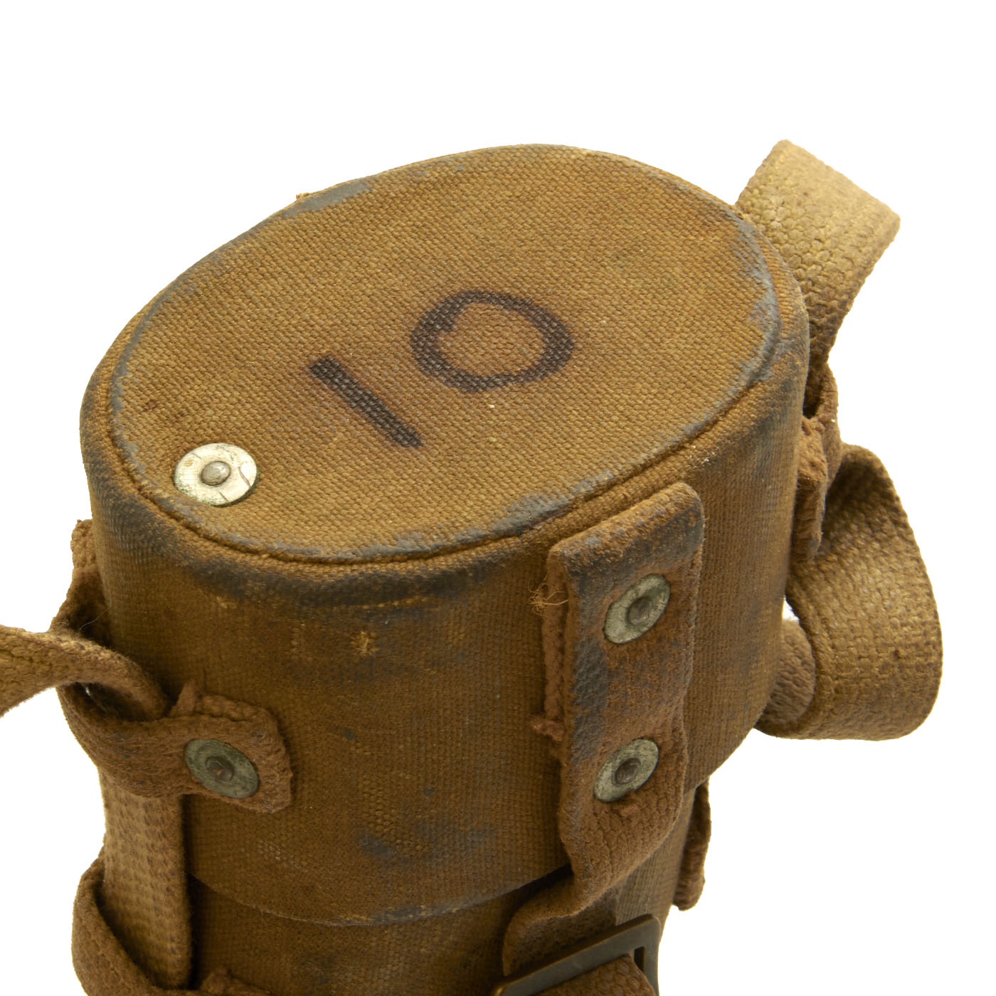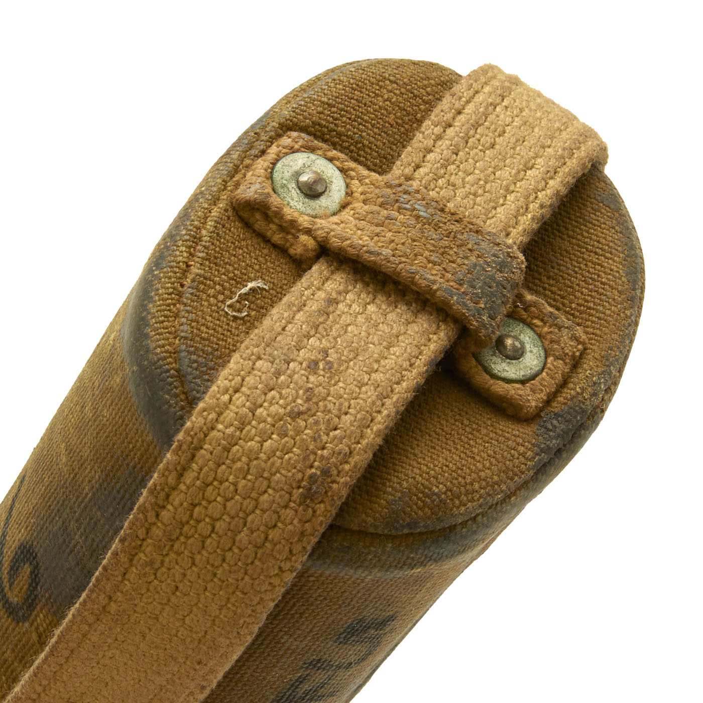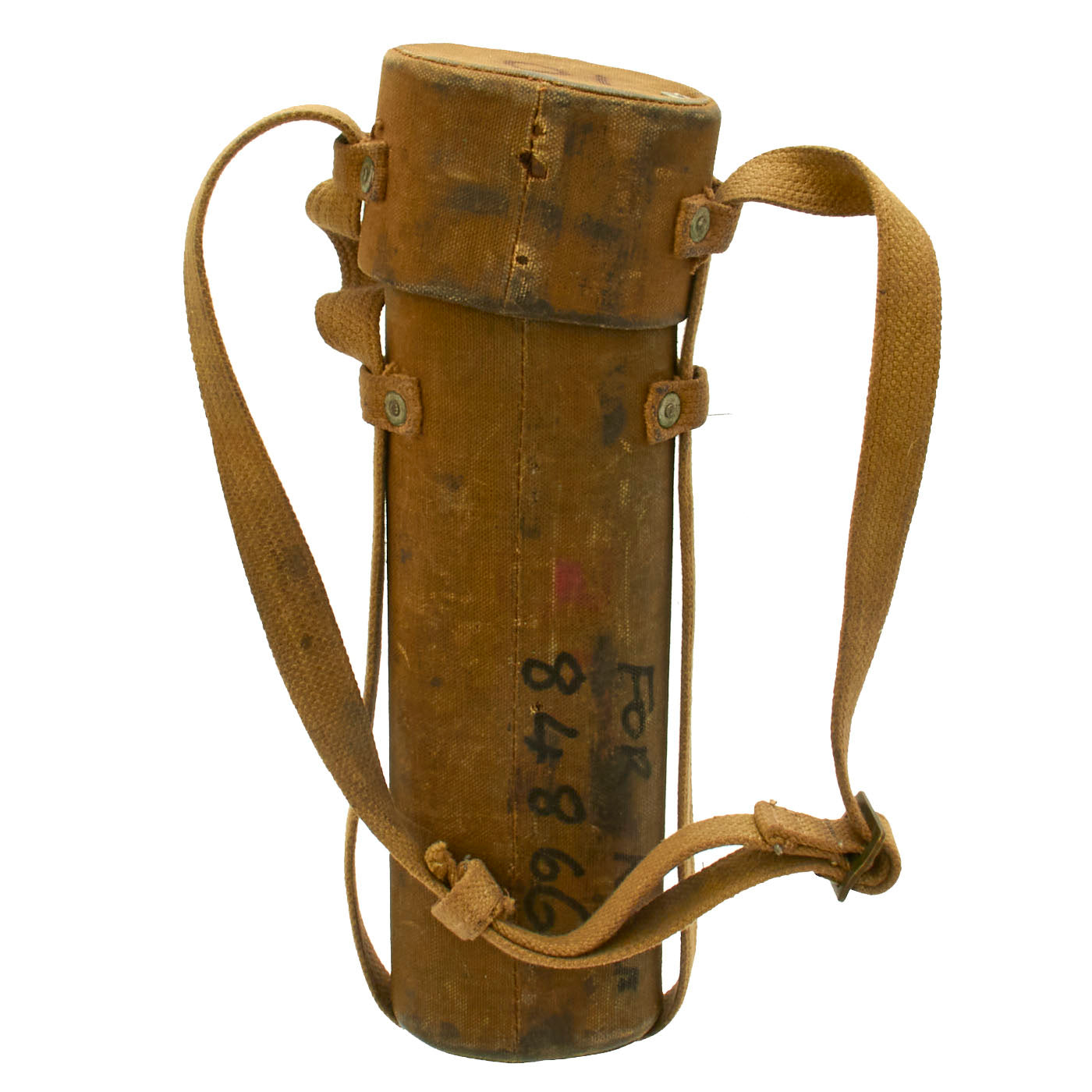This case shows signs of being heavily used, but is without damage. There's multiple areas with handwriting on it, some crossed out with others rewritten. The main writing featured on the case appears to be a possible serial number for a rifle in which the case was used with. The writing is: “FOR RIFLE / 84866”. It is written on both the front and back. This hard canvas case appears to be complete. There is staining throughout and some verdigris on the fittings and rivets. The straps are without damage and the inner leather pieces are still present and without damage. If you have yourself a loose scope for your Enfield, then this is the perfect match!