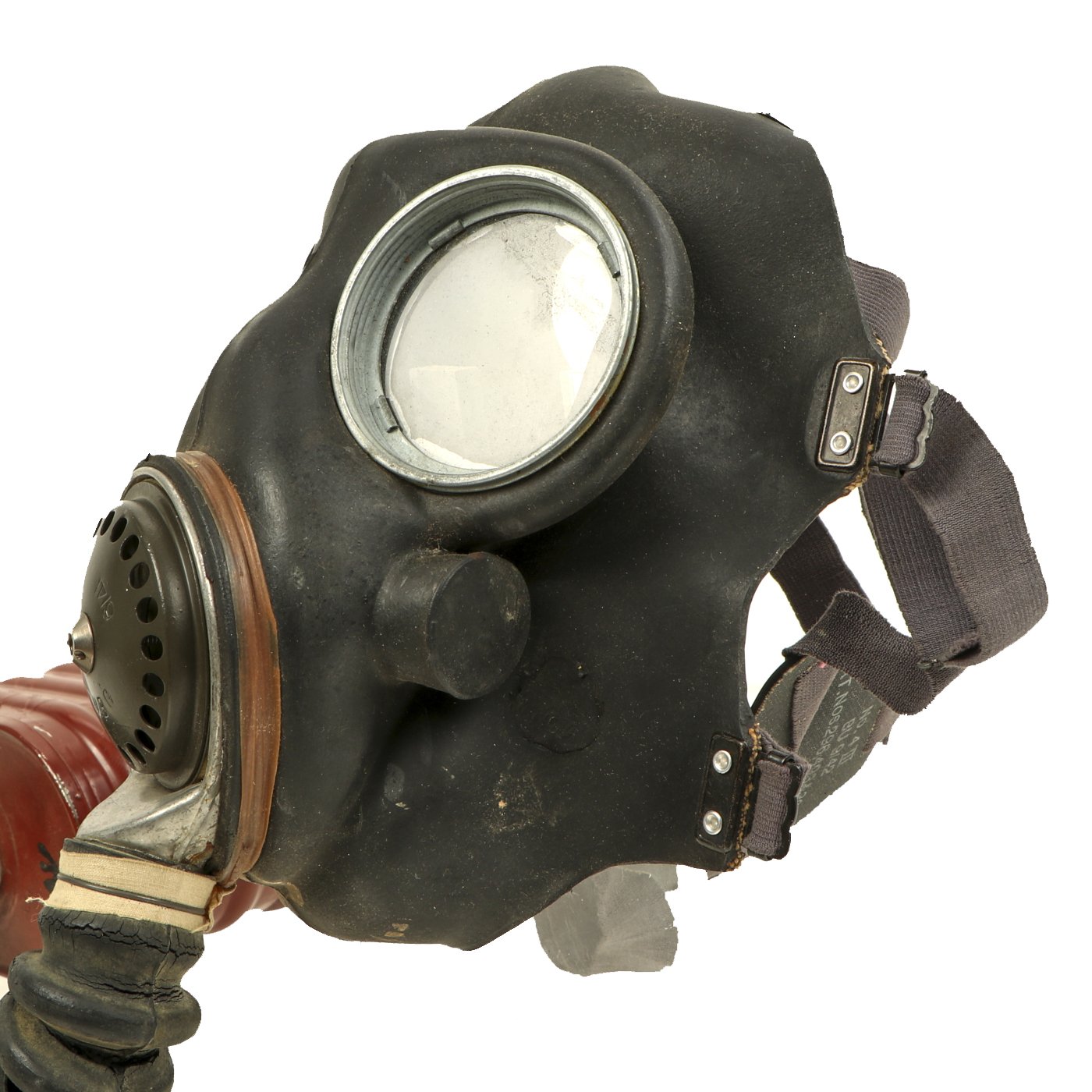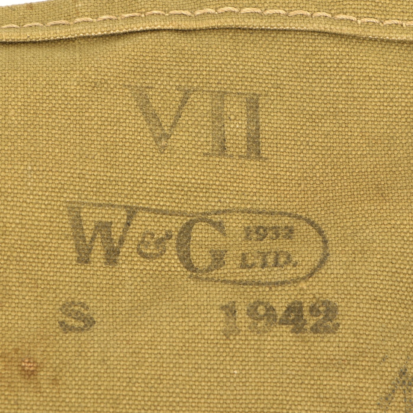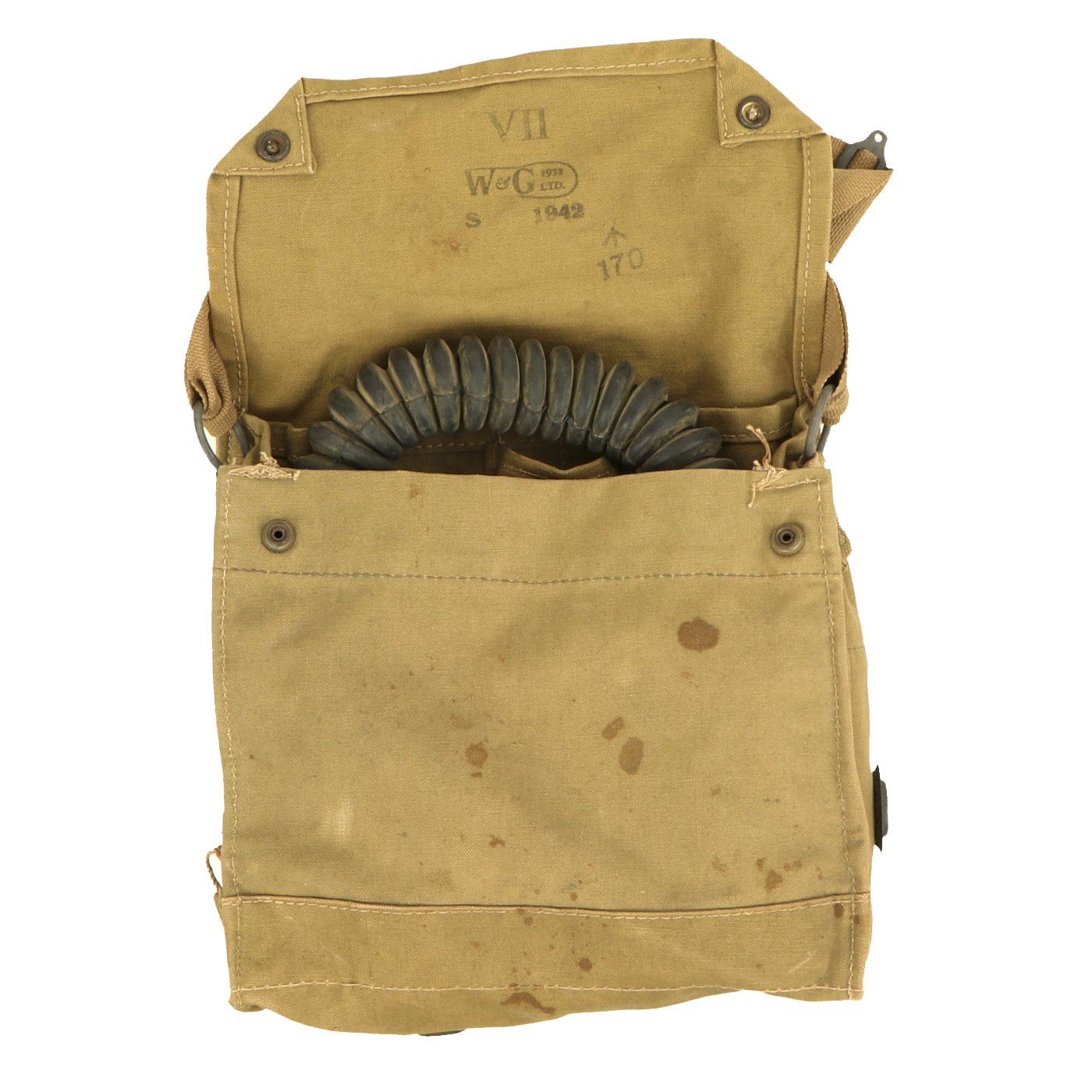 Original Item: Only One Available. This is an excellent condition British MKV GSR gas mask with hose and filter. All are in excellent condition and the mask has nice pliable rubber. The MKVII haversack with maker marking W&G Ltd and 1942 date! They don't come any nice than this!