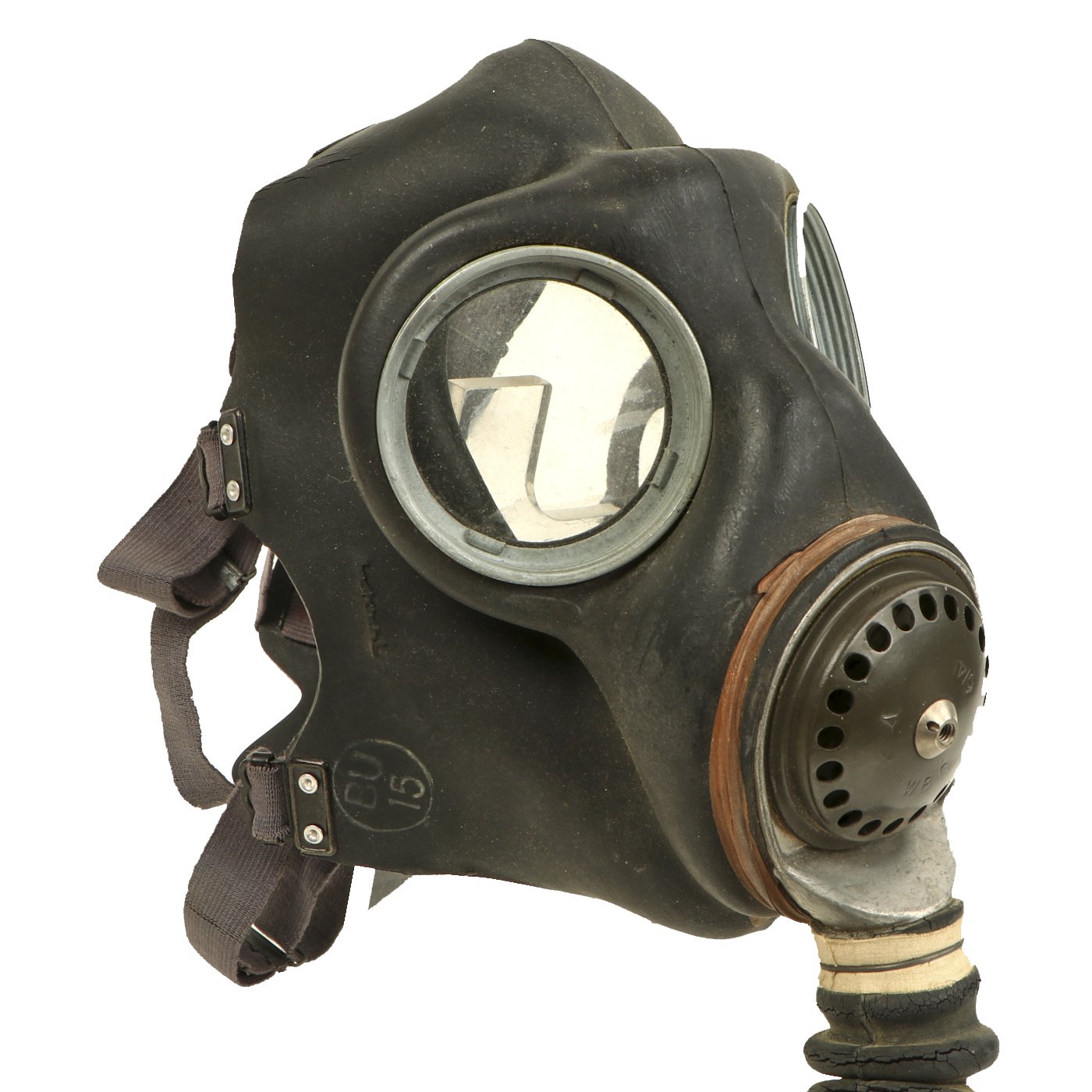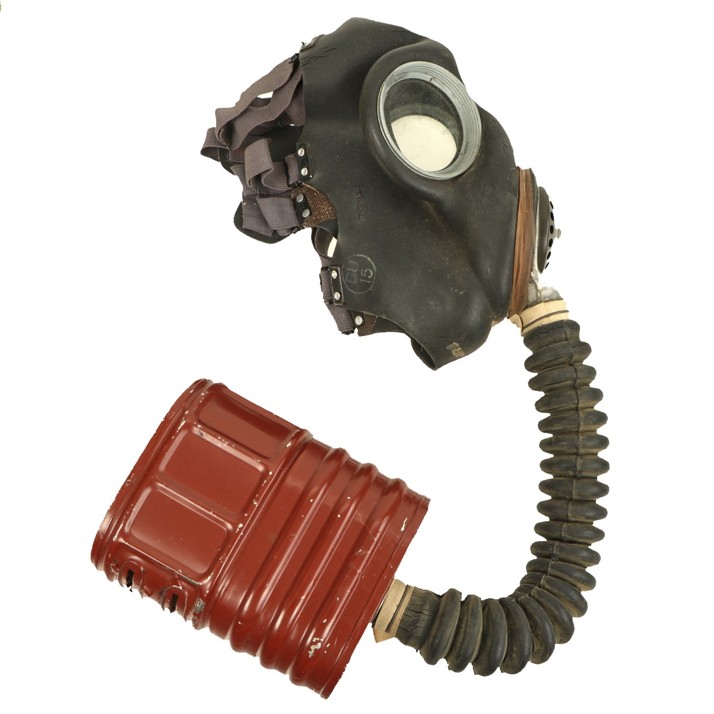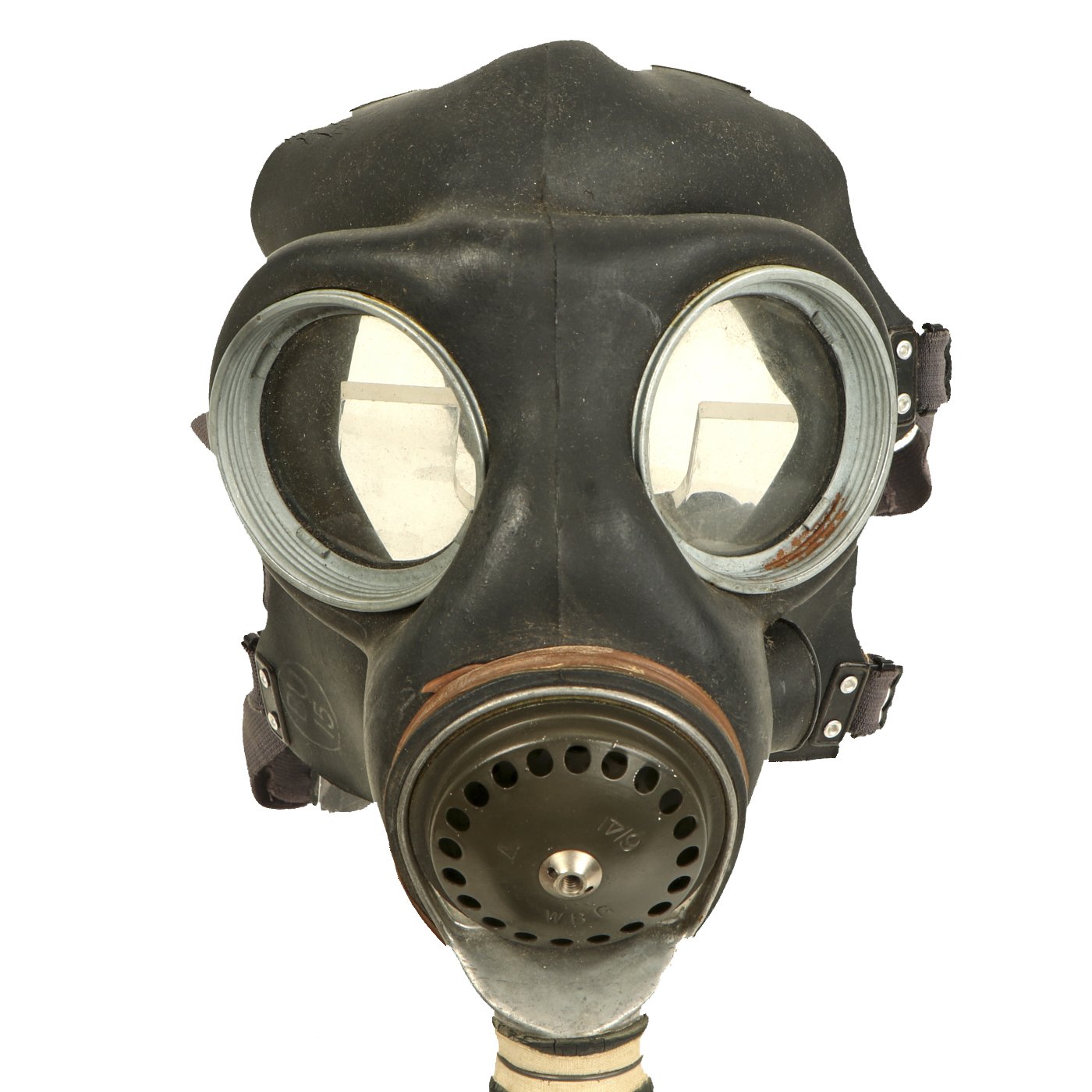 Original Item: Only One Available. This is an excellent condition British MKV GSR gas mask with hose and filter. All are in excellent condition and the mask has nice pliable rubber. The MKVII haversack with maker marking W&G Ltd and 1942 date! They don't come any nice than this!