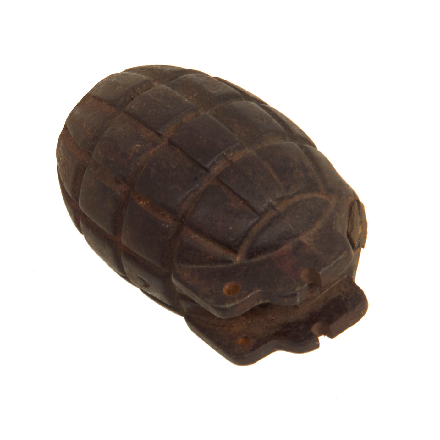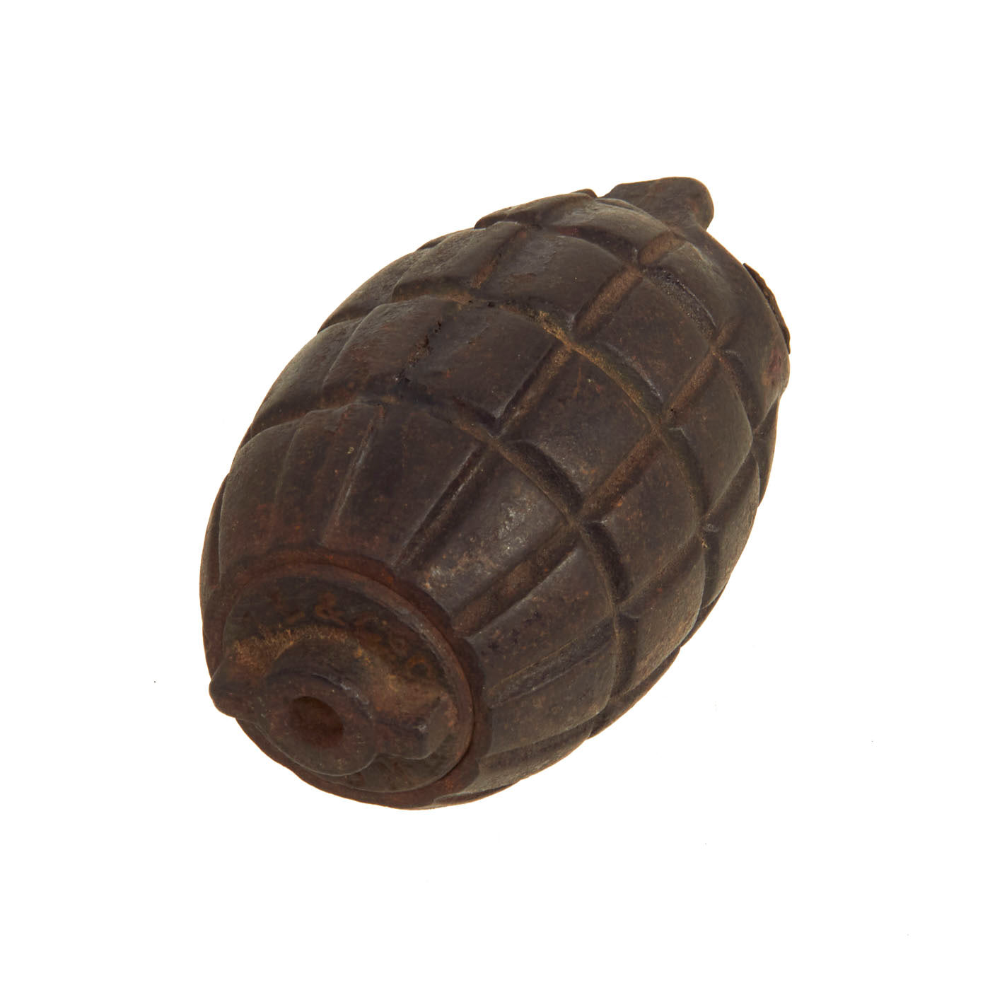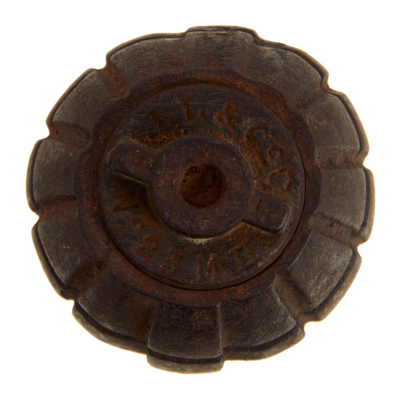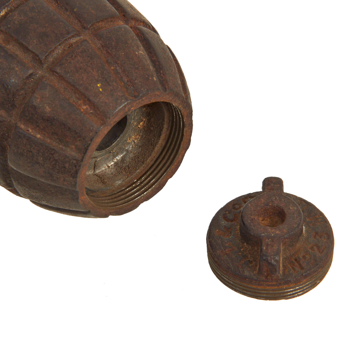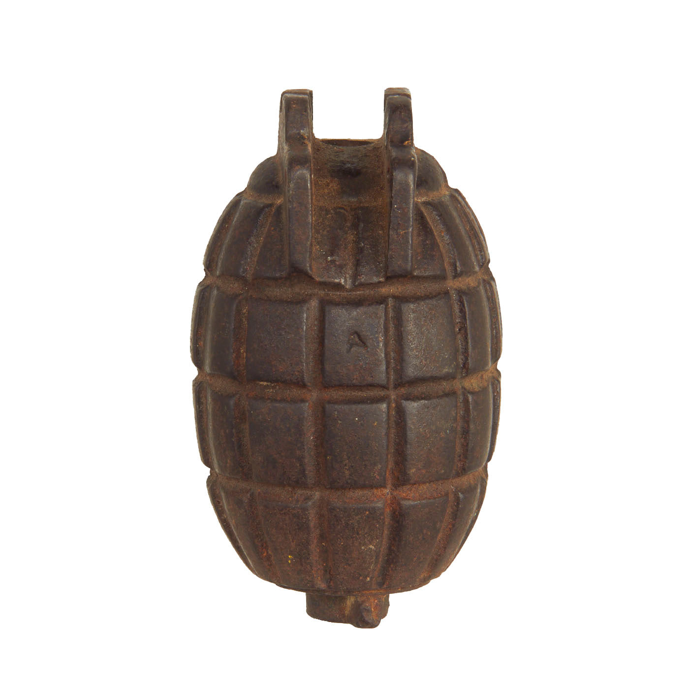The body of the grenade is marked A. We have unfortunately not been able to find any information on this maker. The cap on the bottom reads: