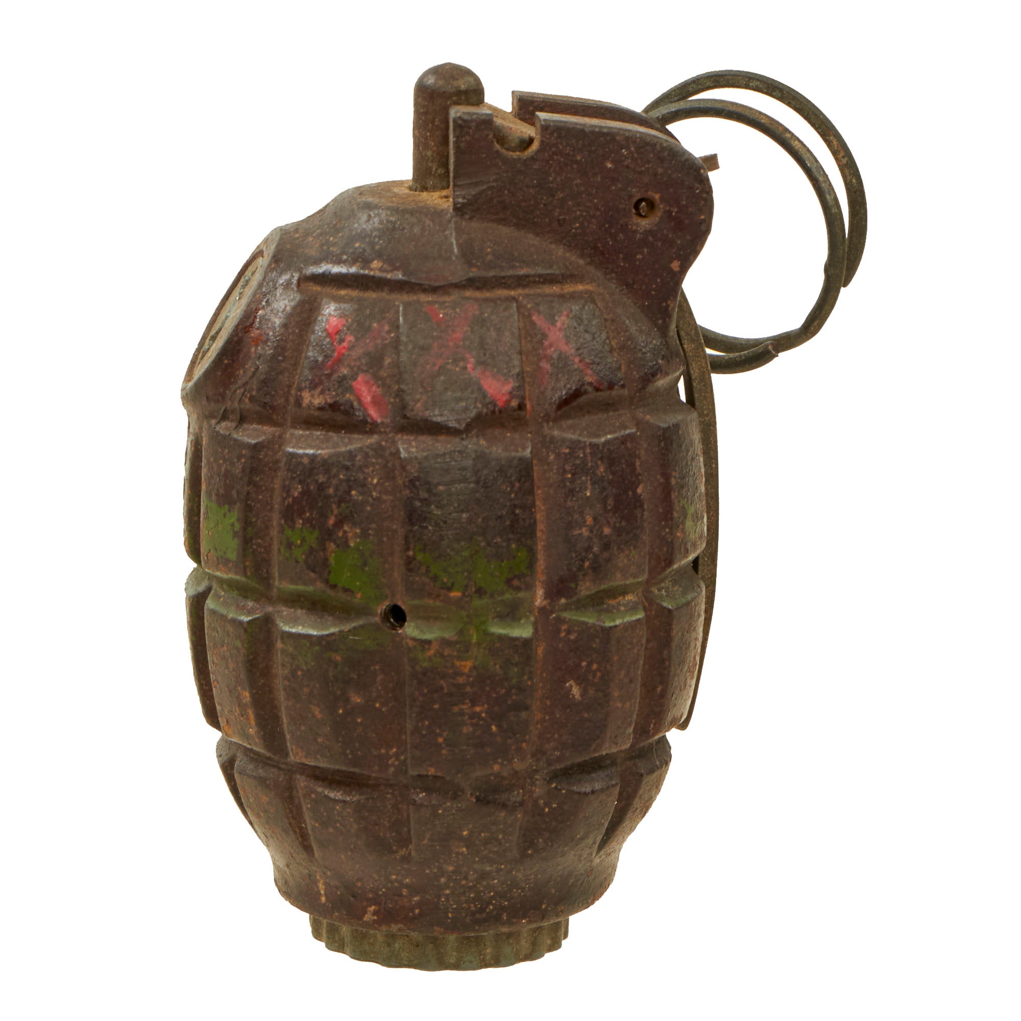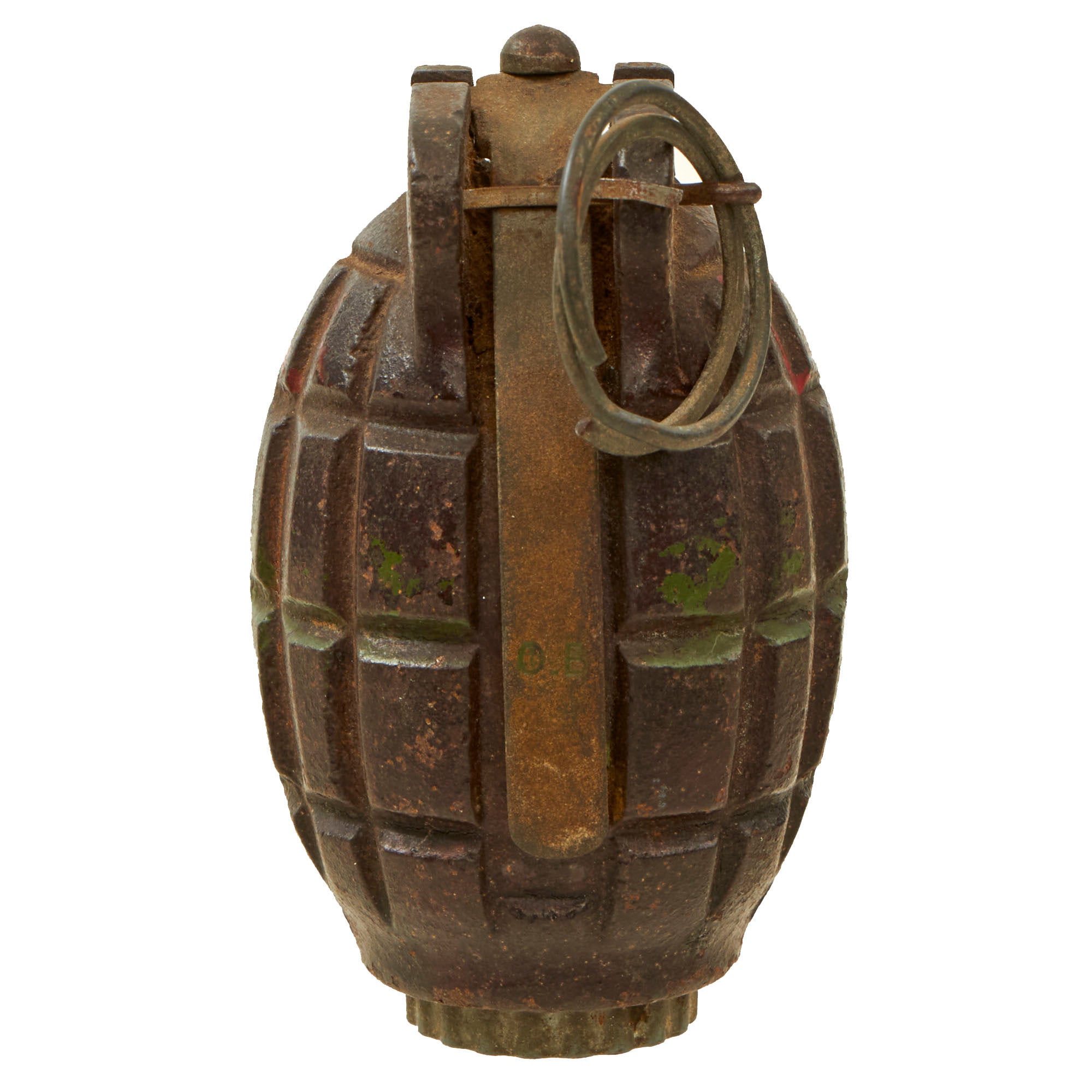 Original Item: Only One Available. This is an excellent totally inert example of a 1944-dated No. 36M MkI Grenade known as the "Mesopotamian" variant due to its shellac-coating which was designed to keep moisture and humidity out of the detonator's fuse. The No. 36M MkI was the British army's standard hand-grenade during WWII. This wonderful example is complete with internal parts (no explosives!) and original paint, including the three red Xs along the side which indicate that it is the waterproofed No.36M model. The cap on the bottom reads:
