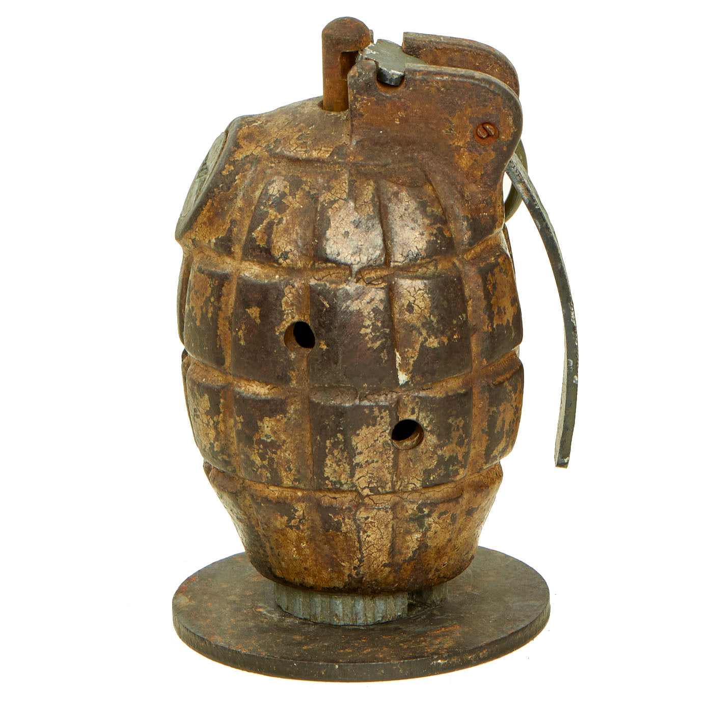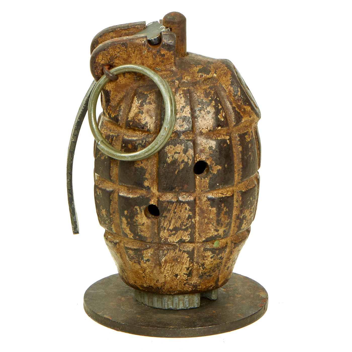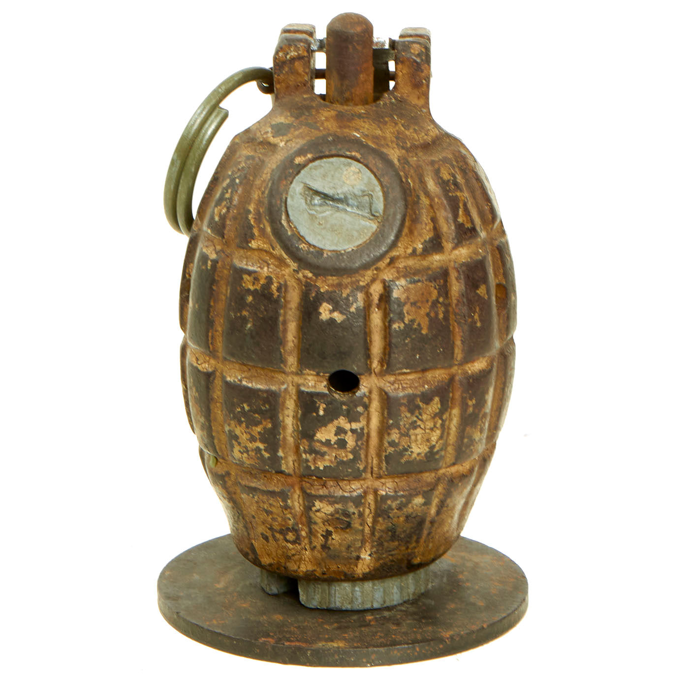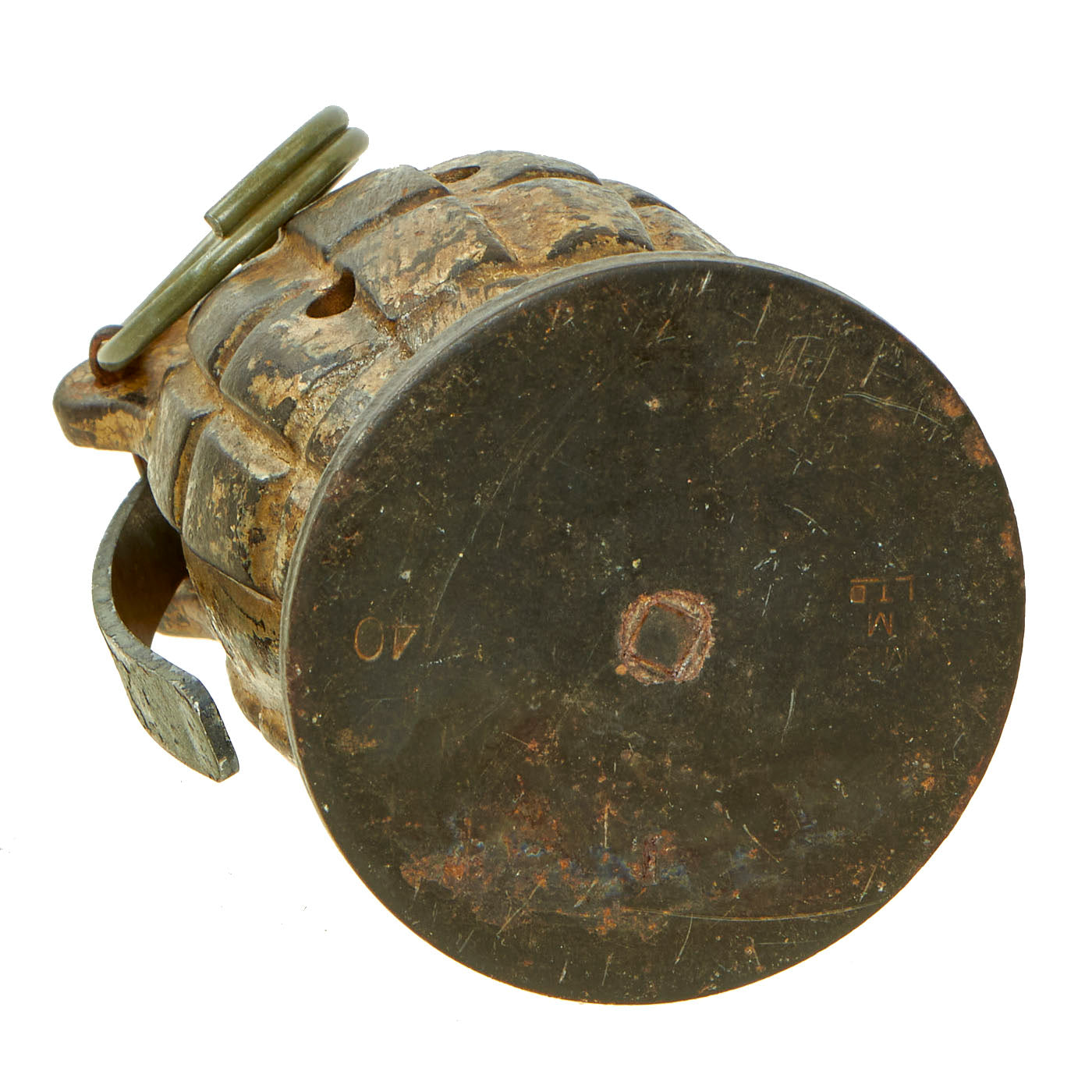 Original Item: Only One Available. This is a very nice BATF approved totally inert example of a 1940 dated No. 36M MkI Grenade. The No. 36M was the British army's standard hand-grenade during WWII, and long afterwards. This wonderful example is complete with internal parts (no explosives!) and some of the original paint. It has a good amount of what appears to be desert camouflage tan paint retained on the body.