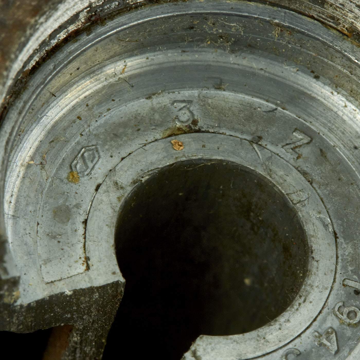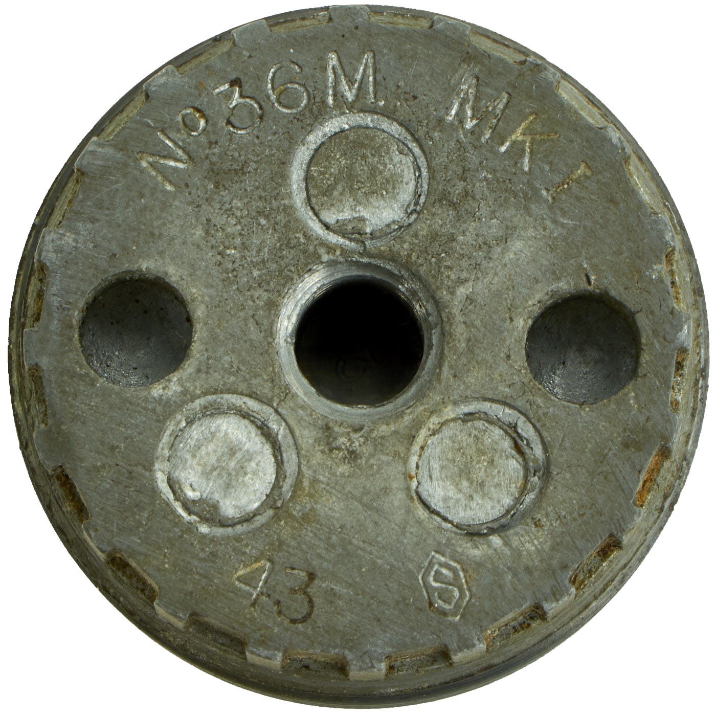 The bottom plug was not cut through, and reads No. 36M MkI, with a 43 date on the other side. The hole is correctly threaded for the attachment of a base plate, which would allow it to be used with a rifle mounted grenade discharger. A great display piece from WWII!
