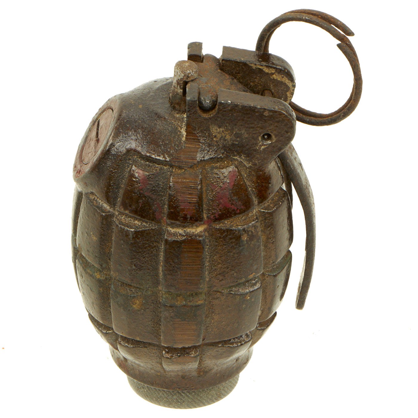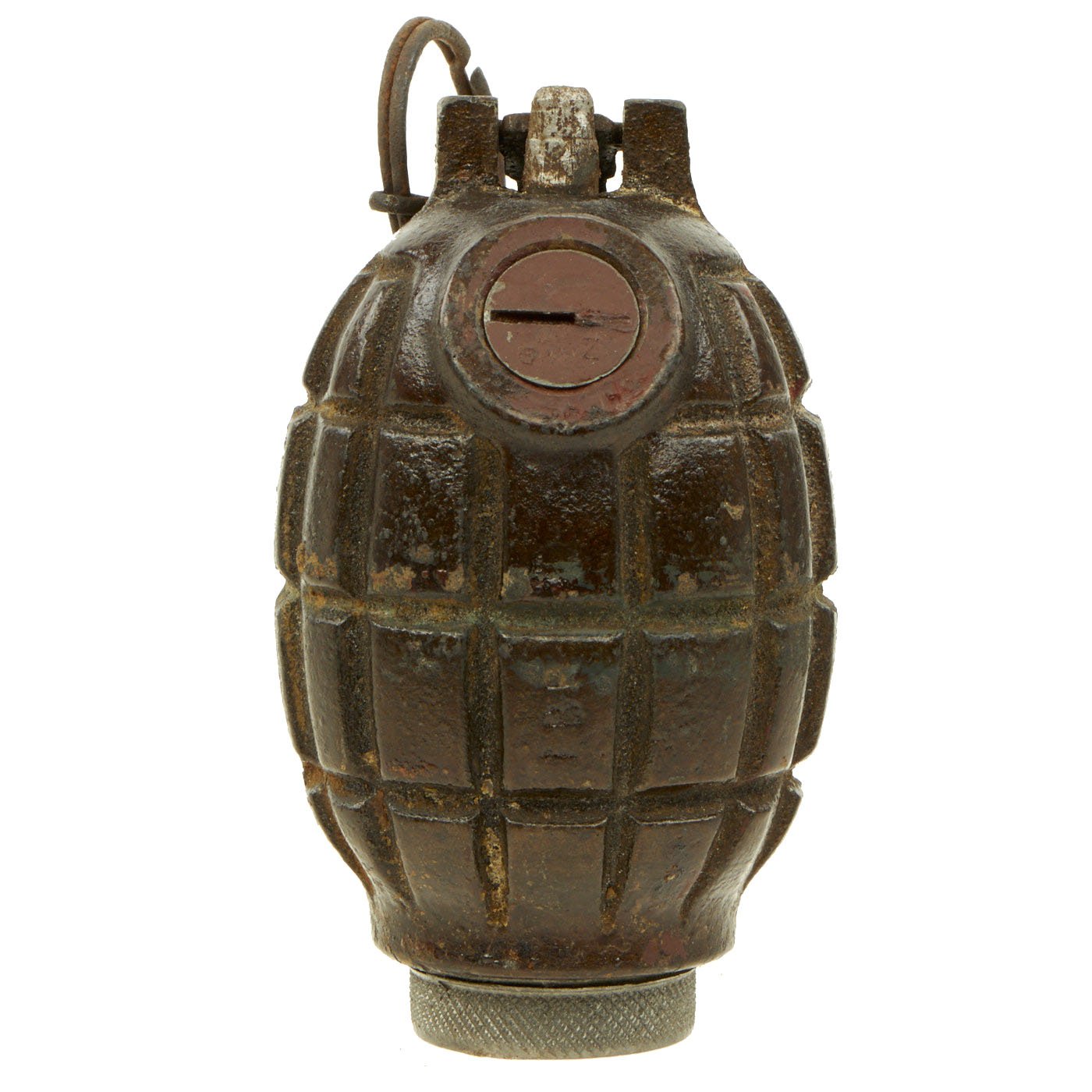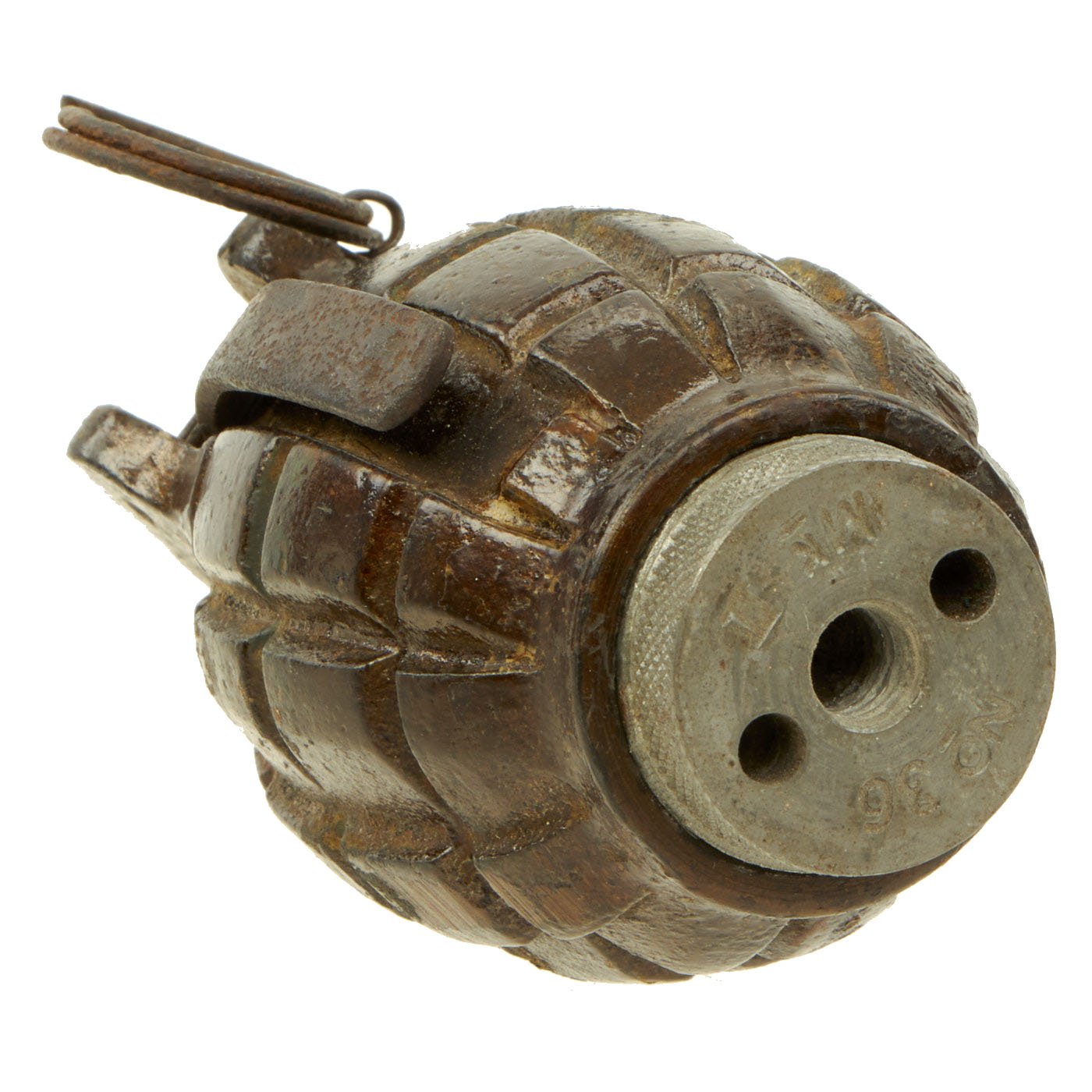 Original Item: Only One Available. This is an very nice BATF approved totally inert example of a No. 36M MkII Grenade. This type was known as the "Mesopotamian" variant due to its shellac-coating which was designed to keep moisture and humidity out of the detonator's fuse. The No. 36M was the British army's standard hand-grenade during WWII, and long afterwards. This wonderful example is complete with internal parts (no explosives!) and much of the original shellac coating. It has both traces of a green stripe around the middle and red X's. The shellac coating and red X's identify it as the "waterproof" No.36M model. It is totally inert, cannot be converted to an explosive devise.