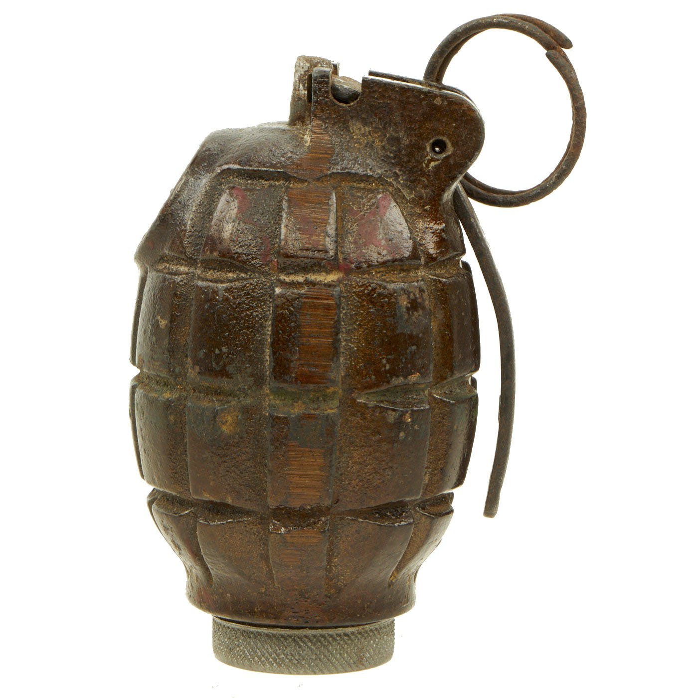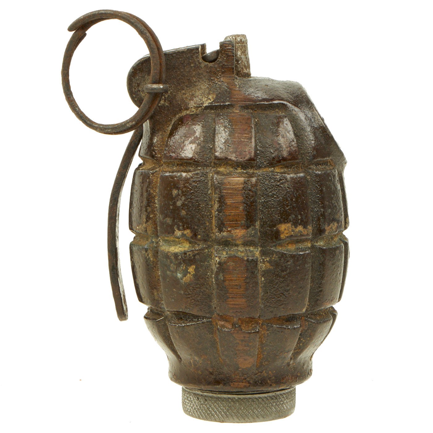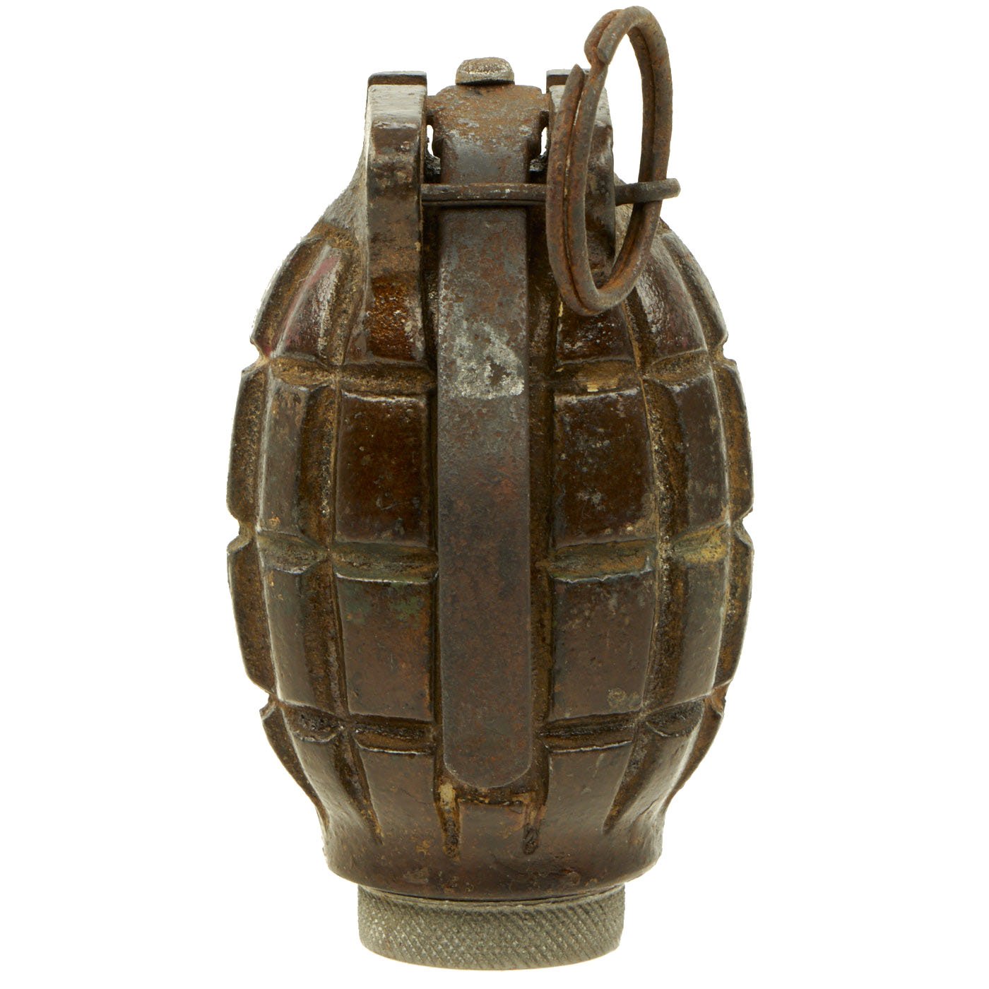 Original Item: Only One Available. This is an very nice BATF approved totally inert example of a No. 36M MkII Grenade. This type was known as the "Mesopotamian" variant due to its shellac-coating which was designed to keep moisture and humidity out of the detonator's fuse. The No. 36M was the British army's standard hand-grenade during WWII, and long afterwards. This wonderful example is complete with internal parts (no explosives!) and much of the original shellac coating. It has both traces of a green stripe around the middle and red X's. The shellac coating and red X's identify it as the "waterproof" No.36M model. It is totally inert, cannot be converted to an explosive devise.