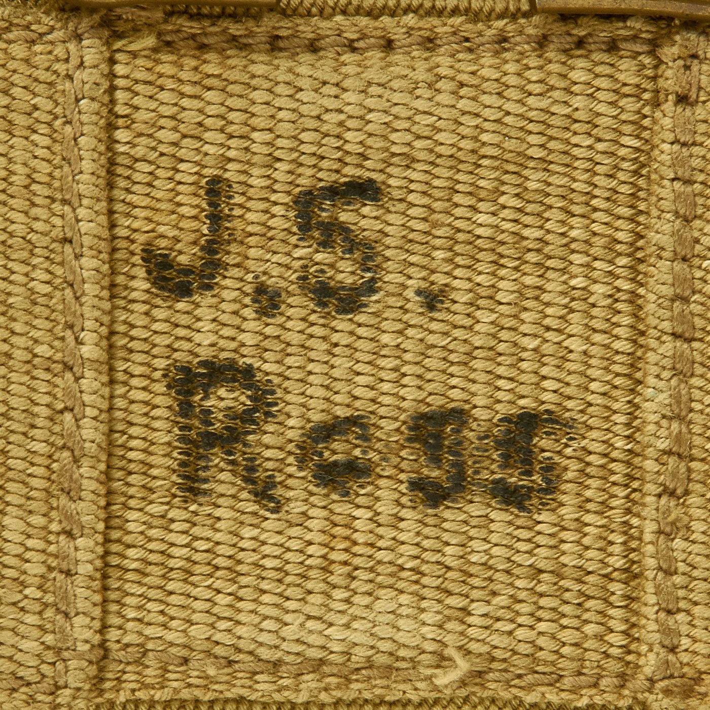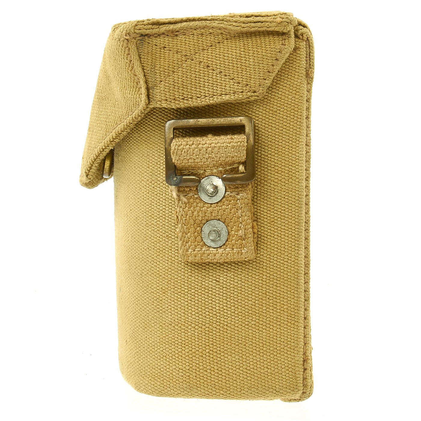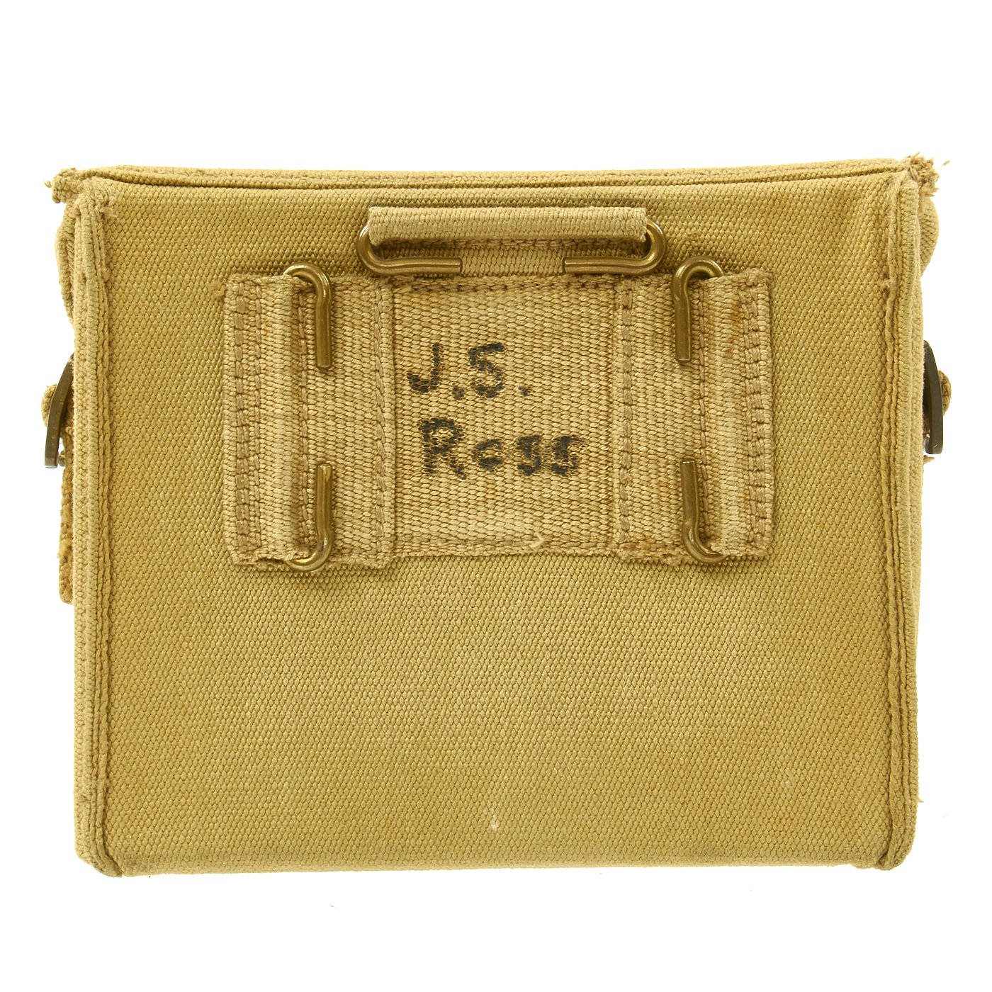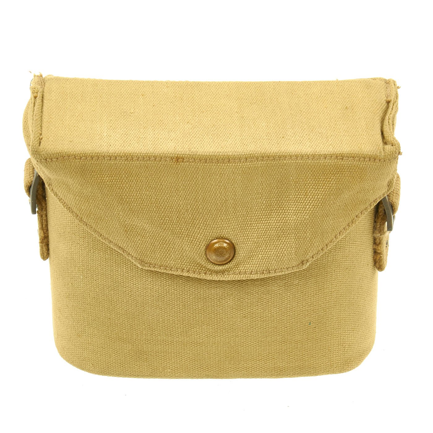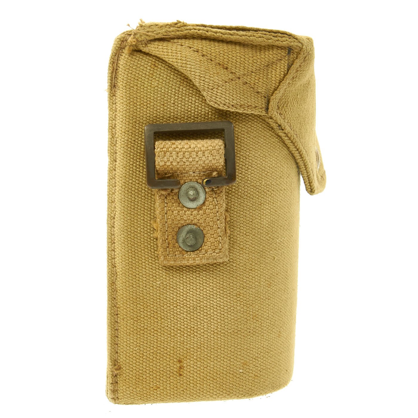 The binoculars come in a very nice, almost unissued Canadian P-37 khaki canvas carry case, made by Zephyr Loom and Textile Limited - Canada's primary WWII web equipment manufacturer. The top is faintly marked marked Z L & T Ltd and dated 1940. Below this is the "Broad Arrow in C" Canadian acceptance mark. The case does not have the detachable shoulder strap, but does have clips on the back for interfacing with the standard P-37 equipment setup.