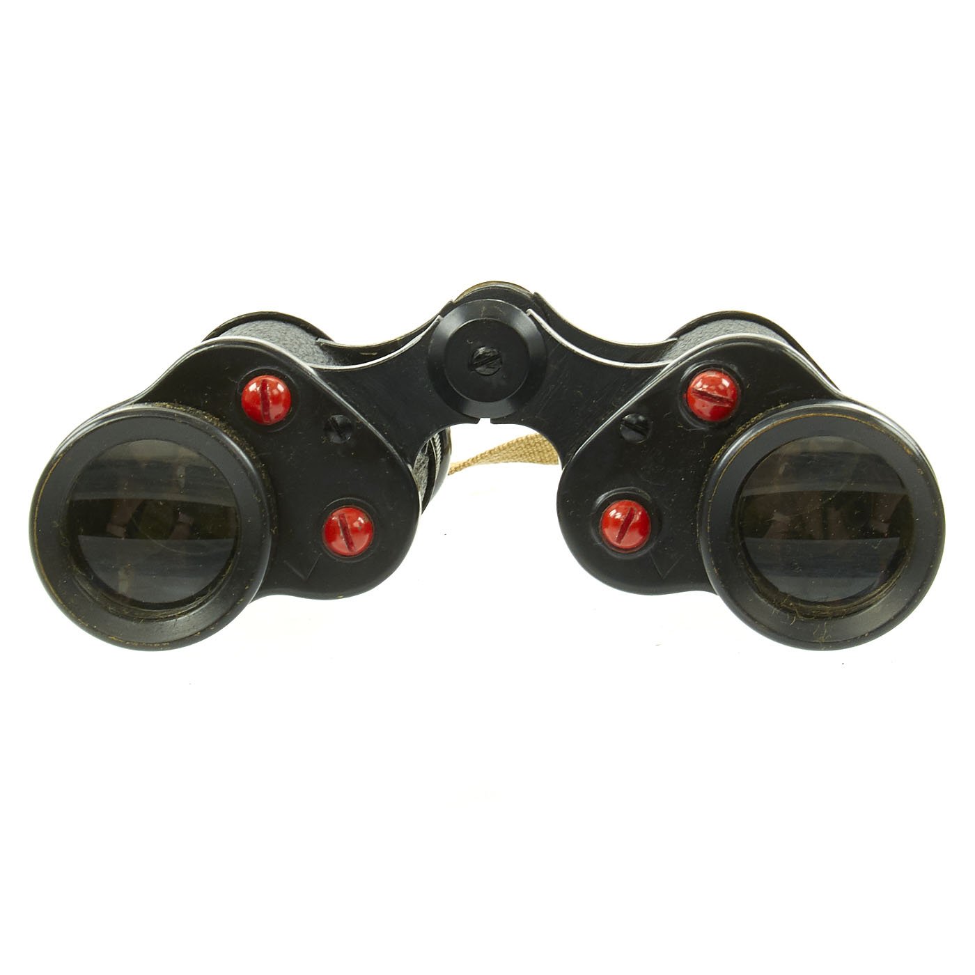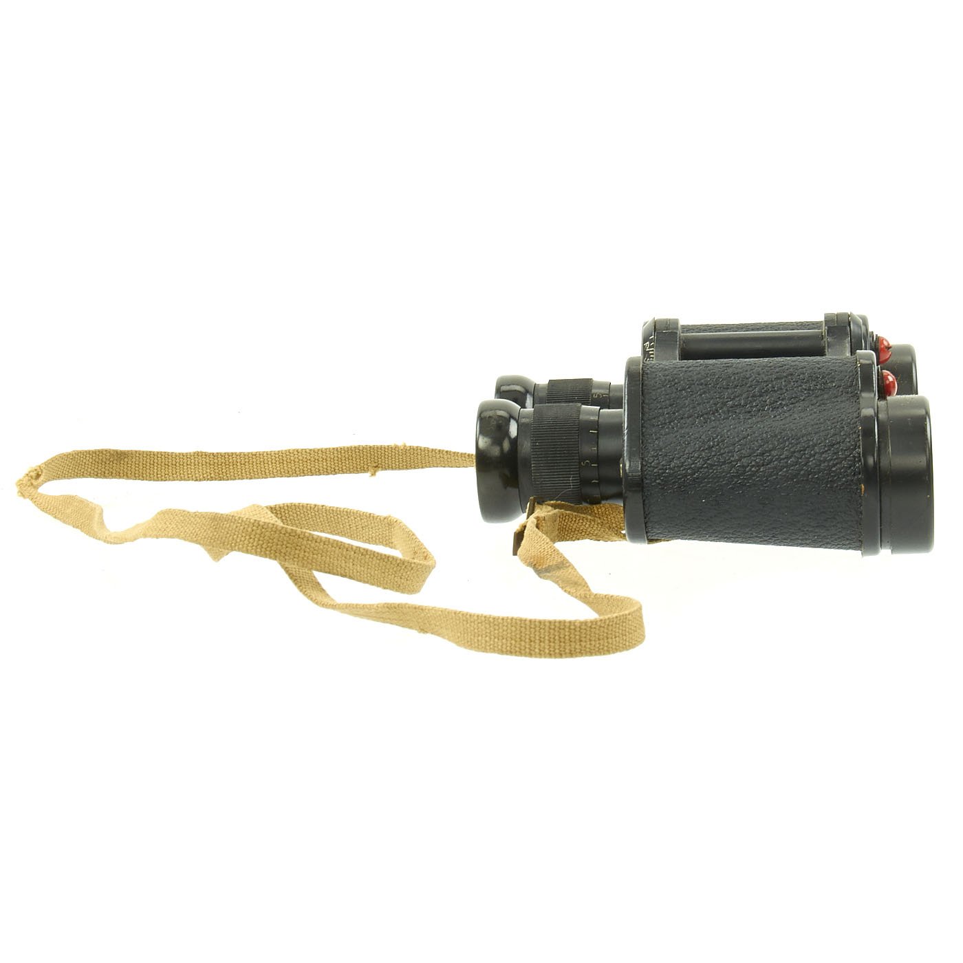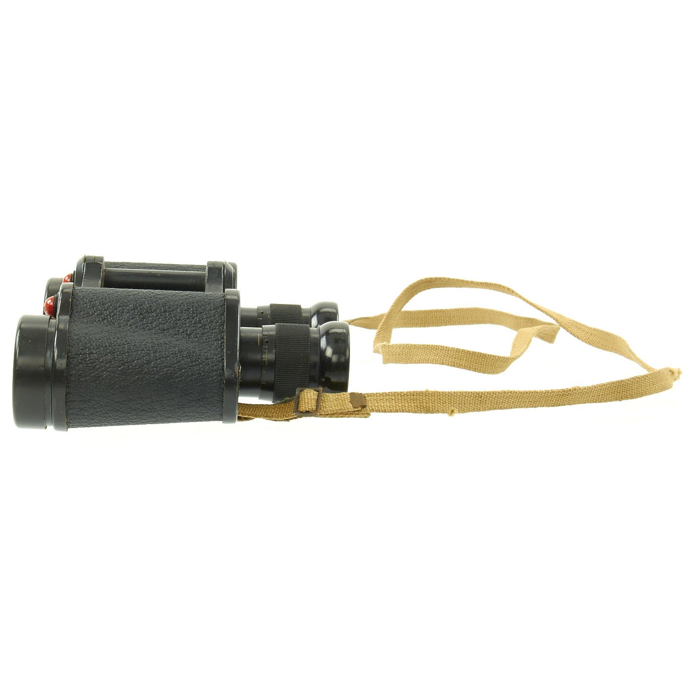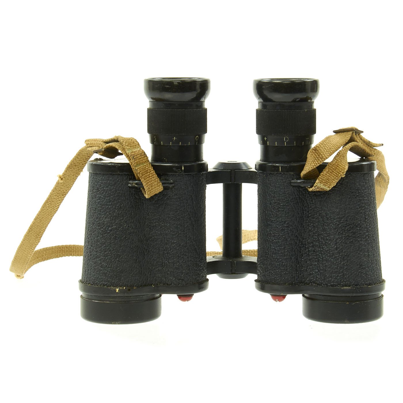 Original Item: Only One Available. In good working order these are a pair of POWER X 6 binoculars, as often used by Officers while overseeing the soldiers under their command. These are in very good condition, with intact eye cups and fully intact black paint and vinyl covering. These seem to be brass and zinc or steel construction, and are not magnetic, except for some of the screws. The set comes complete with the original Khaki Canvas neck strap. Optics are clear, though a little dirty, and both diopter adjustments work correctly. The right side has a range reticule.