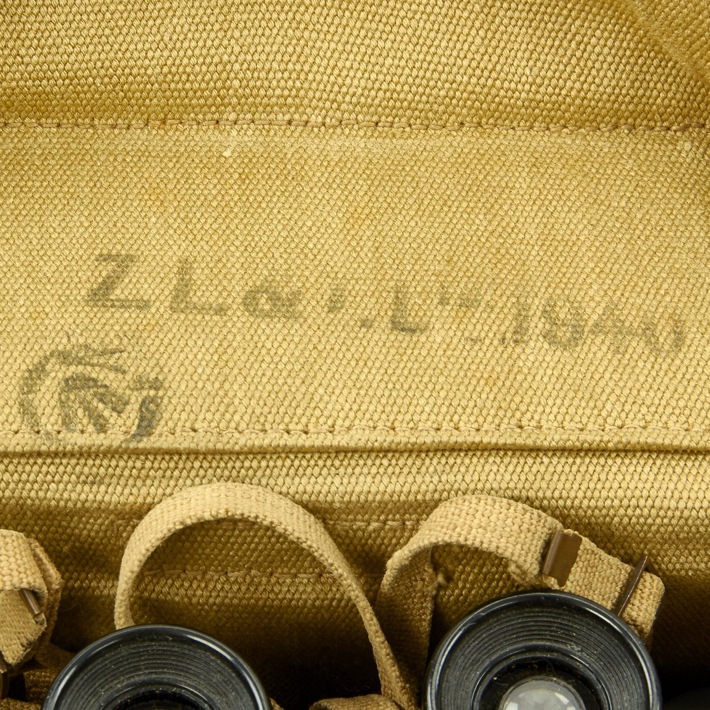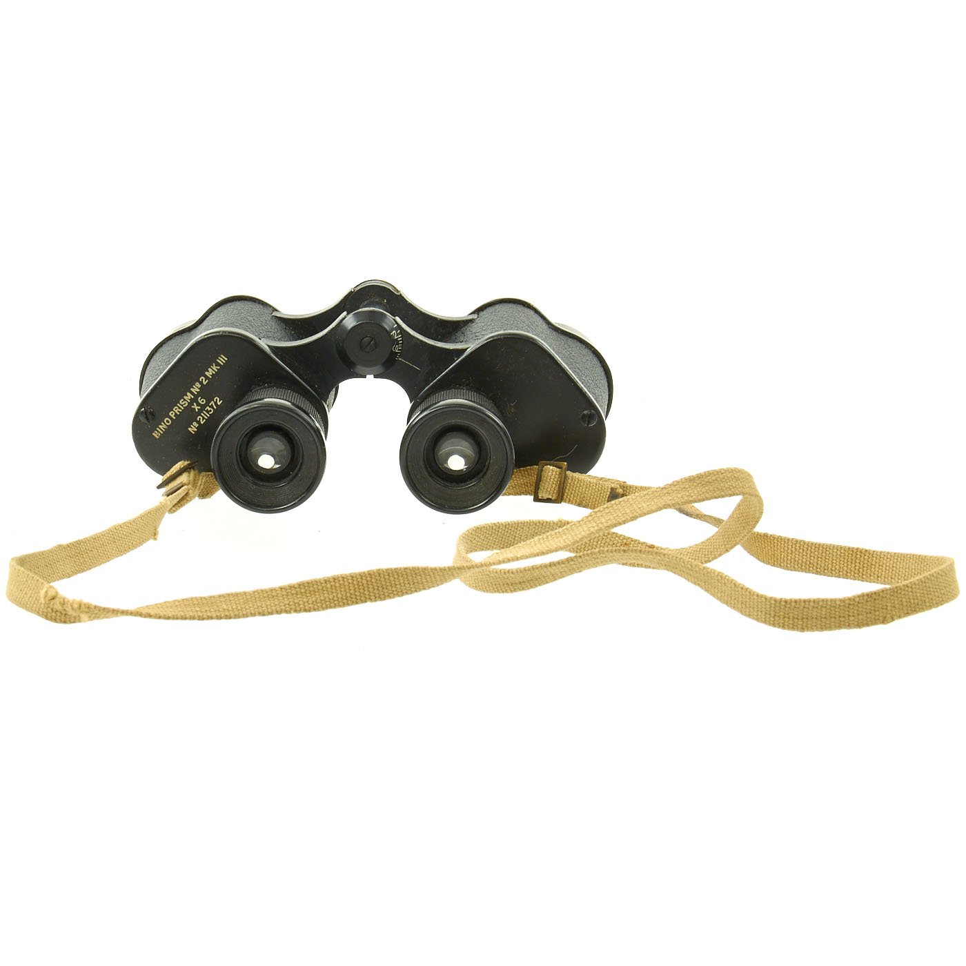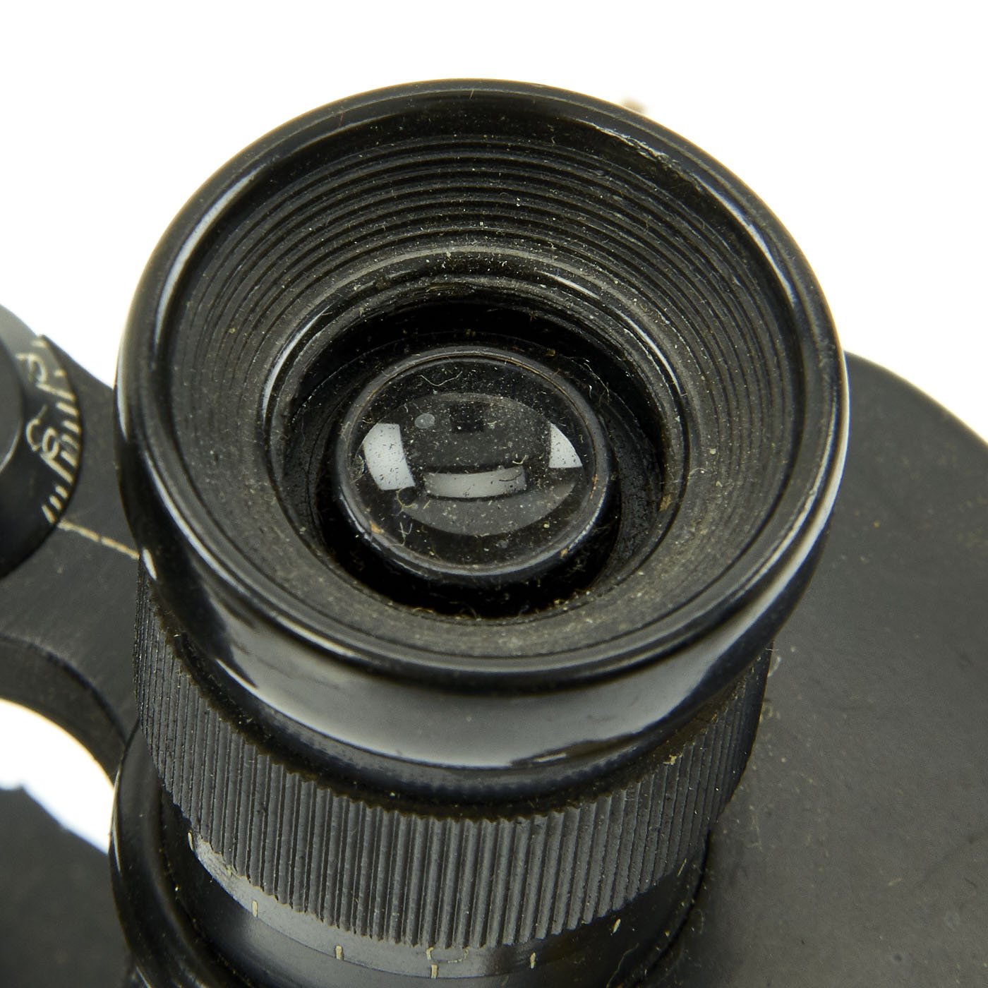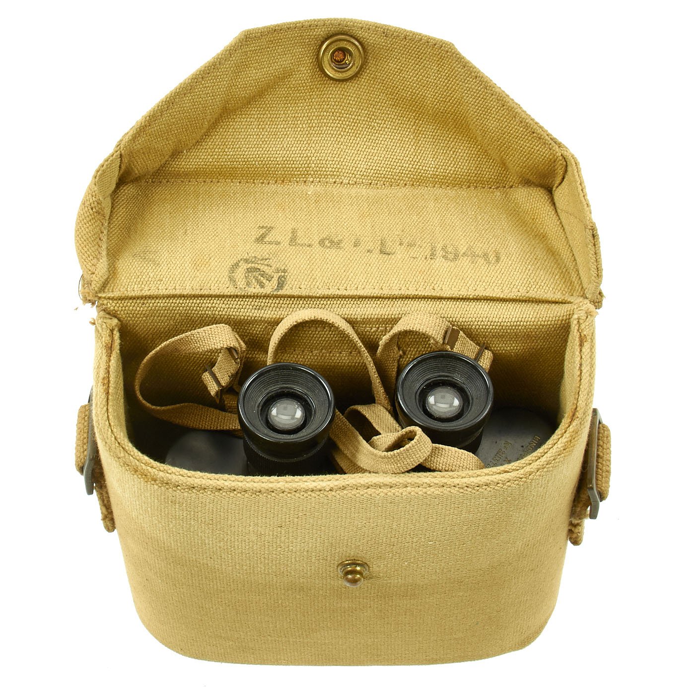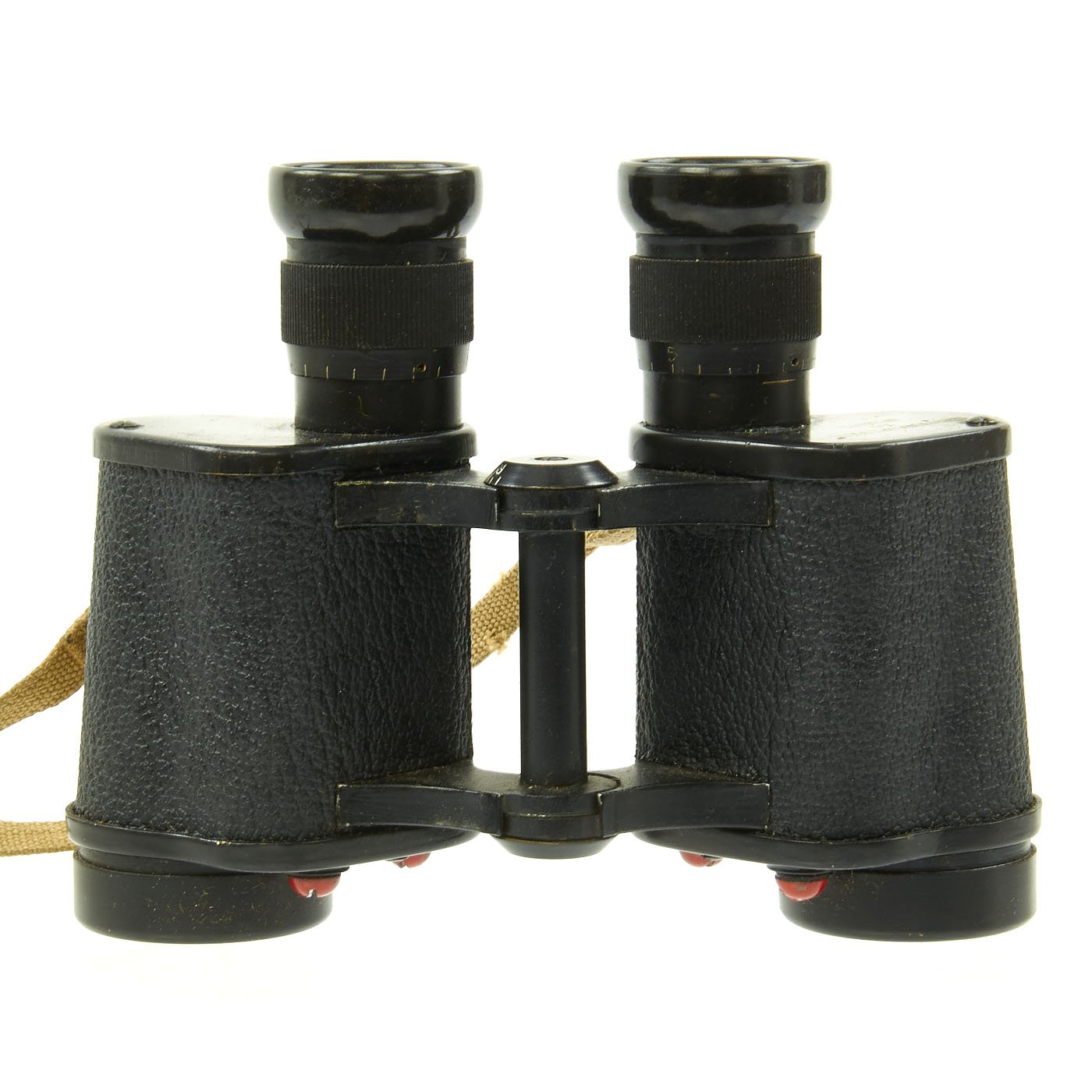Original Item: Only One Available. In good working order these are a pair of POWER X 6 binoculars, as often used by Officers while overseeing the soldiers under their command. These are in very good condition, with intact eye cups and fully intact black paint and vinyl covering. These seem to be brass and zinc or steel construction, and are not magnetic, except for some of the screws. The set comes complete with the original Khaki Canvas neck strap. Optics are clear, though a little dirty, and both diopter adjustments work correctly. The right side has a range reticule.