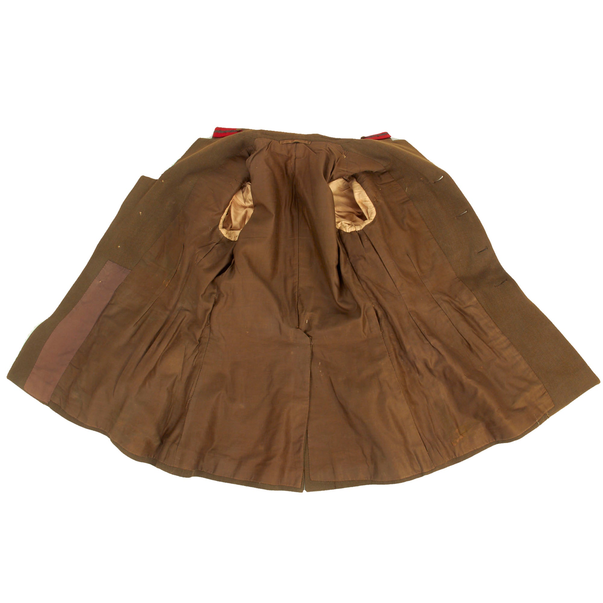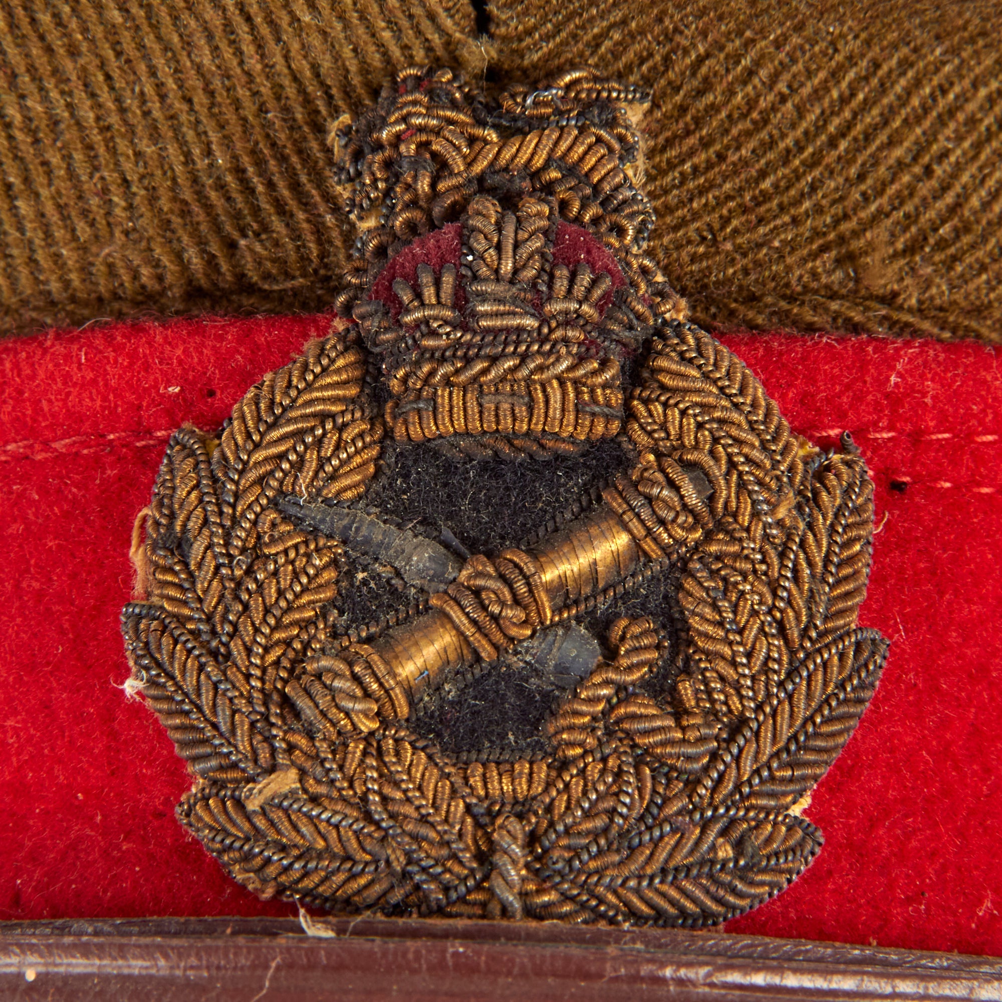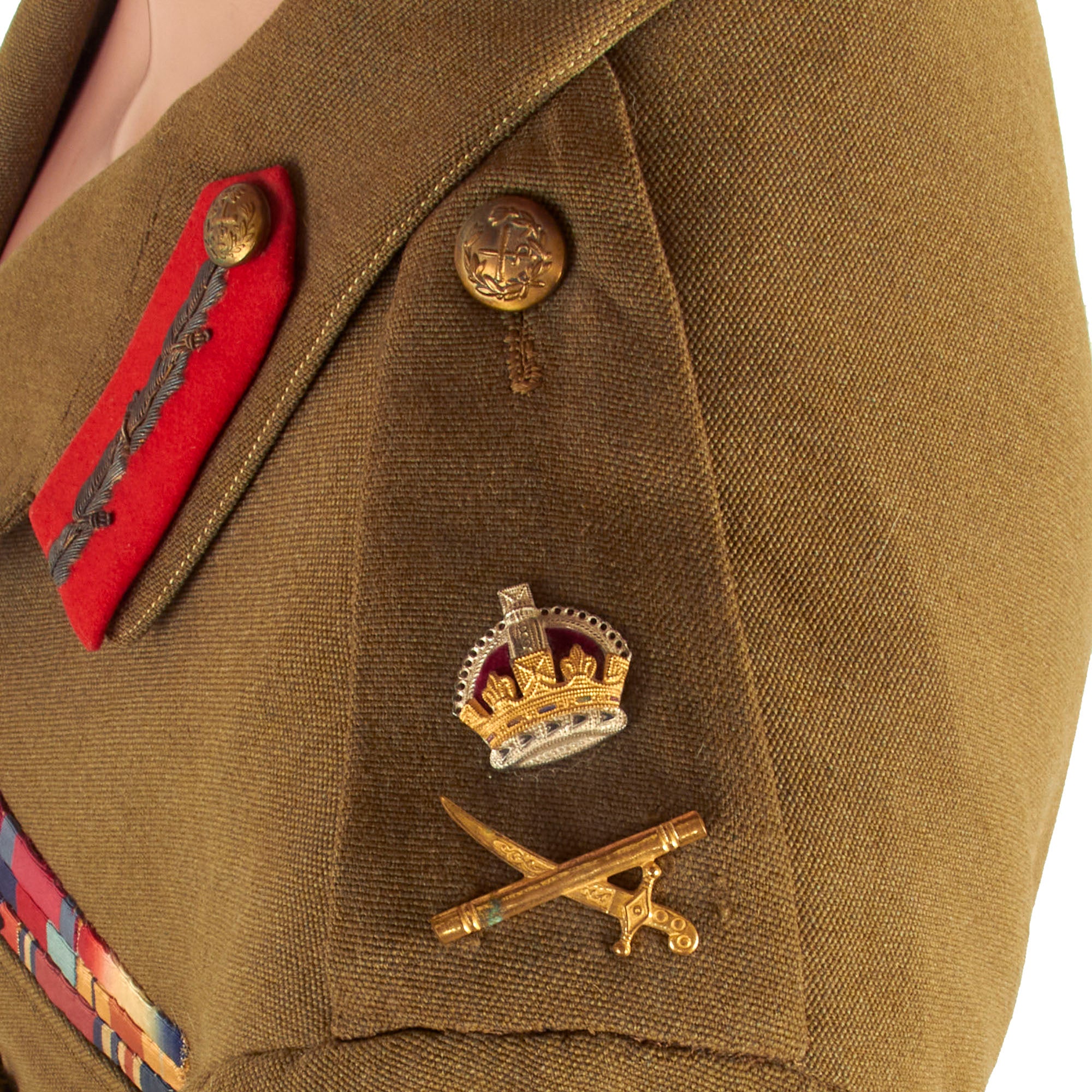 The jacket features 13 ribbons in worn/faded condition but the colors are still easily discernible making identification a breeze. The shoulder devices consist of the Crown with Crossed sword and baton, indicating the rank of Lieutenant-General with General Officer lapel devices. The shoulder sleeve insignia on both sides is a square with red over black and a bullion star in the center. This insignia is for the India Command, a command he was a part of in 1938/39 and 1945/46. The jacket and visor do show signs of use and wear but is presented without any extensive damage, and is quite a lovely display piece.
