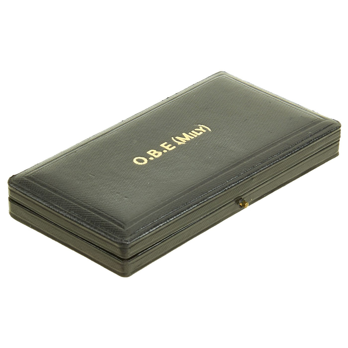This is an excellent condition cased medal, officially called the "Badge", for the 4th Class of the Order of the British Empire, an Officer of the Most Excellent Order of the British Empire, abbreviated as O.B.E.. This marking is present on the lid of the case, along with (MILY), indicating that this was awarded for military accomplishment, and not civil accomplishment.