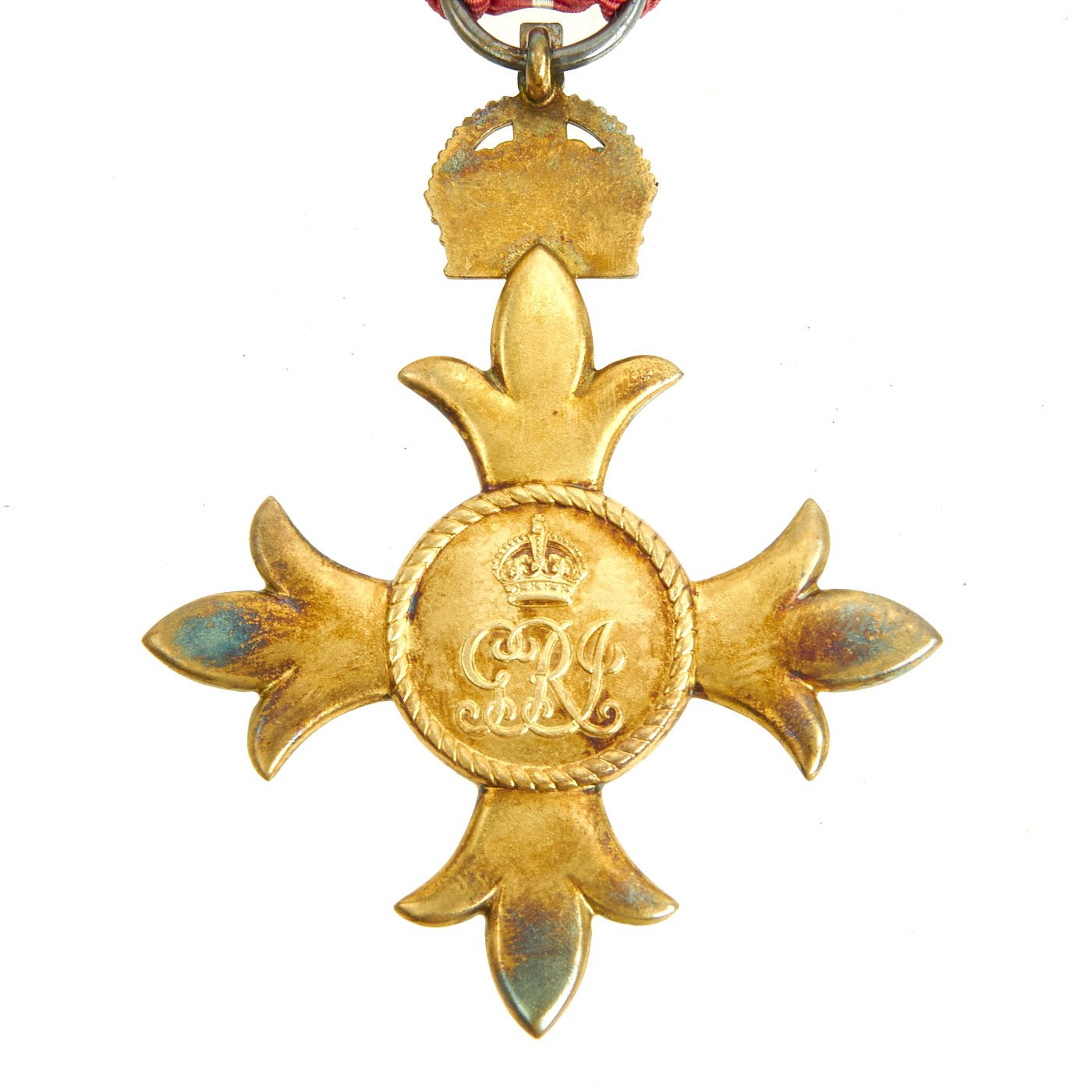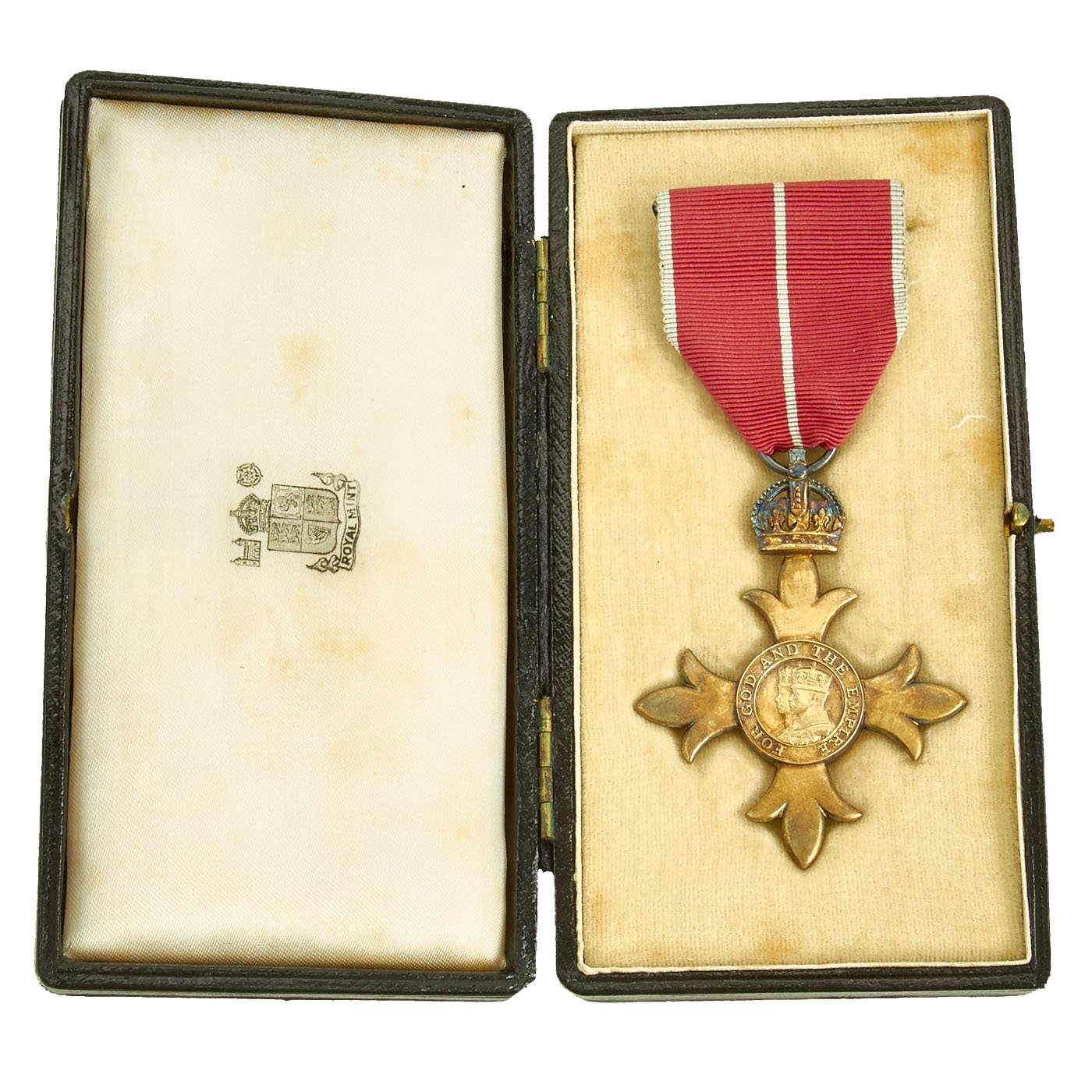 The medal inside is suspended from the correct white and red ribbon, with a central white stripe for military issue (the civil issue had no stripe in the middle). The medal itself bears the "King's Crown" at the top of the "Cross Patonce" shaped design, and in the middle is a circle with the busts of King George V and Queen Mary (of Teck). A circular border surrounds this with the motto of the order: FOR GOD AND THE EMPIRE. The reverse has another "King's Crown" over the GRI monogram (George Rex Imperator) of King George V.