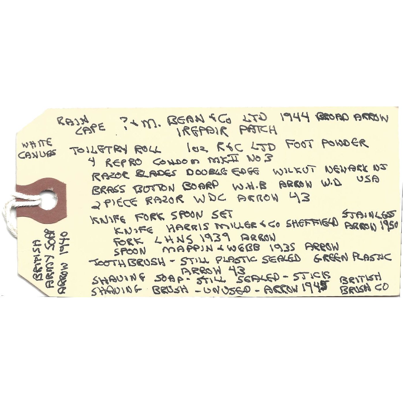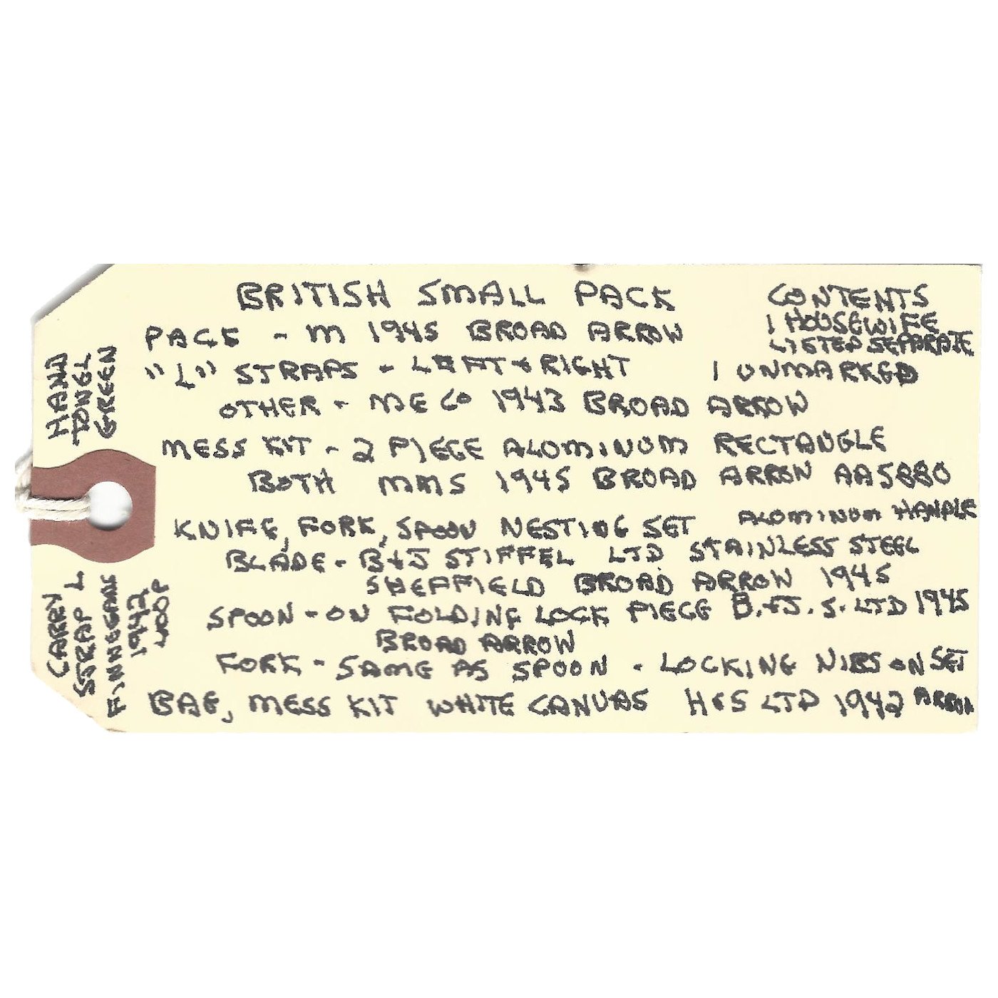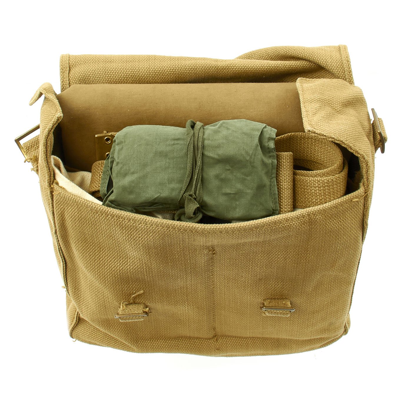 Original Item: Only One Available. This is a fantastic find! A collector's dream, in a manner of speaking. We purchased set this at a recent military show, and it is all contained in a very nice British WWII Pattern 1937 (P-37) Small Pack, in the correct Khaki Color. The collector who owned this previously apparently assembled this fine set during the late 1990s, purchasing the individual components, which are listed on a very nice hang tag, complete with details of the makers markings and dates! We assume that all of this information is correct, as some of the markings are quite faded. Please consult the photographs for condition and other details. Pack measures about 11" x 10" x 5" fully packed.