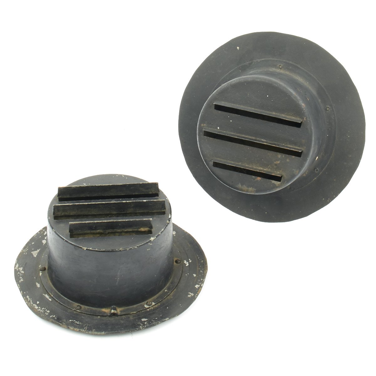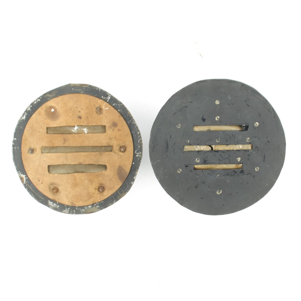 Original Item: One Set Available. We have never even seen a pair in this configuration before. They measure 8" and are made of steel in circular form that was intended to be tied or clamped around regular Automobile Head Lamps during the WW2 "BLITZ" AIR RAIDS.