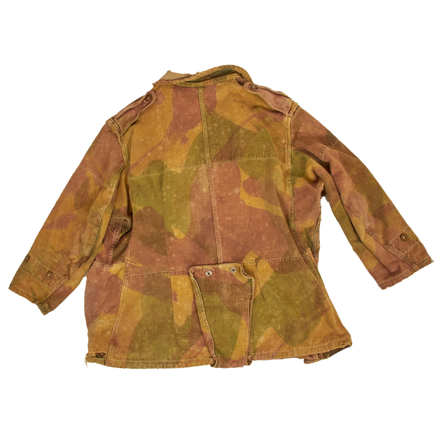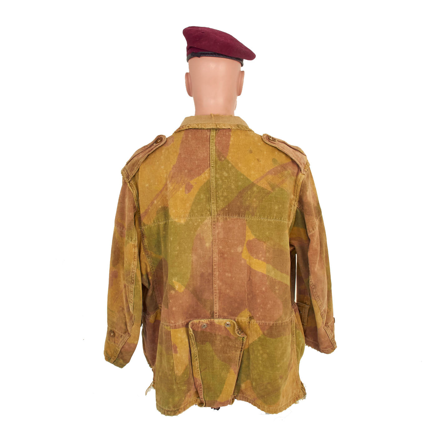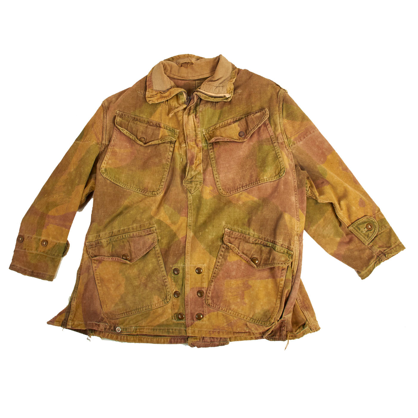 The 1st pattern smock was made from loose-fitting, yellowish-sand colored, heavyweight twill material, allegedly hand-painted with broad, mop like brushes using non-colorfast dyes in broad pea green and dark brown stripes, or "brush-strokes". With use the base color faded to a sandy buff, and the overlaid shades gained a blended appearance. The colors of the 1st pattern smock were thought to best suit the wearer to the North African and Italian theatres. It had a half length zip fastener made of steel, knitted woollen cuffs, four external pockets that secured with brass snaps (two on the chest and two below the waist), two internal pockets on the chest, and epaulettes that secured with plastic battle dress buttons. The inside of the collar was lined with soft khaki flannel (or in senior officer's smocks, Angora wool). A “beaver tail” fastened beneath the crotch from the back to the front of the smock - which kept it from riding up during a parachute descent. When not used, the tail would hang down behind the wearer's knees, hence the nickname "men with tails", given by the Arabs in North Africa in 1942. The smock was styled as a very loose garment, since it would be worn over Battle Dress, but it could be adjusted to some extent with tightening tabs on both sides of the lower part of the smock.