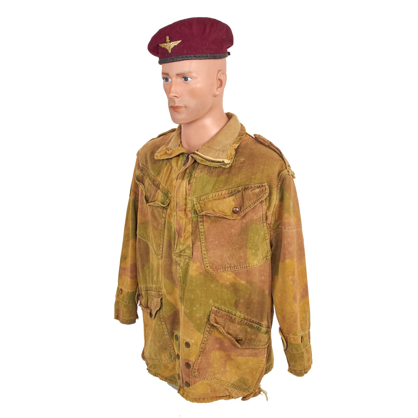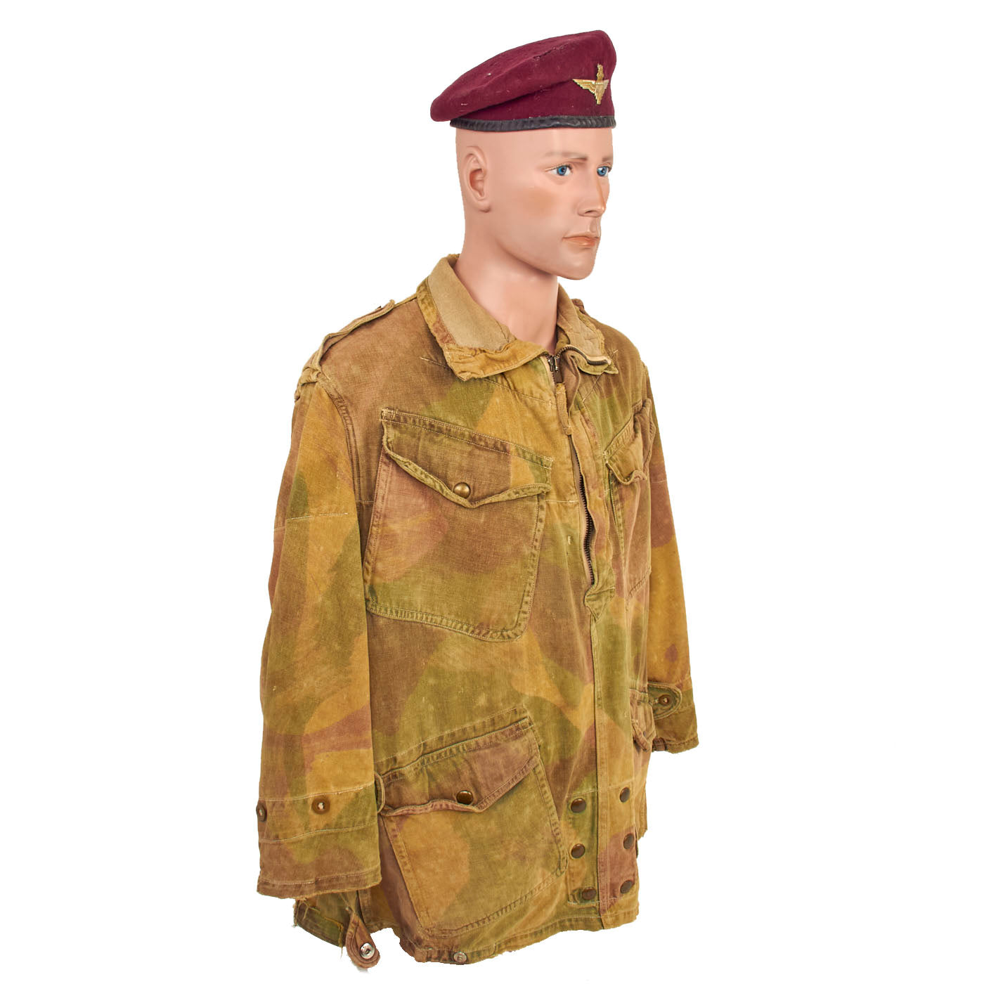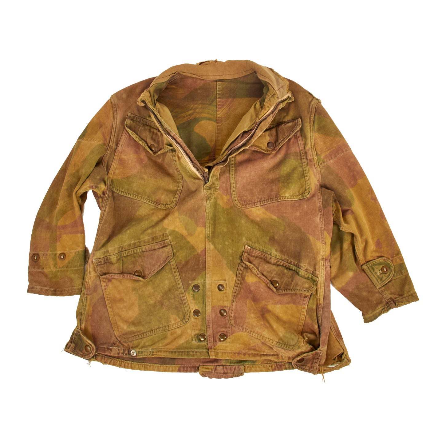 The 1st pattern smock was made from loose-fitting, yellowish-sand colored, heavyweight twill material, allegedly hand-painted with broad, mop like brushes using non-colorfast dyes in broad pea green and dark brown stripes, or "brush-strokes". With use the base color faded to a sandy buff, and the overlaid shades gained a blended appearance. The colors of the 1st pattern smock were thought to best suit the wearer to the North African and Italian theatres. It had a half length zip fastener made of steel, knitted woollen cuffs, four external pockets that secured with brass snaps (two on the chest and two below the waist), two internal pockets on the chest, and epaulettes that secured with plastic battle dress buttons. The inside of the collar was lined with soft khaki flannel (or in senior officer's smocks, Angora wool). A “beaver tail” fastened beneath the crotch from the back to the front of the smock - which kept it from riding up during a parachute descent. When not used, the tail would hang down behind the wearer's knees, hence the nickname "men with tails", given by the Arabs in North Africa in 1942. The smock was styled as a very loose garment, since it would be worn over Battle Dress, but it could be adjusted to some extent with tightening tabs on both sides of the lower part of the smock.