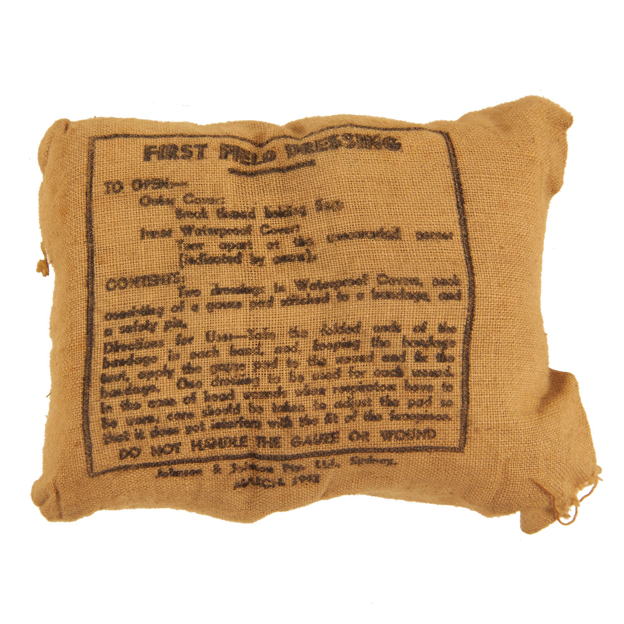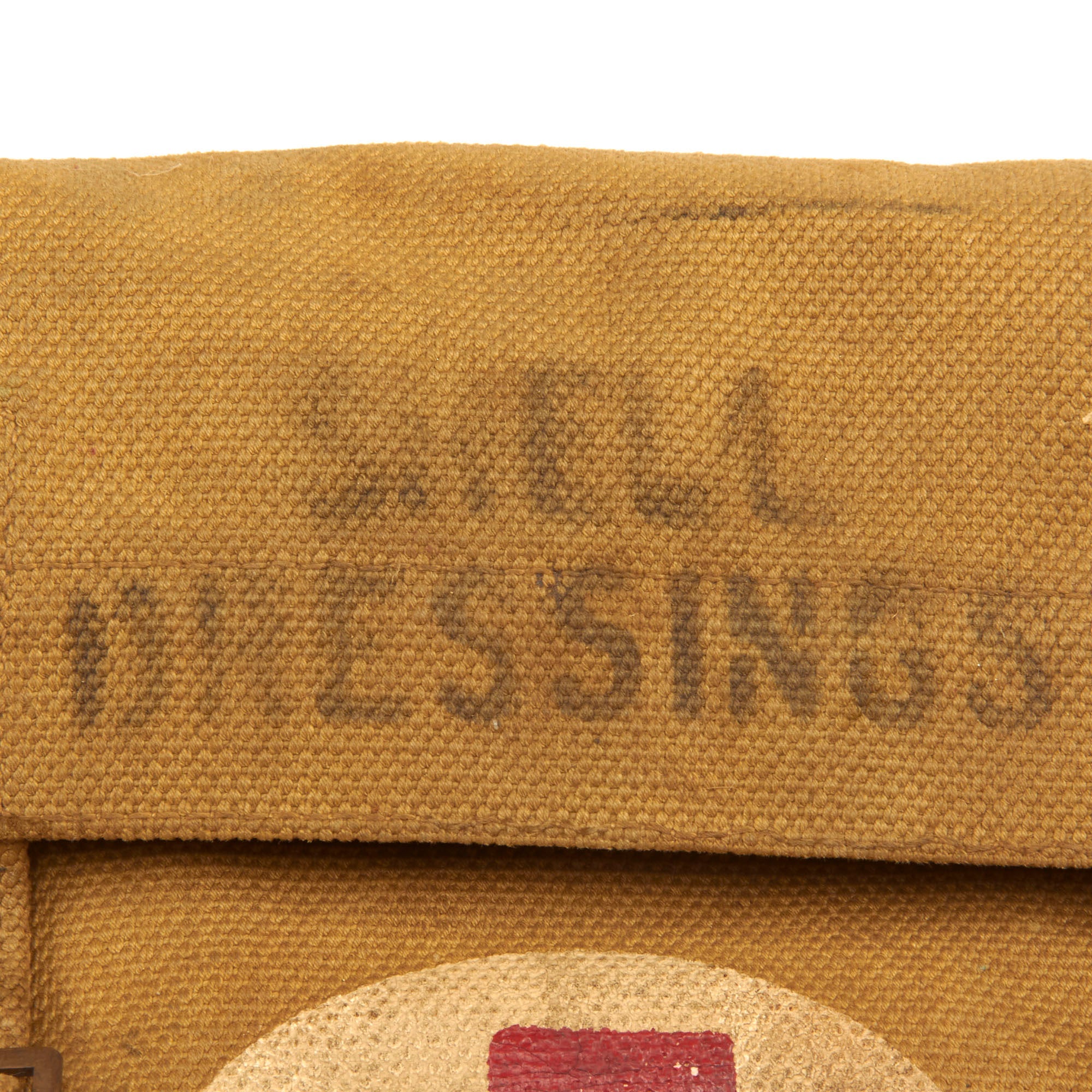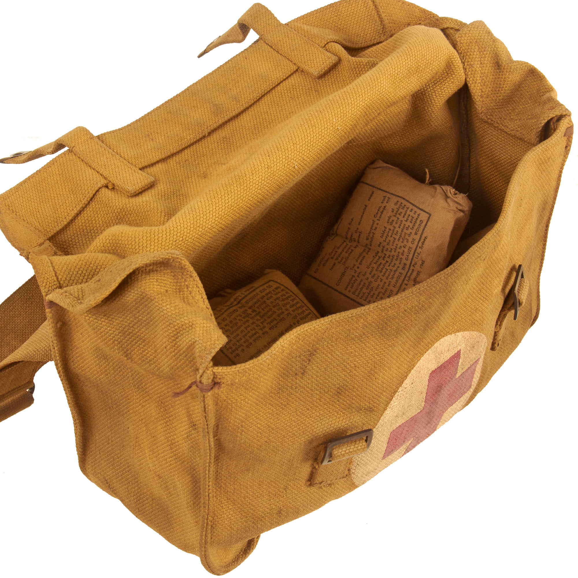 The interior of the bag bears a faint circular maker mark, which we unfortunately are unable to read, except for the large 1941 in the center. The front of the bag has a very nice painted "Red Cross" medic emblem, and the lid is marked SHELL DRESSINGS, indicating the type of items stored in the bag. Field medics had to carry various different types of field dressings, depending on the type of wound. Lots of gauze was also definitely a requirement. Inside the bag are six original FIRST FIELD DRESSING pouches, still full, and all are 1942 dated. They look to be unissued, though one pouch is open on one end.