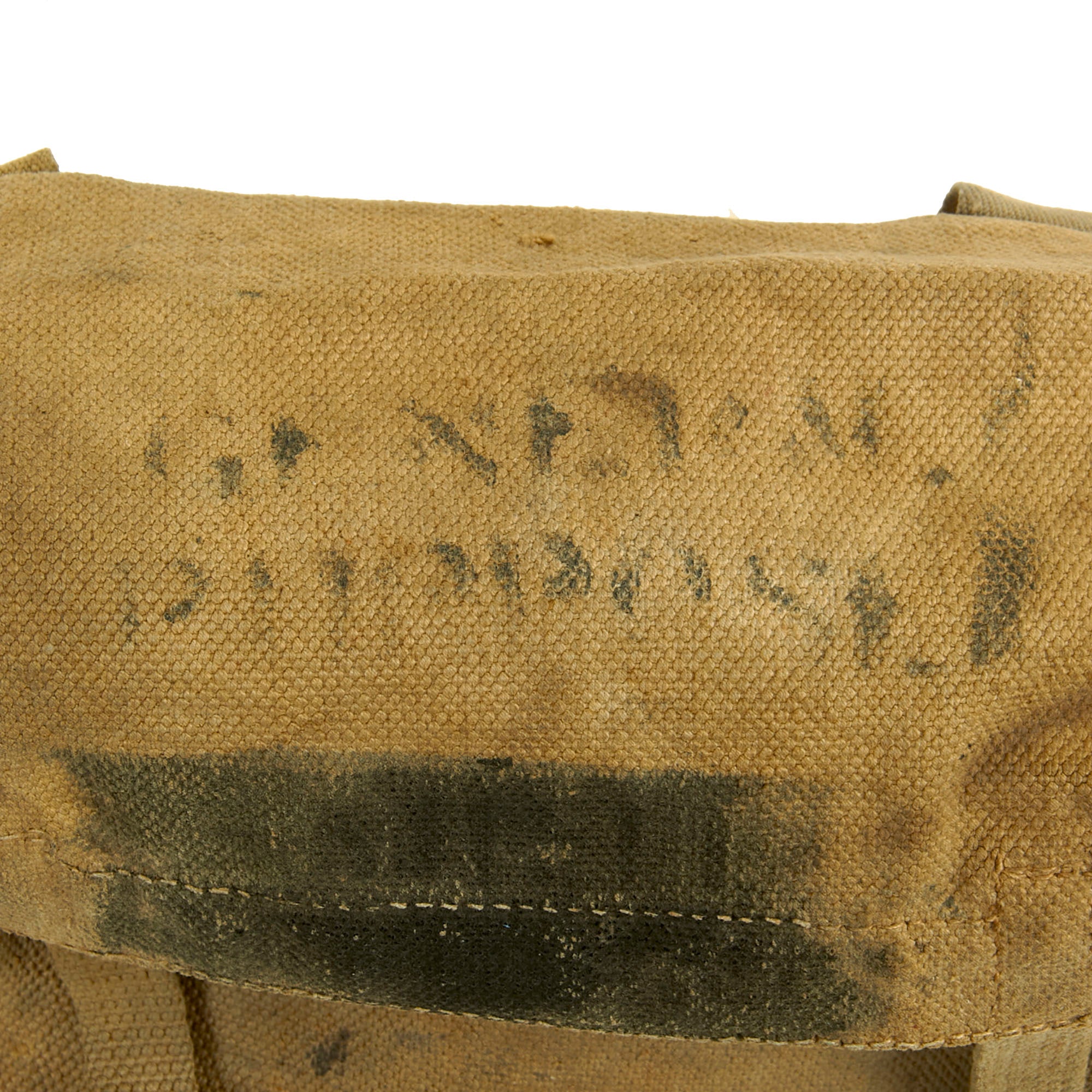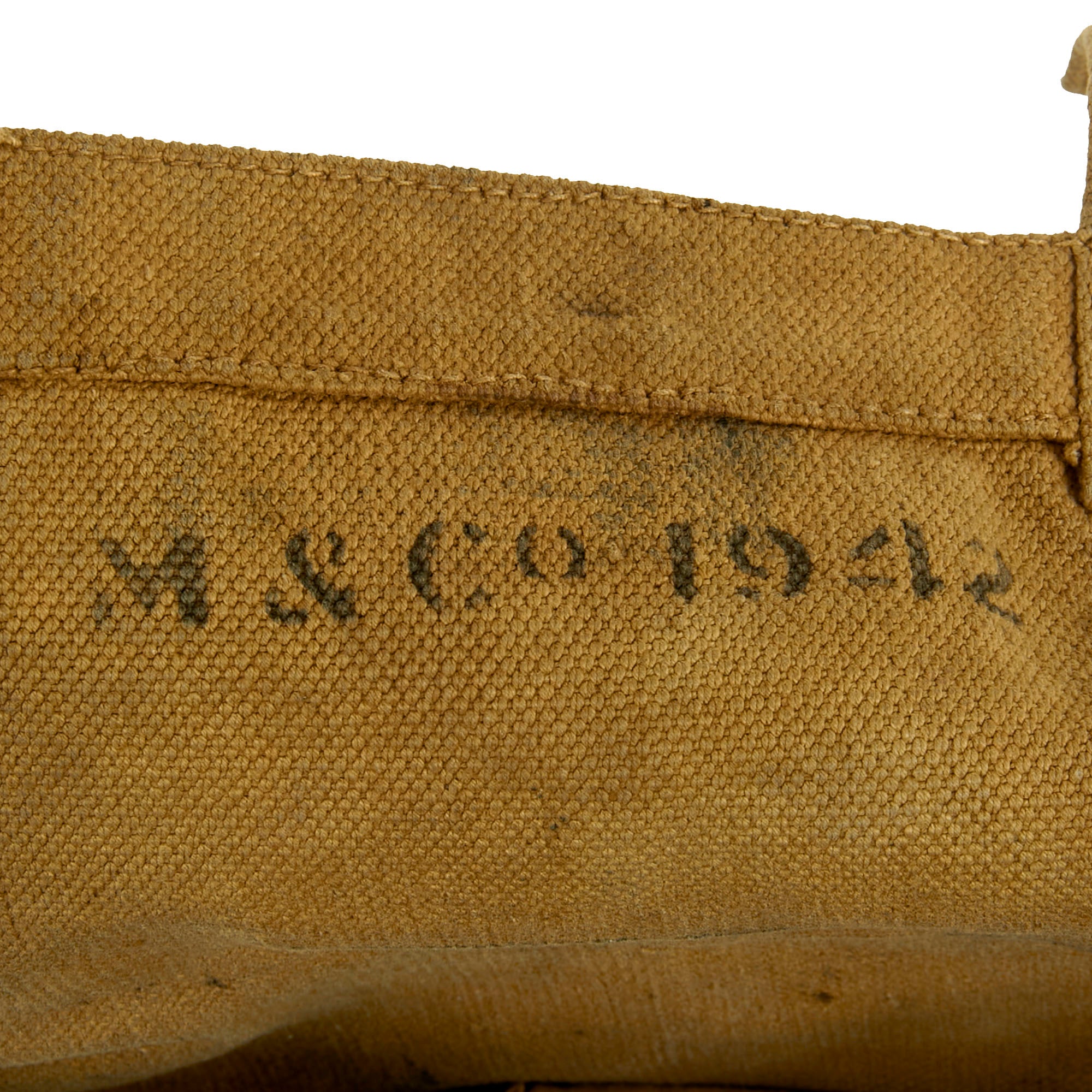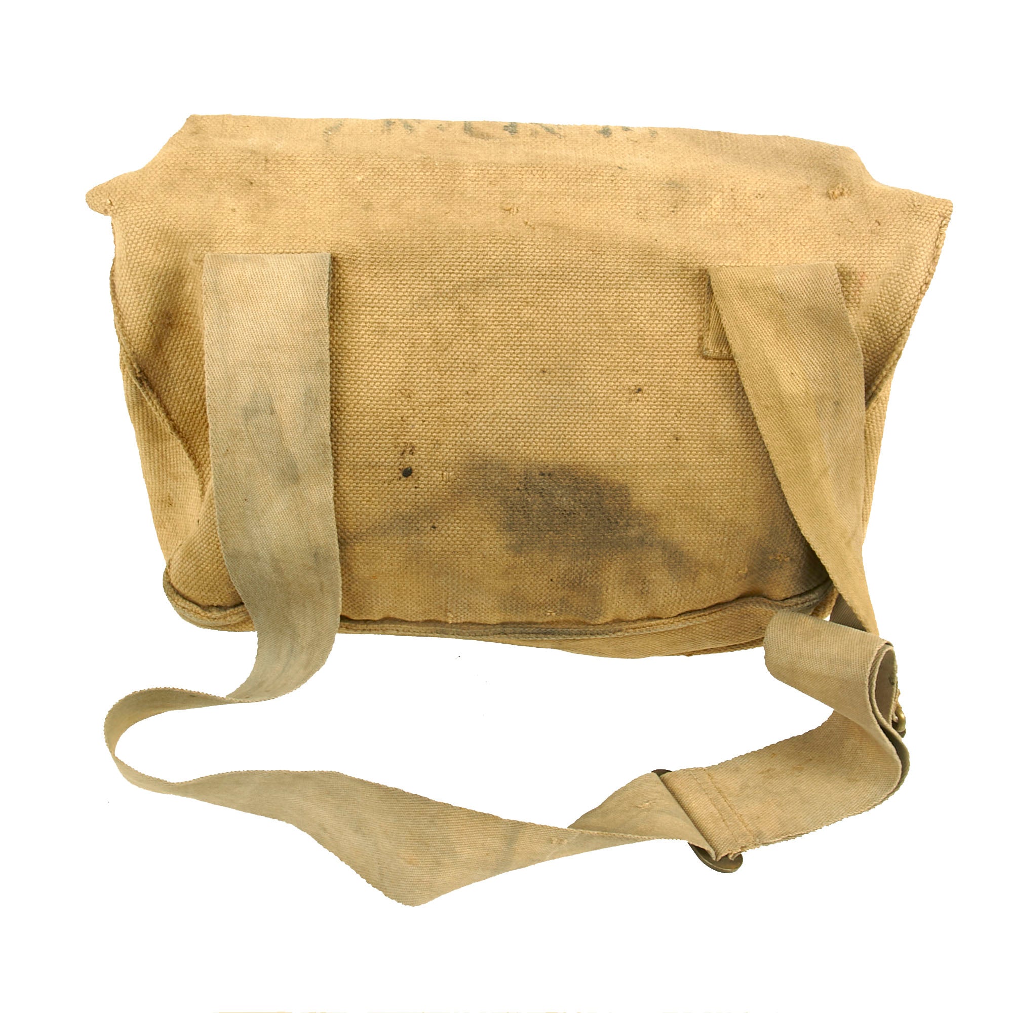 Original Item: Only One Available. This is a great British WWII Pattern 1937 (P-37) Medic's Shoulder Bag, which looks to have certainly seen use during the war. The bag measures about 12"W x 10"W x 3", though as it is flattened it is hard to get an accurate measurement. It is made of the correct P-37 Khaki Canvas, and uses the standard strap through buckle closure for the lid. The shoulder strap is made of somewhat finer canvas.