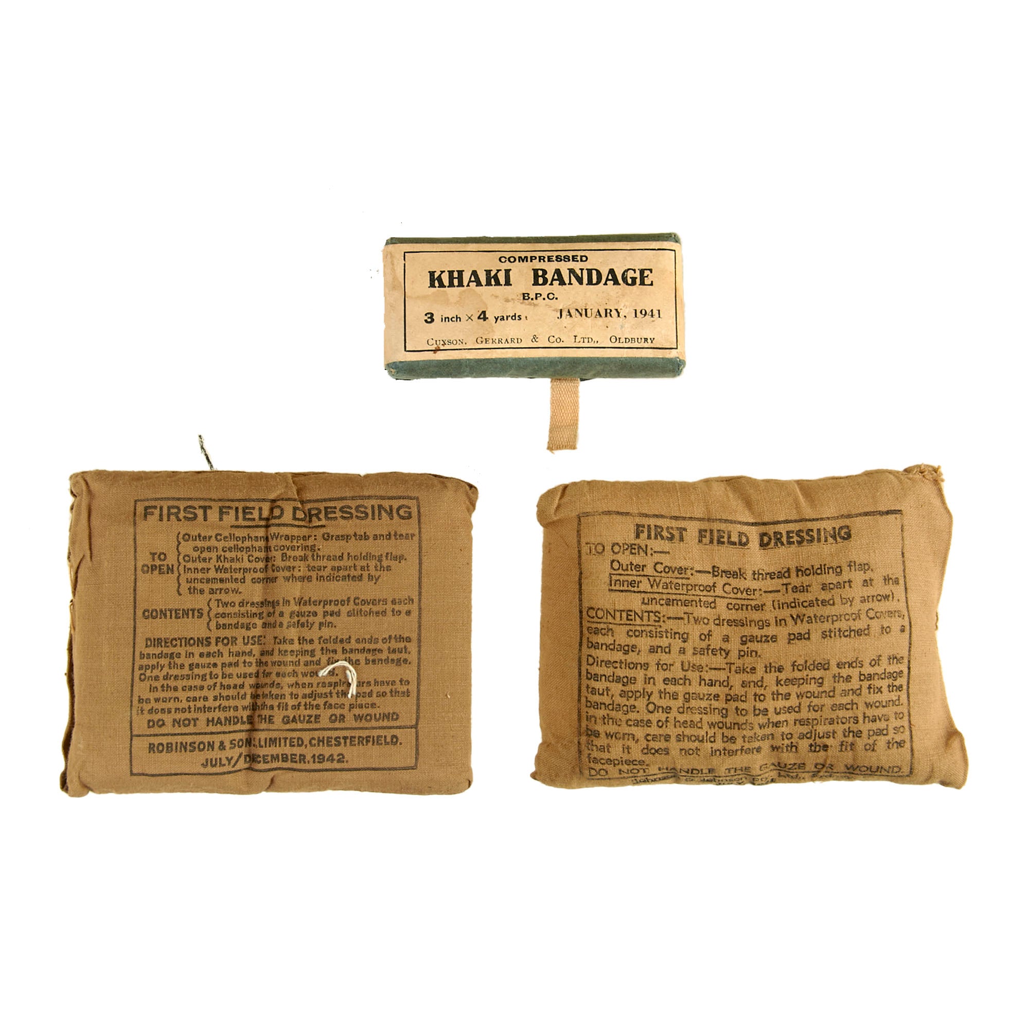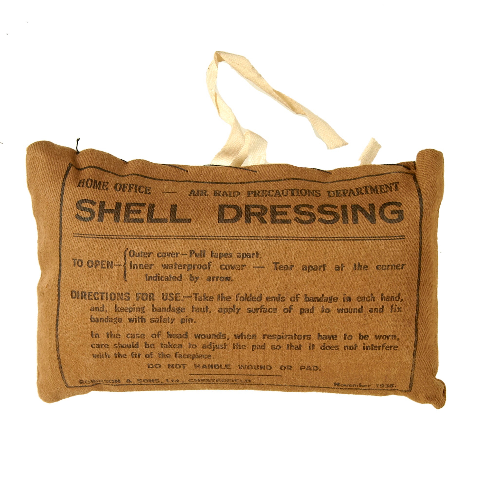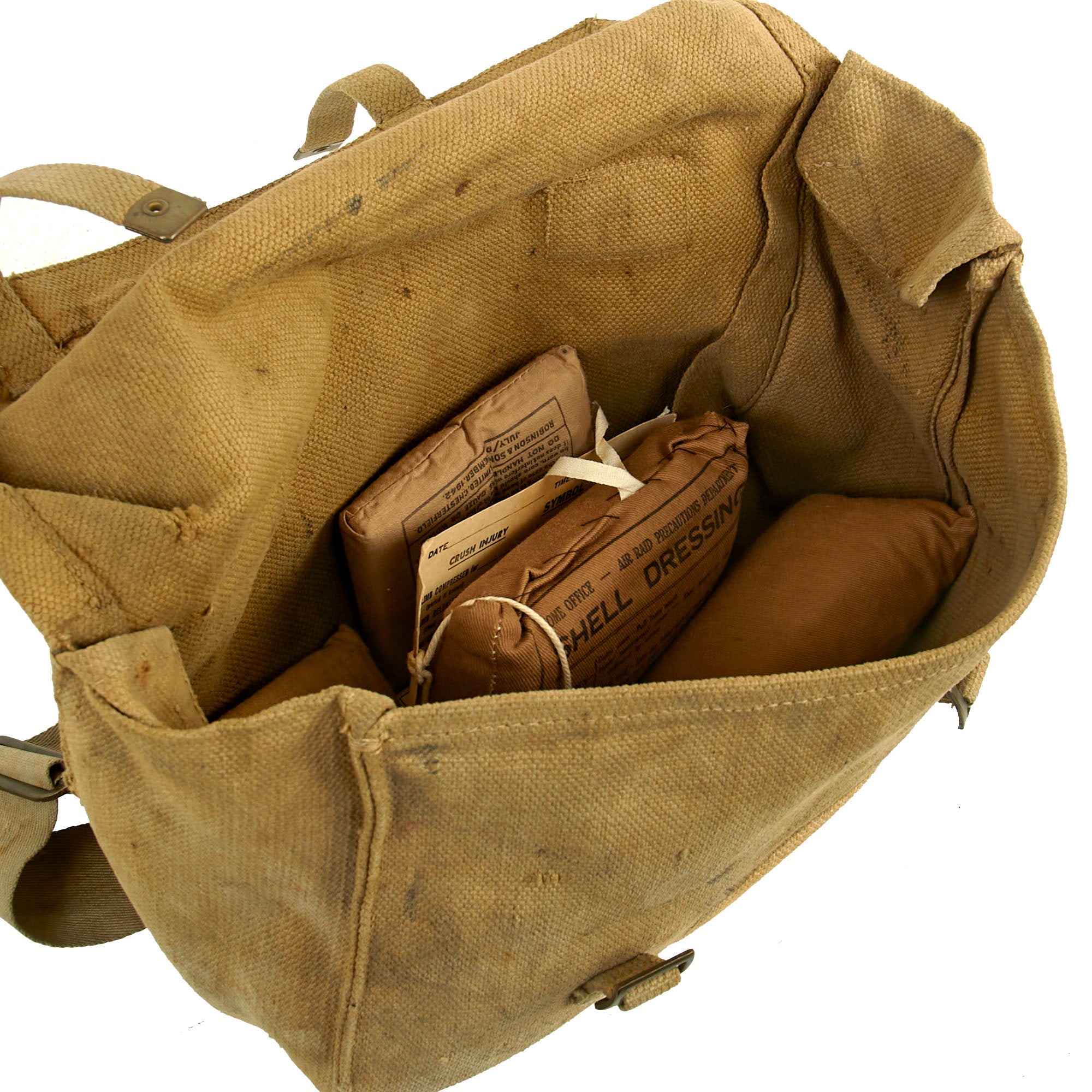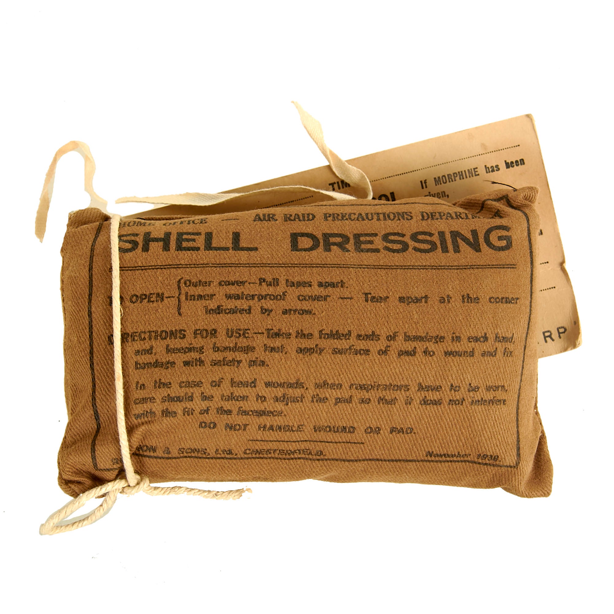 The bag contains 2 Shell Dressings dated 1938, two First Field Dressings dated 1941 and 1942, a Khaki Bandage dated 1941, and a casualty tag.
