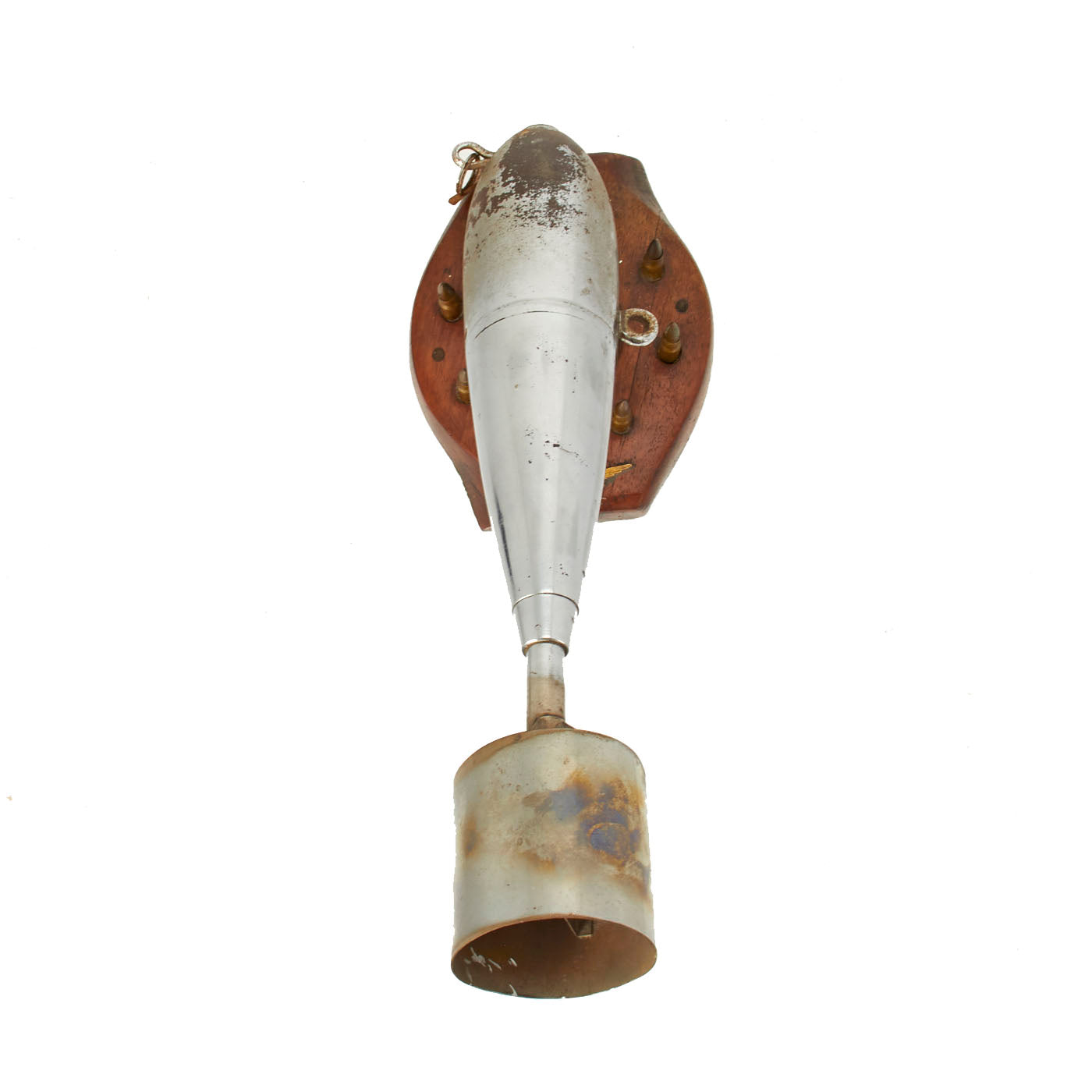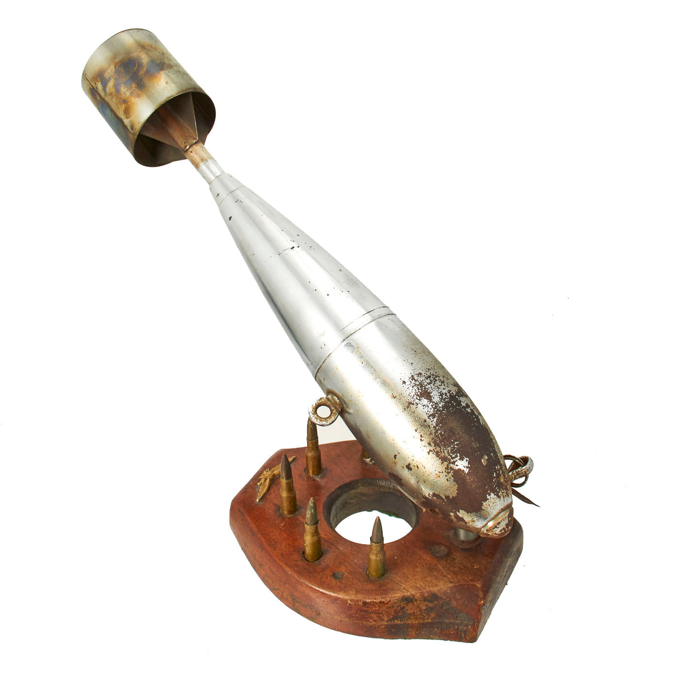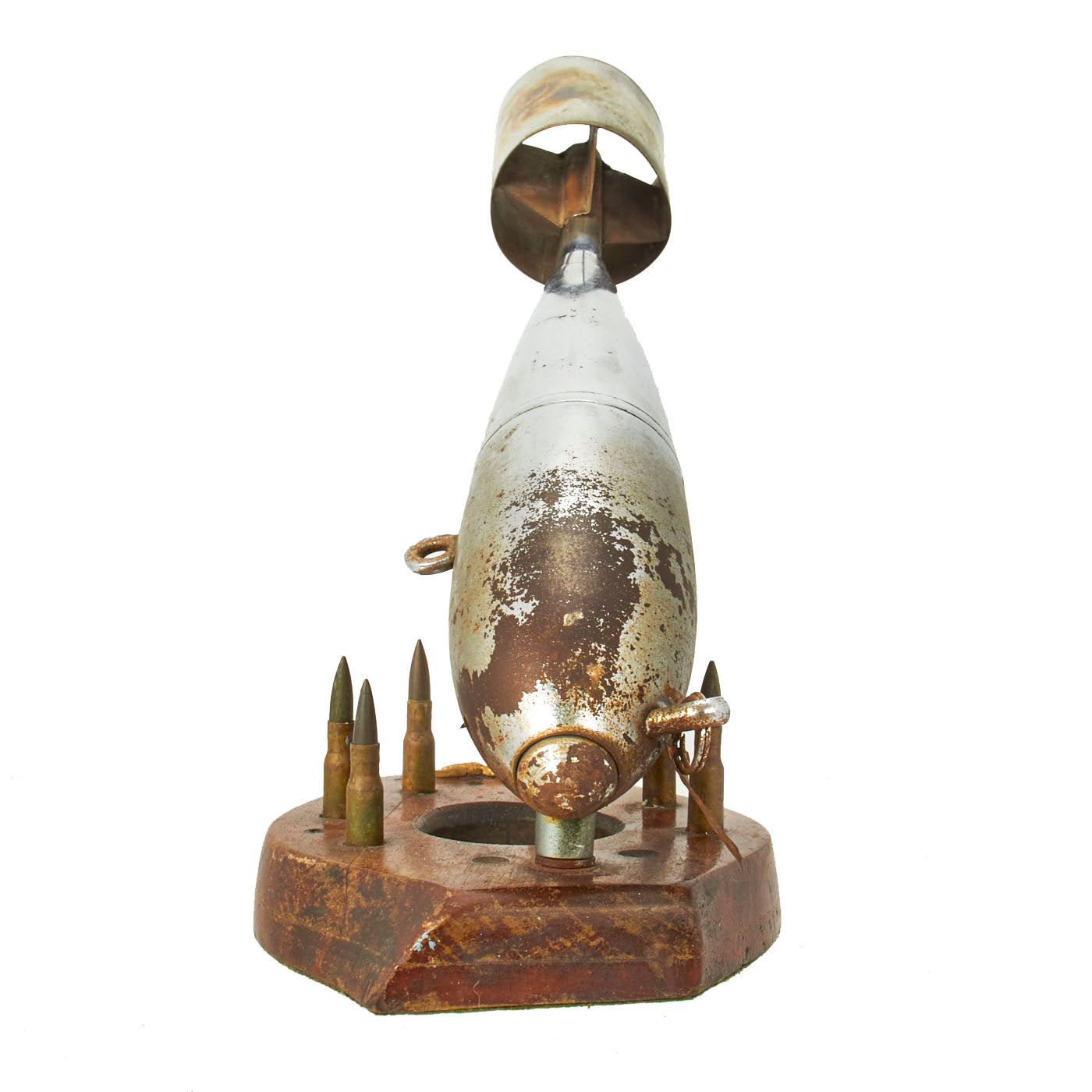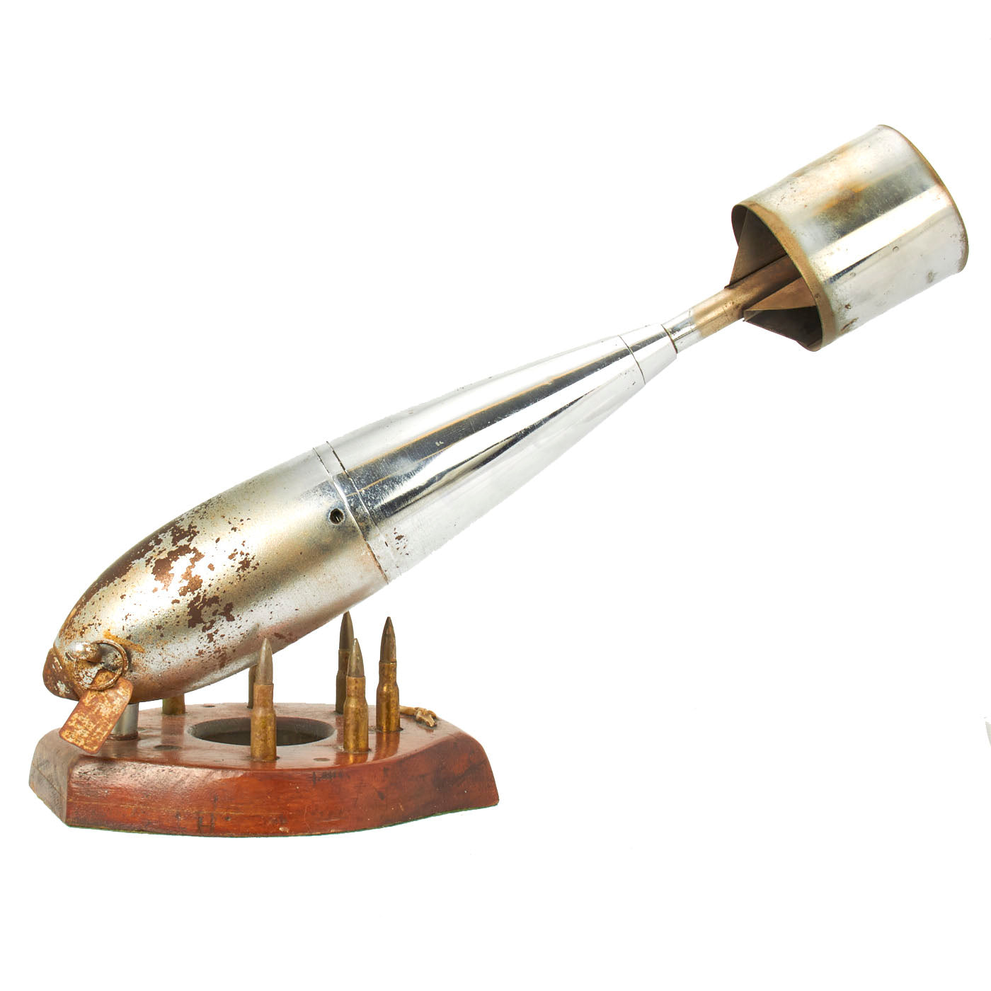- Original Item: Only One Available. Genuine World War Two Royal Air Force 10 pouch practice bomb mounted on a cross section of a wooden propeller adorned with ammunition and a gilt RAF eagle insignia. Bomb measures 18" long. A fantastic desktop trench art display from WW2.