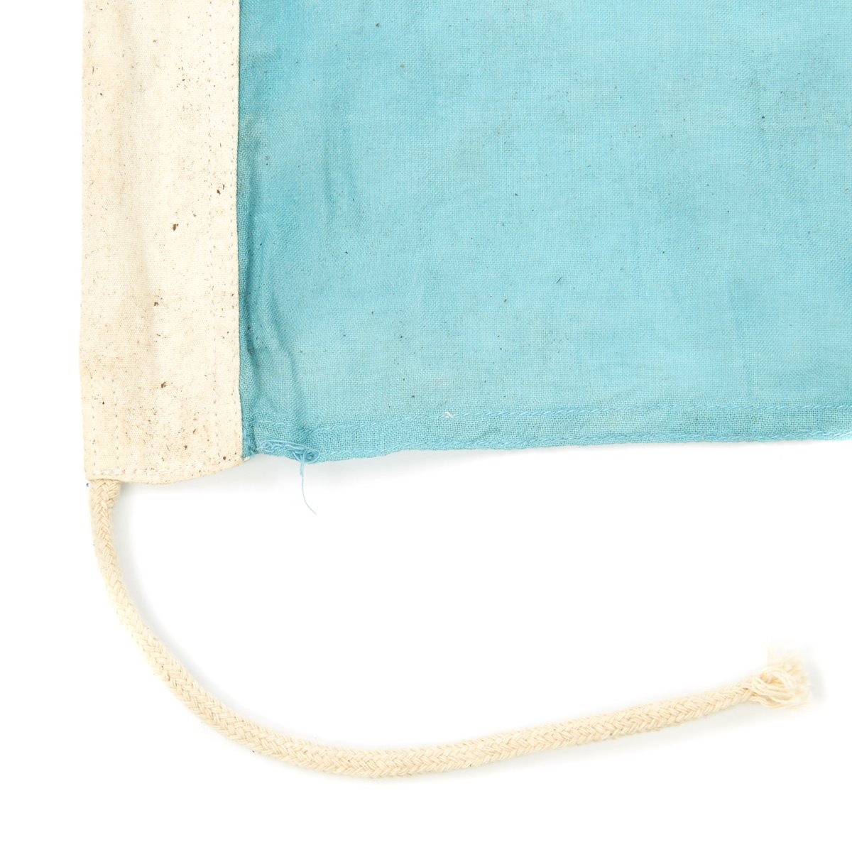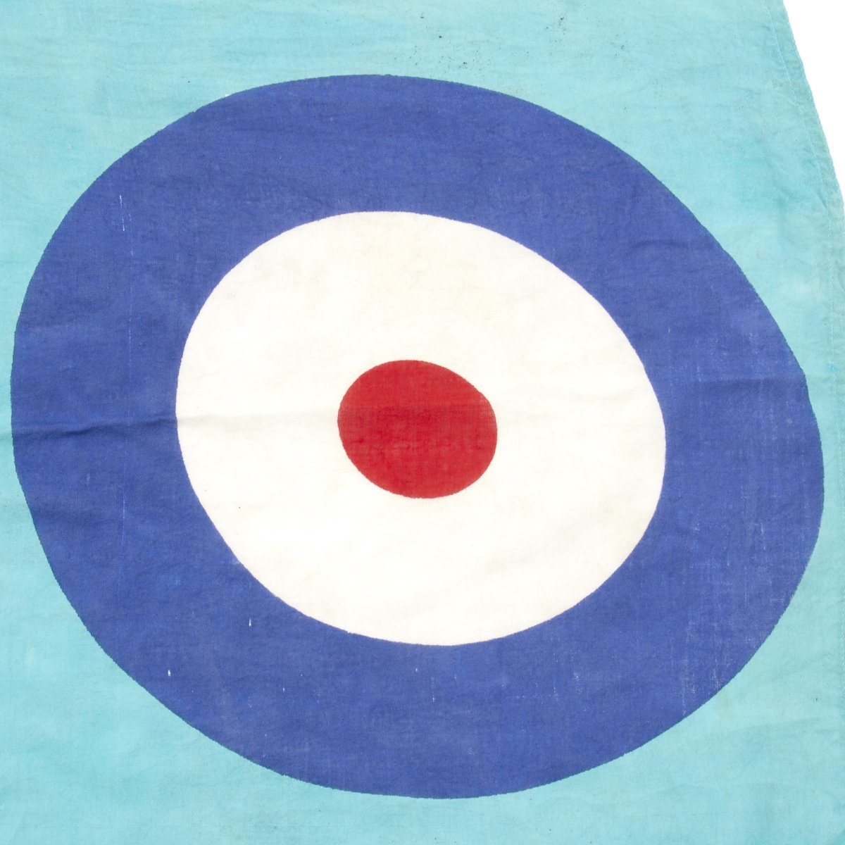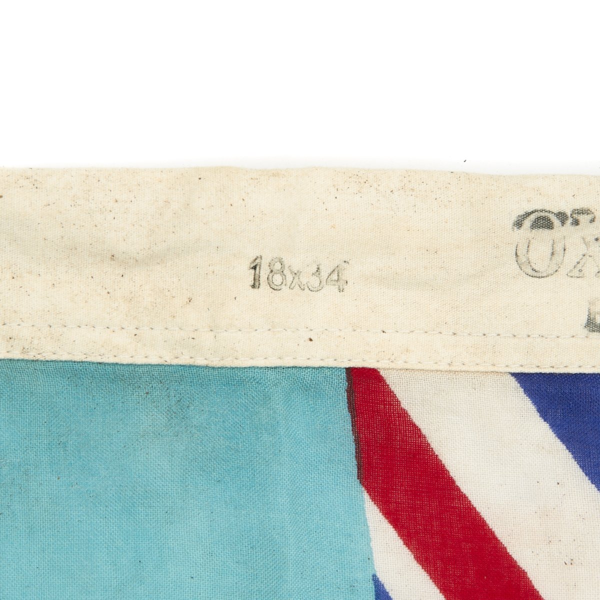Original Item. Only One Available. This is an original Official AIR MINISTRY marked R.A.F. FLAG used at ROYAL AIR FORCE Stations and Air Fields during WWII. The "field" of the flag is a very nice aqua color with a large R.A.F. Red/White/Blue Rondel in the center, with a British Union Jack in the upper left-hand "canton" next to the header. The size of of 18 x 34 is marked on the flag header, next to the maker city of OXFORD / ENGLAND and the date of 1939. Next to the header loop is the CROWN / A.M. marking of the Air Ministry