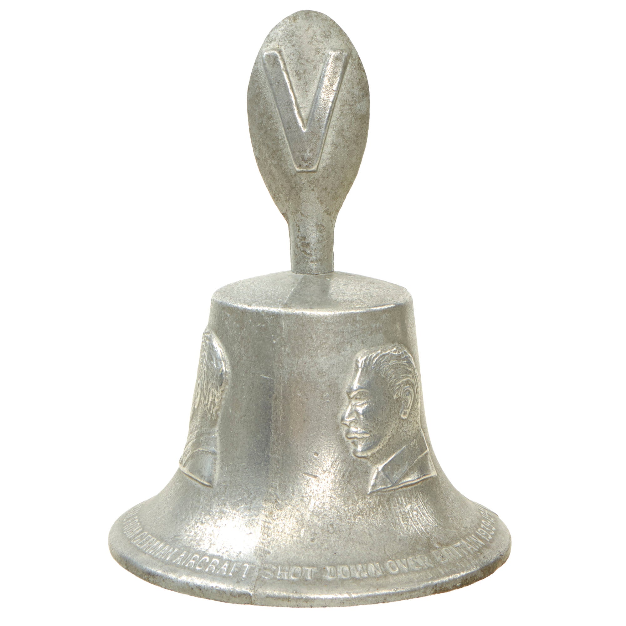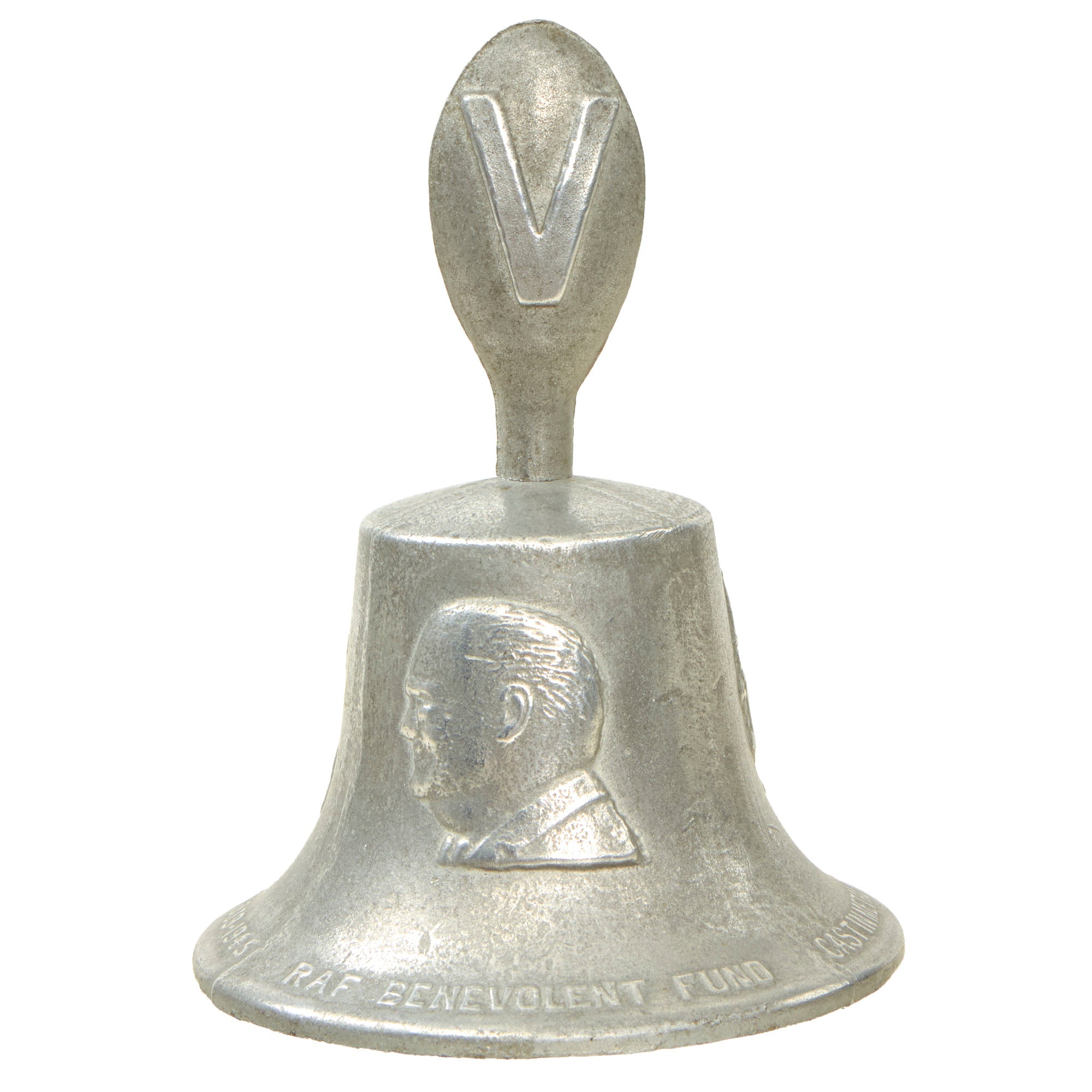 Original Item. Only One Available. This is a stellar “Victory Bell” issued by the Royal Air Force Benevolent Fund in 1945 after the war had ended. The bell features the profile of Winston Churchill, Franklin D. Roosevelt, and Joseph Stalin and reads along the bottom CAST IN METAL FROM GERMAN AIRCRAFT SHOT DOWN OVER BRITAIN 1939-1945 RAF BENEVOLENT FUND.
