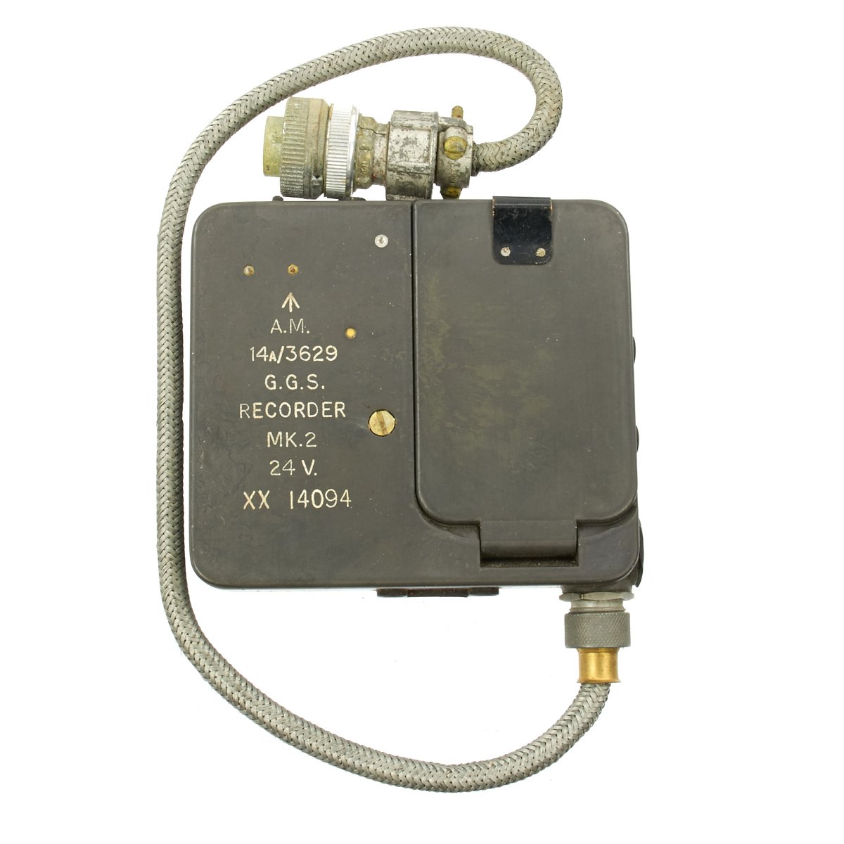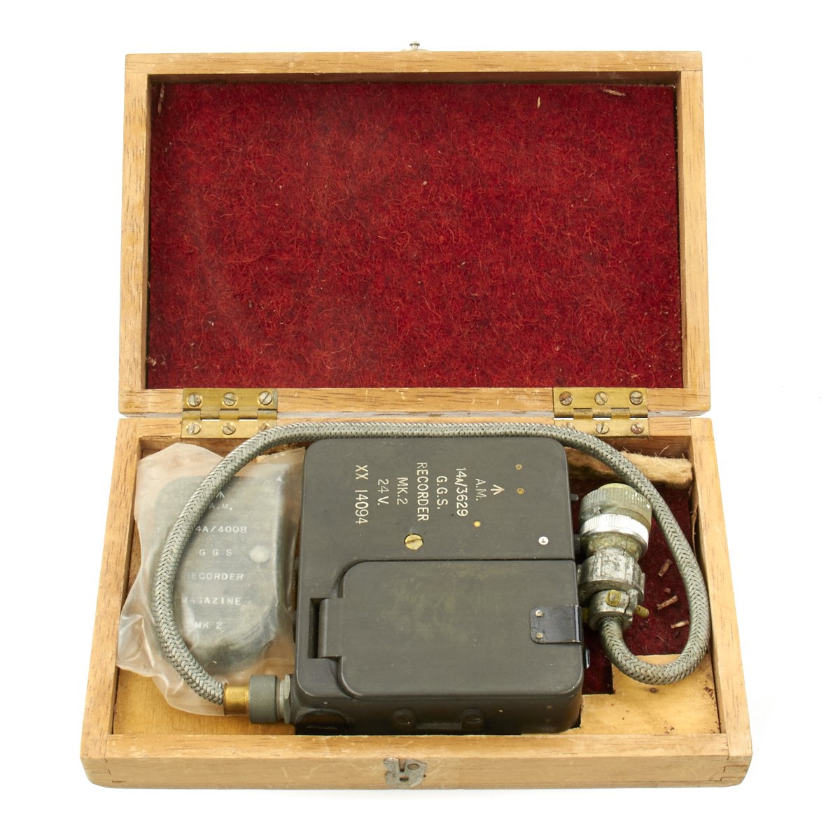 Original Item: Only One Available. This is a very nice British Air Ministry marked Gyro Gun Sight (G.G.S.) Recorder Camera, Mk2, in very good condition. It comes complete with its original transit case, as well as spare Tape Magazine. These were fitted to the Gun sights in various British fighter aircraft, to record what was being seen through the sight. The top of the recorder is marked: