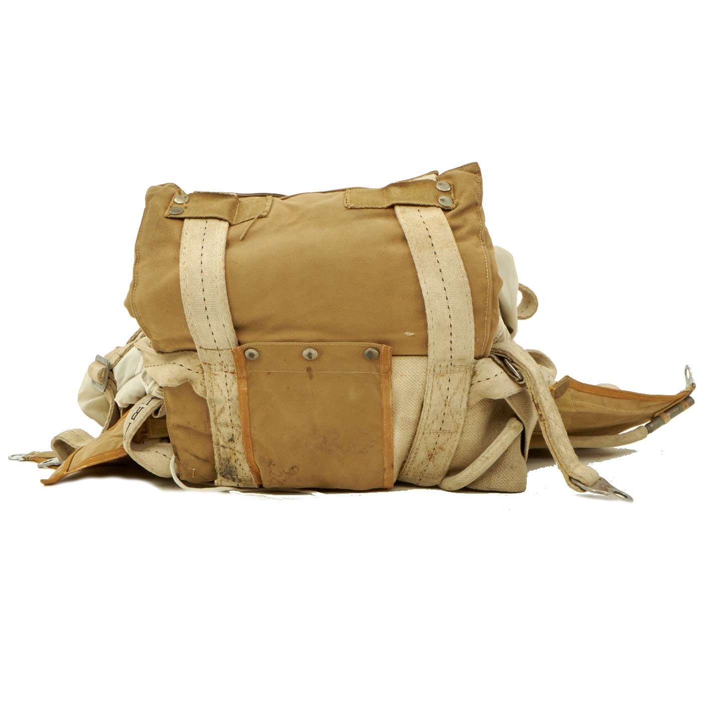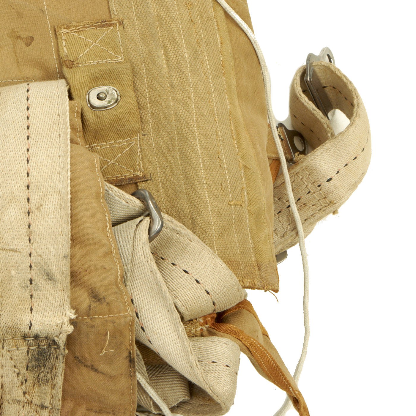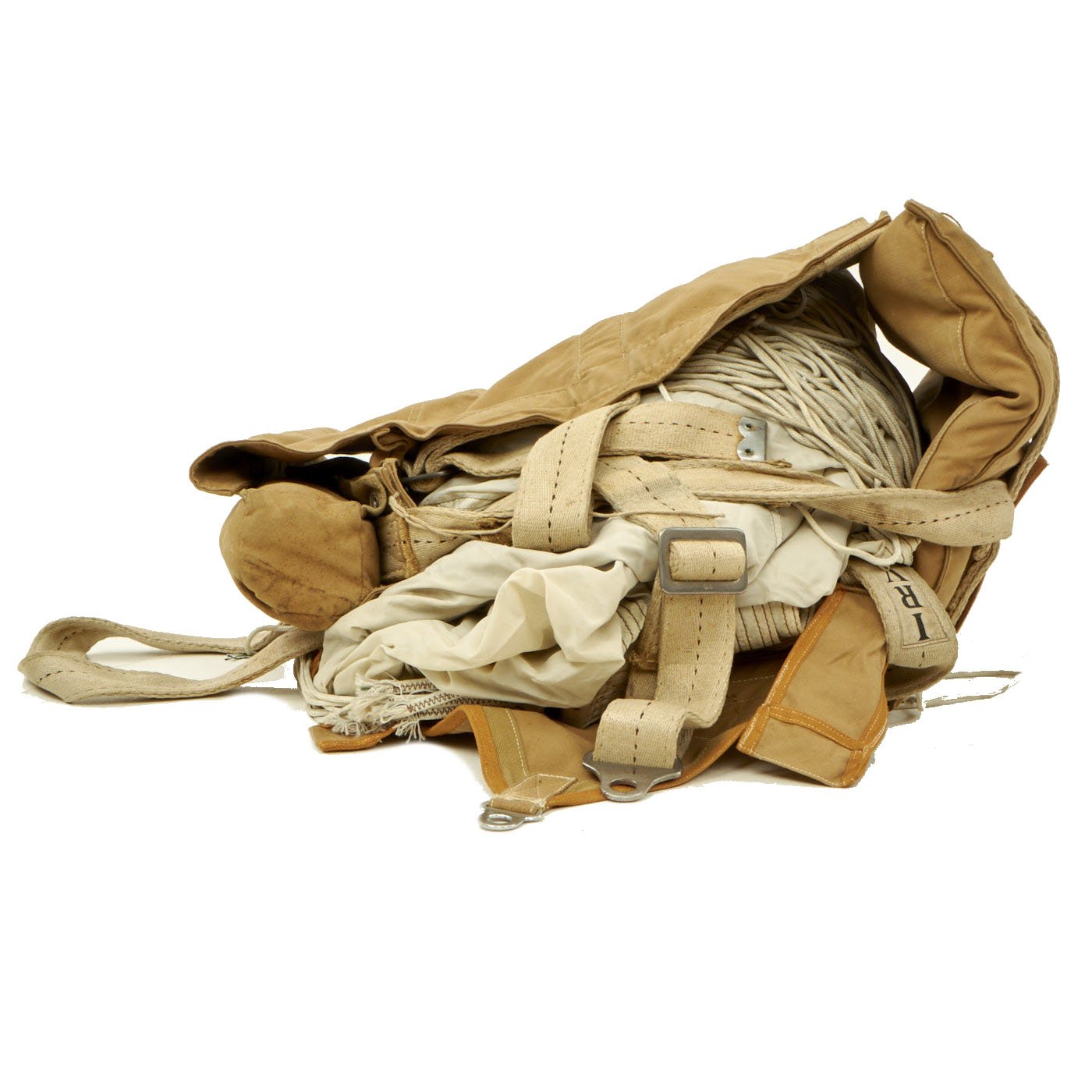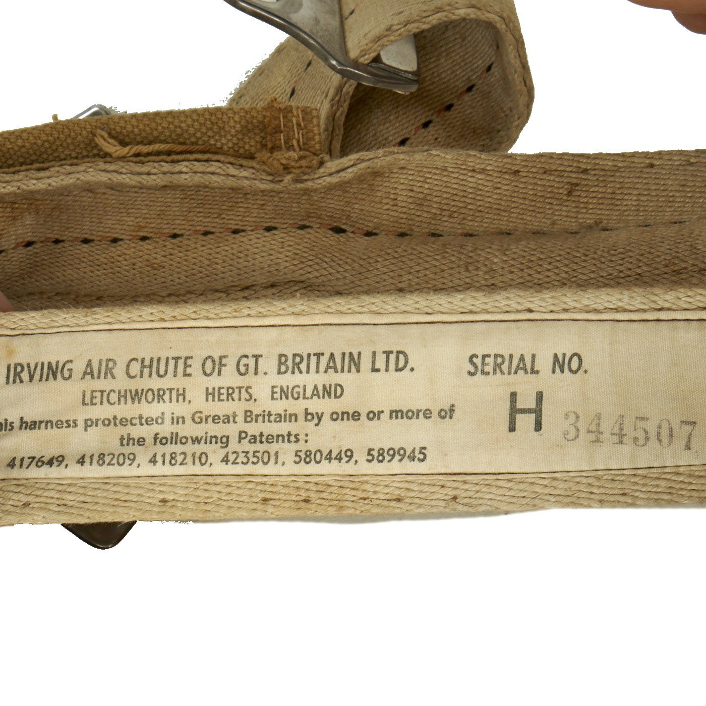 - Original Item: Only One Available. Royal Air Force Parachute, Single point, quick release. Commonly referred to as the 'pilot's parachute'. Classic white webbing with a central pale red/black fleck. Quick release (QR) box missing. The webbing harness is in very good clean condition. There is and Irvin Air Chute of Great Britain label with patent numbers. Parachute pack itself is in the usual sand colored canvas. Original Canopy is included, some parts of the pack/harness are absent but overall appears to be in very good condition.
