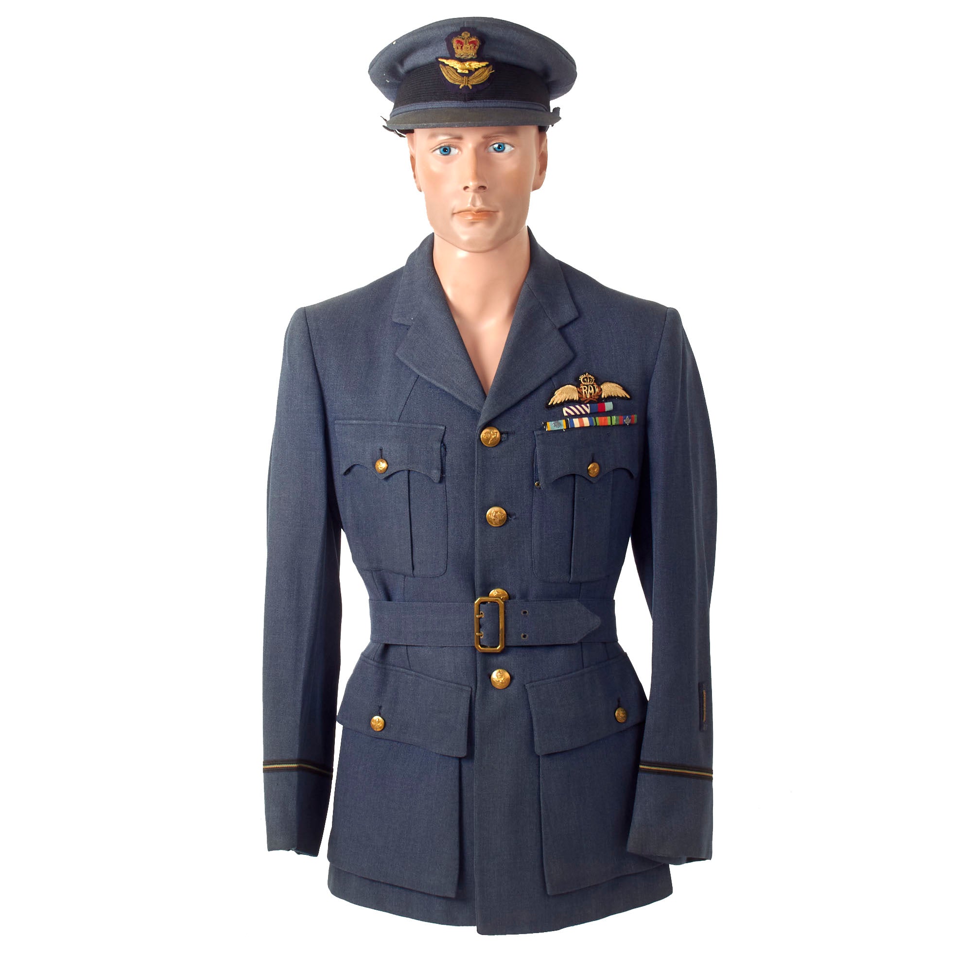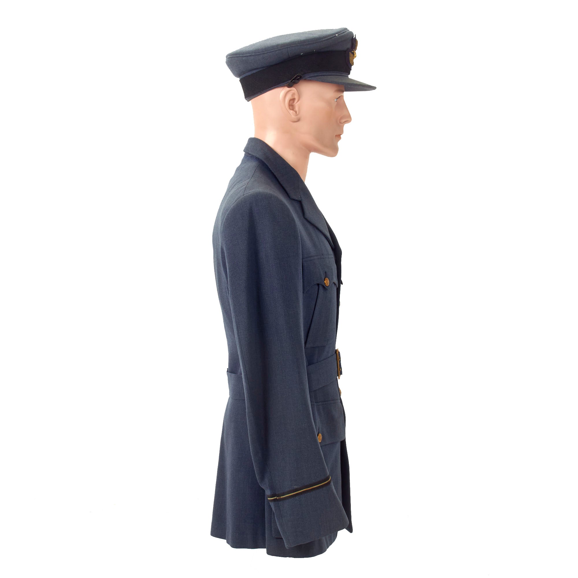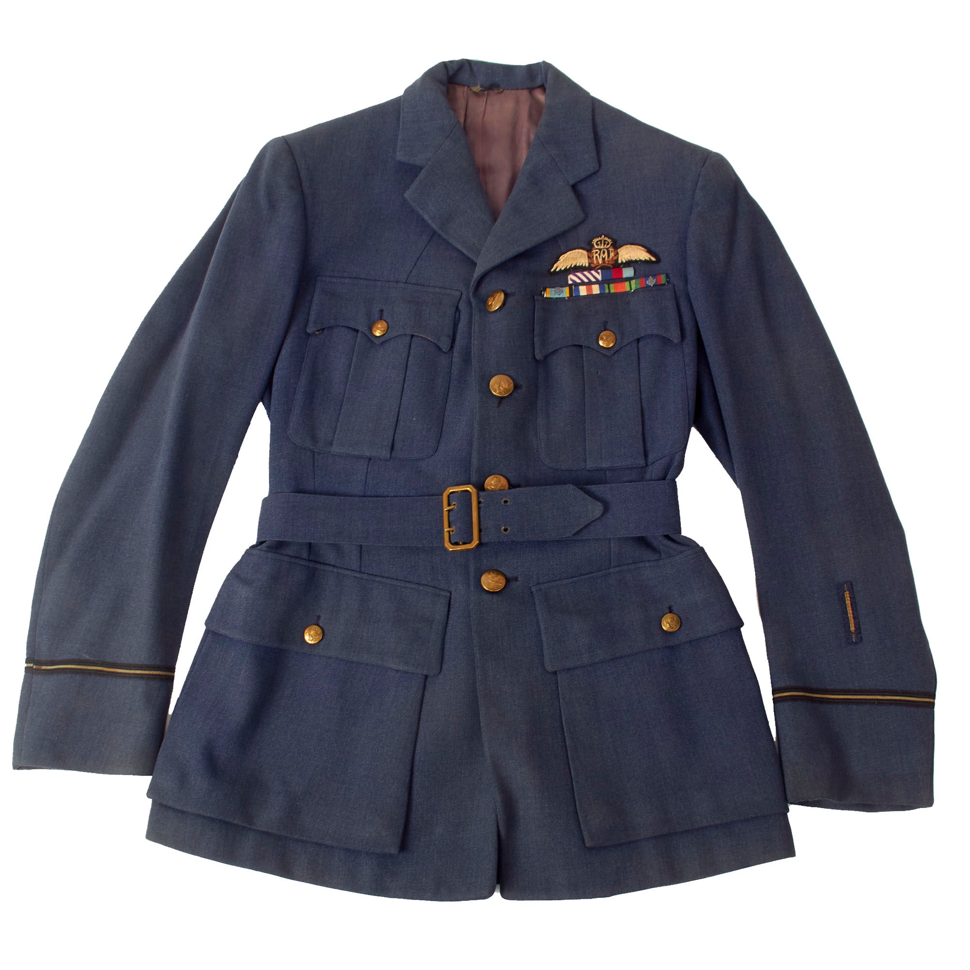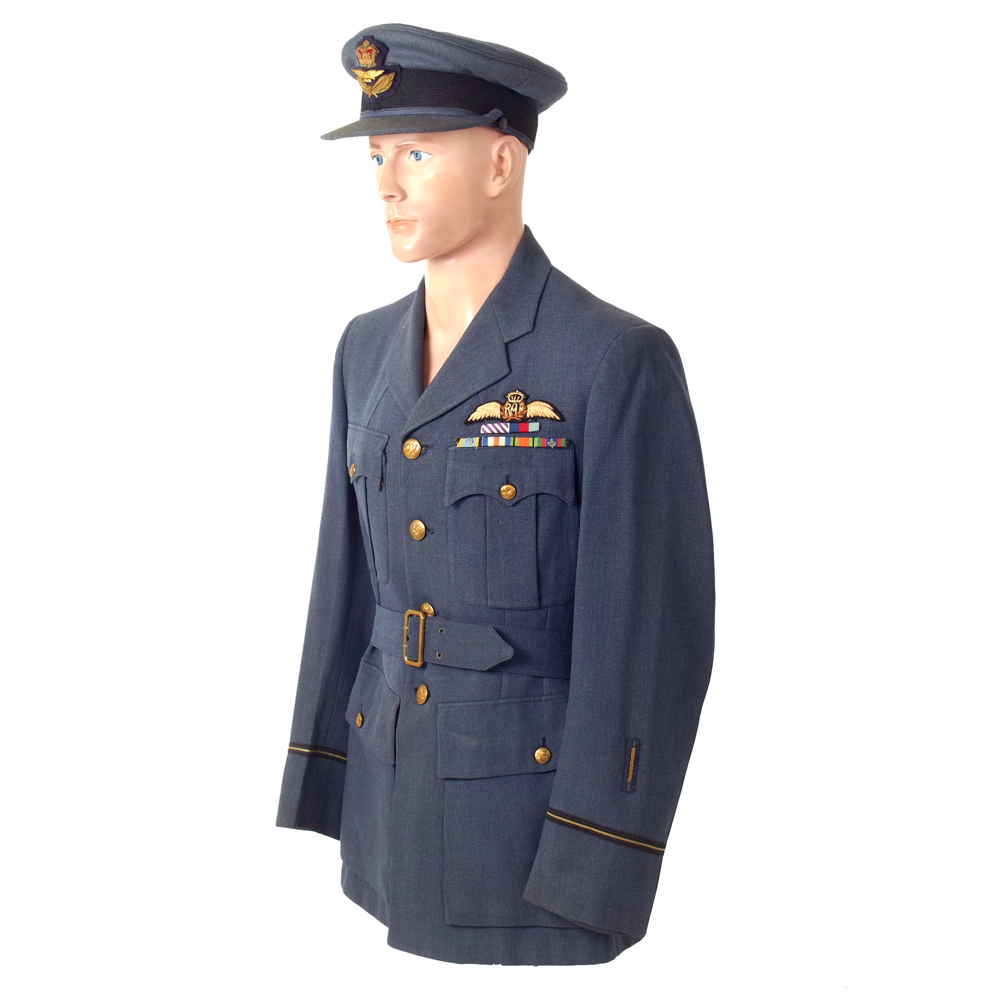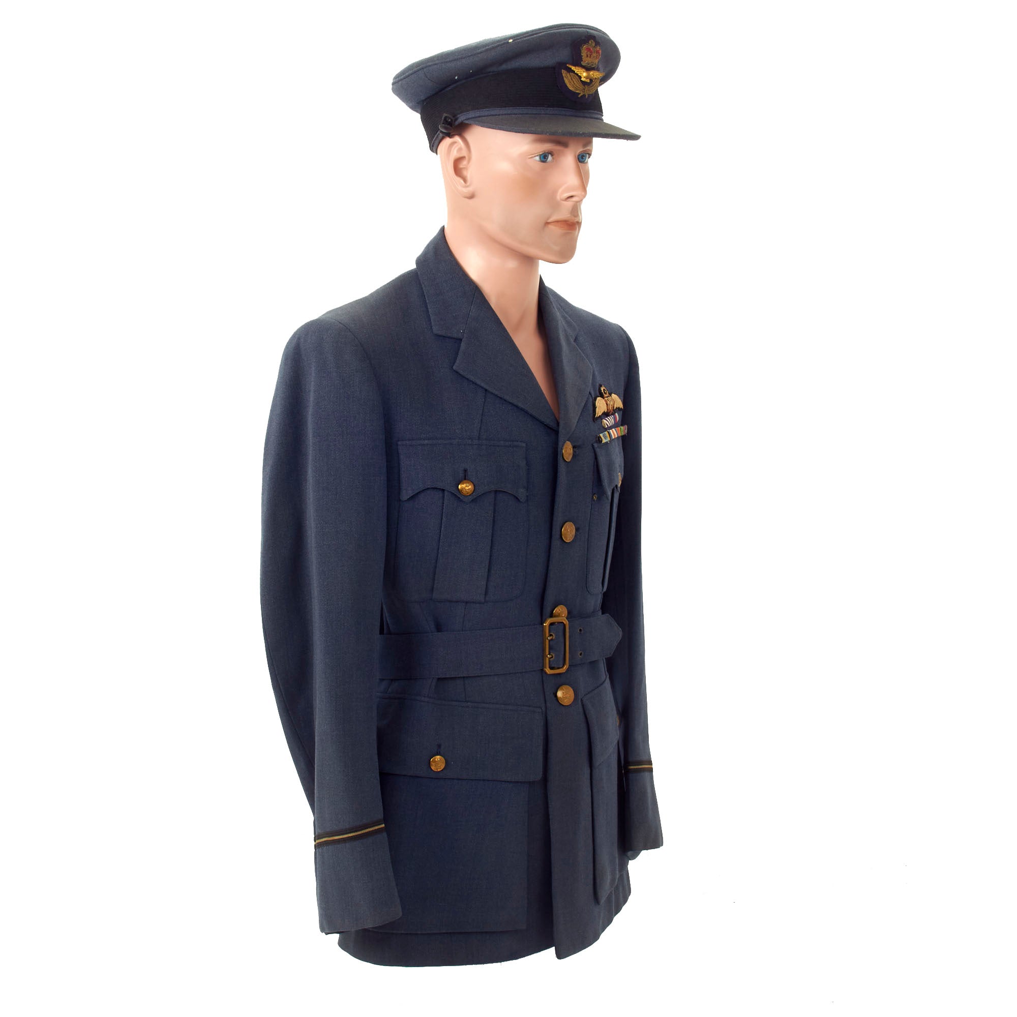 Original Item: Only One Available. This is a wonderful example of an RAF Officer’s “smooth blue” service dress uniform. We believe this uniform to belong to Flying Officer Robert Gray Holden, due to the last name written inside of the trousers and the Canadian Volunteer Service Medal on the ribbon stack, though we are not completely certain. The uniform has a few interesting variables in it, one being the British RAF pilot wings (not RCAF) and the Canadian Volunteer award on the ribbon stack which was awarded to Canadians. We have not been able to find an solid information on the pilot, but we did come across a rather interesting story from despatches he was mentioned in:
