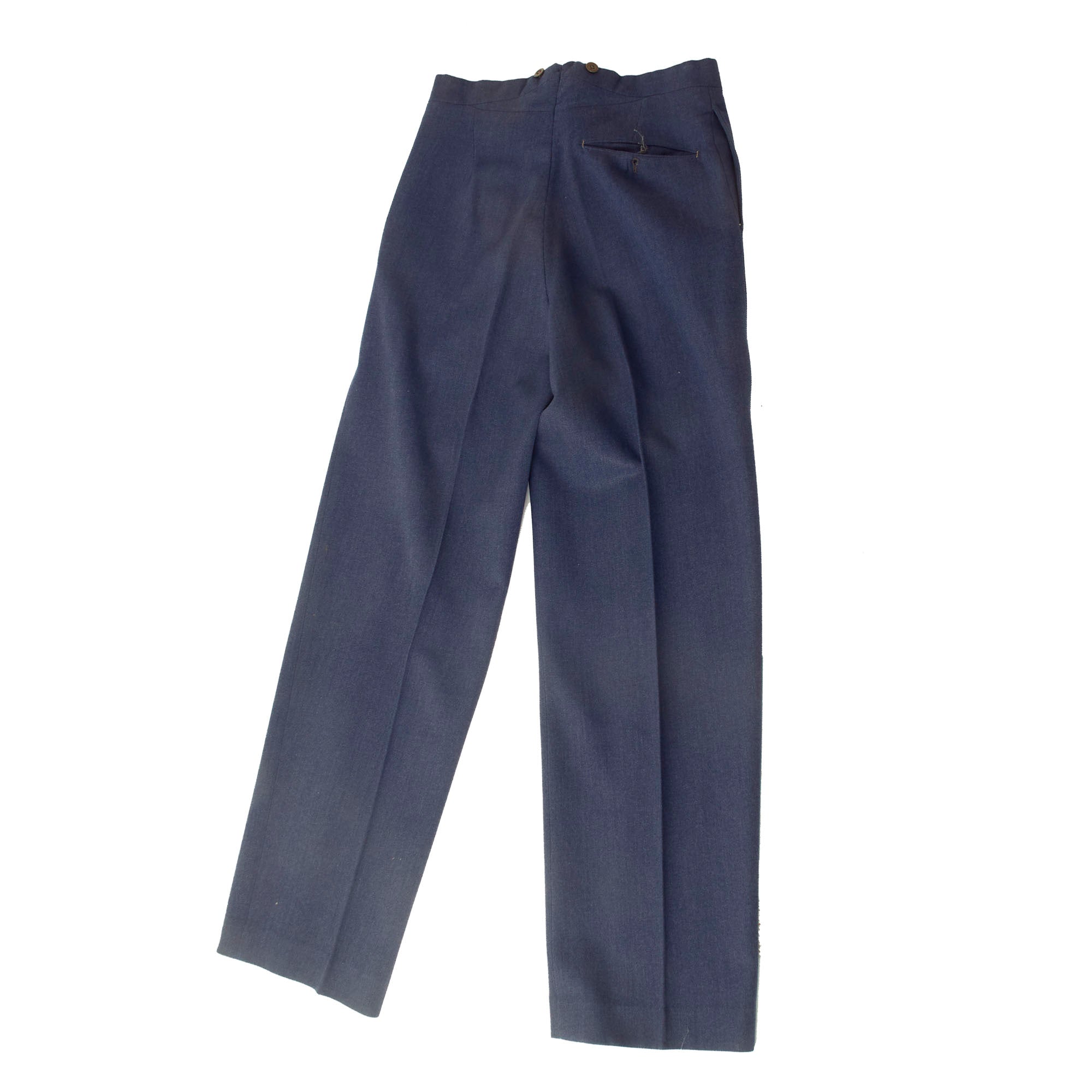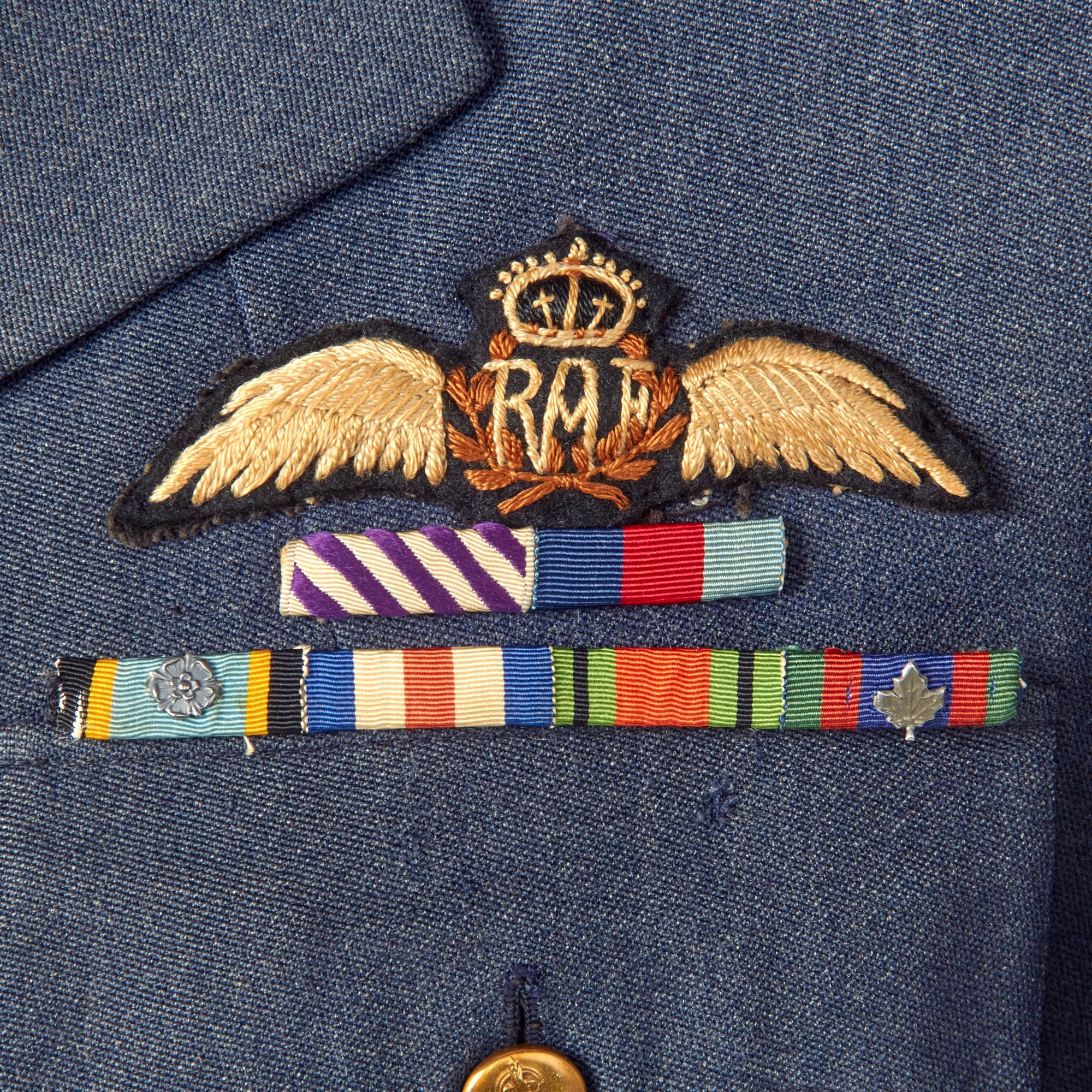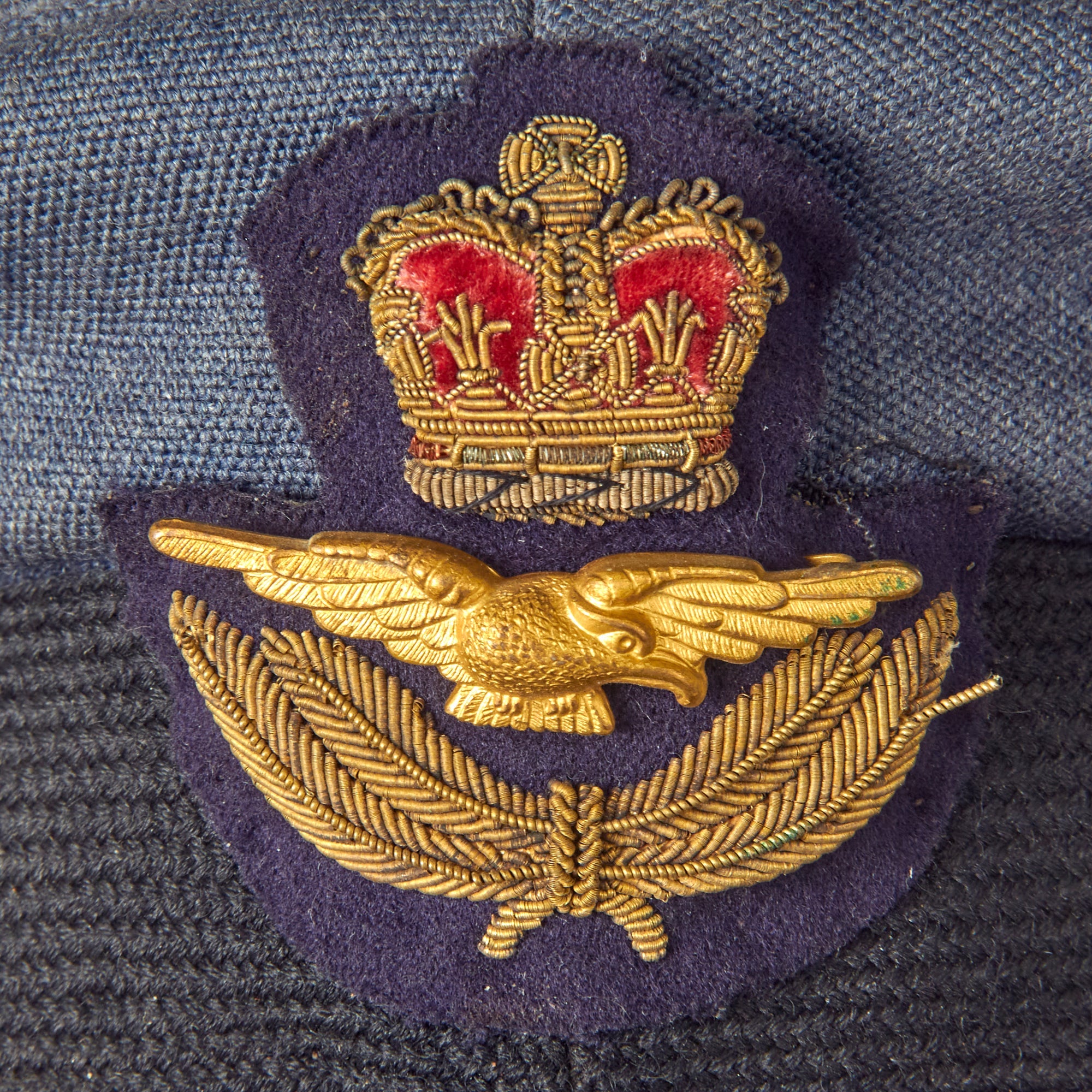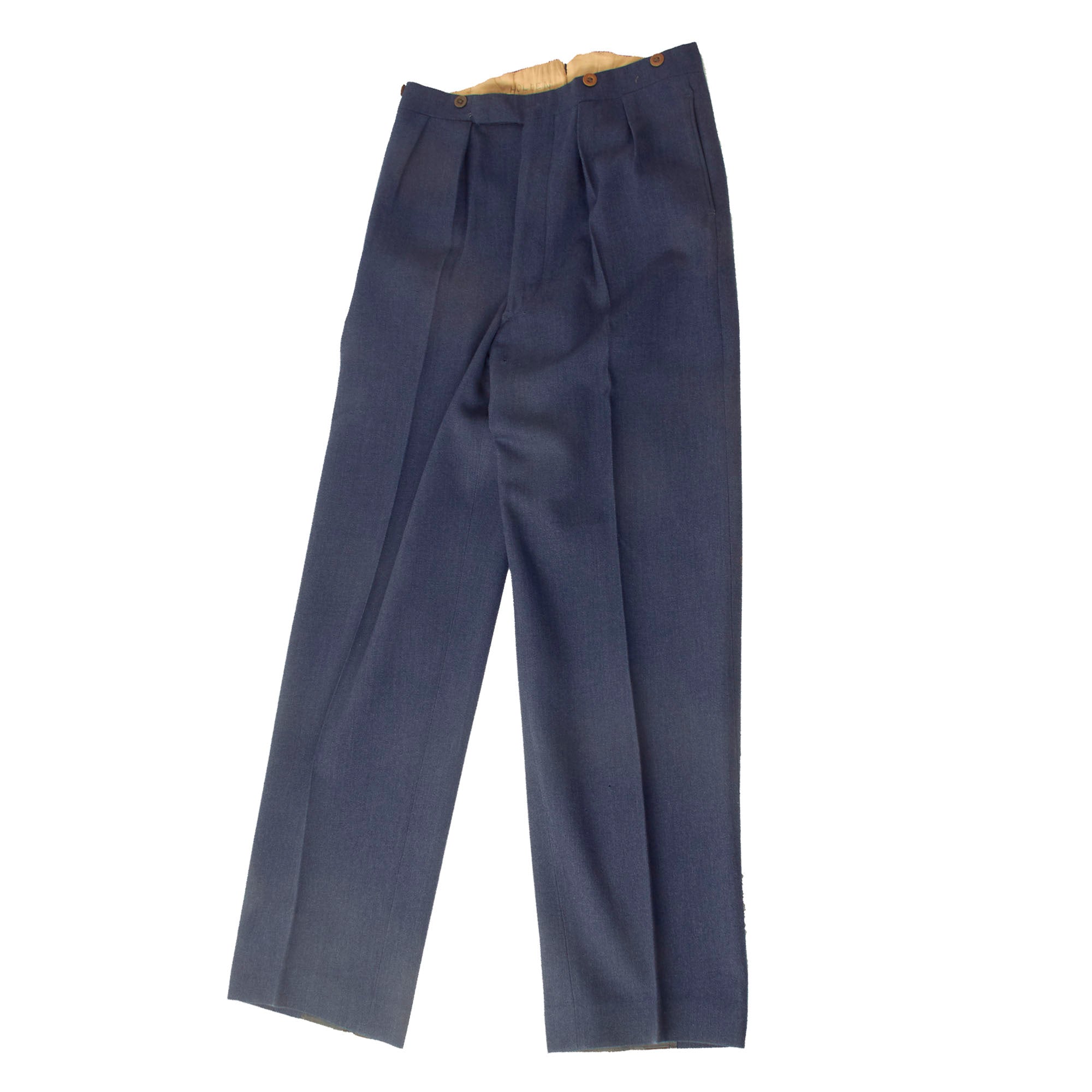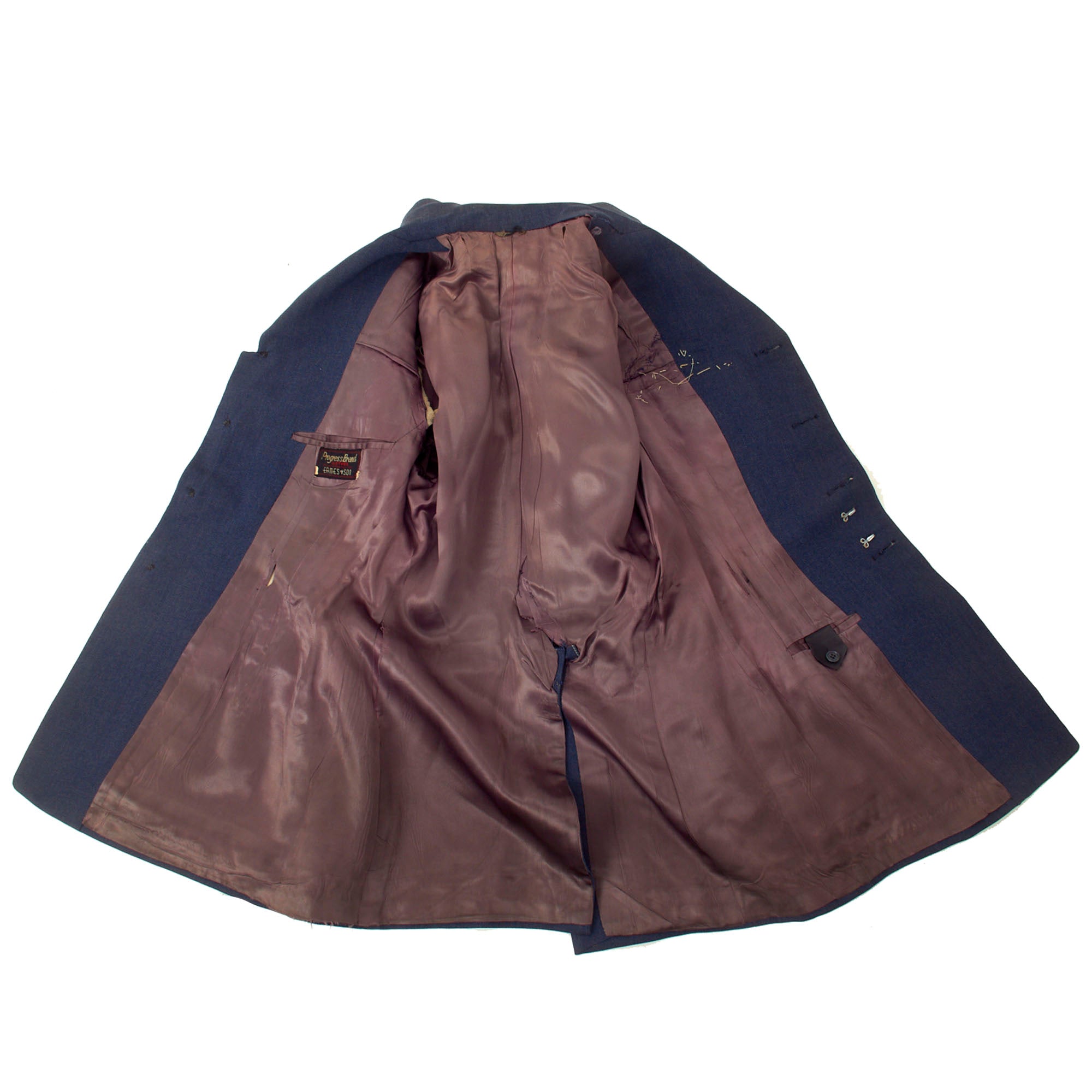 Original Item: Only One Available. This is a wonderful example of an RAF Officer’s “smooth blue” service dress uniform. We believe this uniform to belong to Flying Officer Robert Gray Holden, due to the last name written inside of the trousers and the Canadian Volunteer Service Medal on the ribbon stack, though we are not completely certain. The uniform has a few interesting variables in it, one being the British RAF pilot wings (not RCAF) and the Canadian Volunteer award on the ribbon stack which was awarded to Canadians. We have not been able to find an solid information on the pilot, but we did come across a rather interesting story from despatches he was mentioned in: