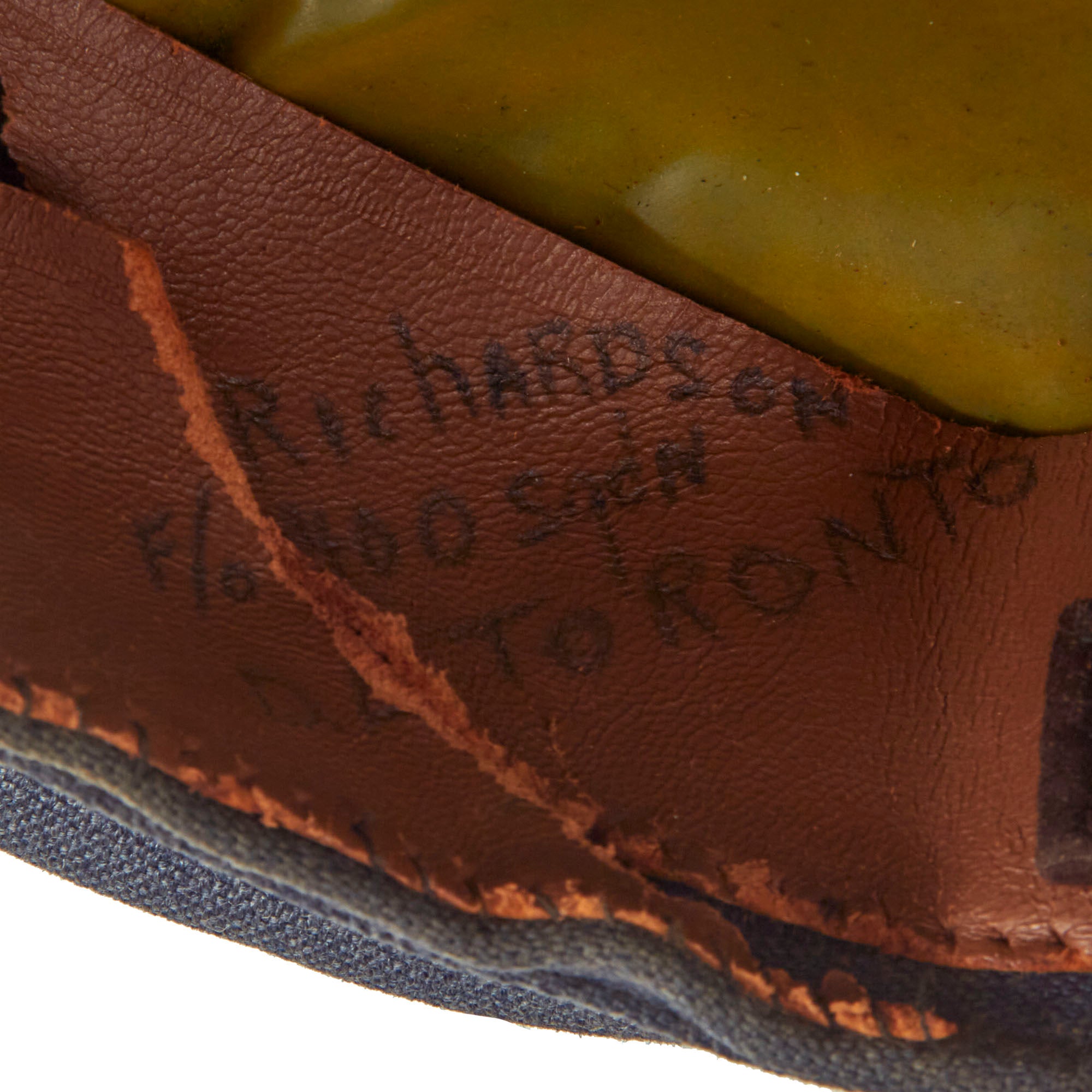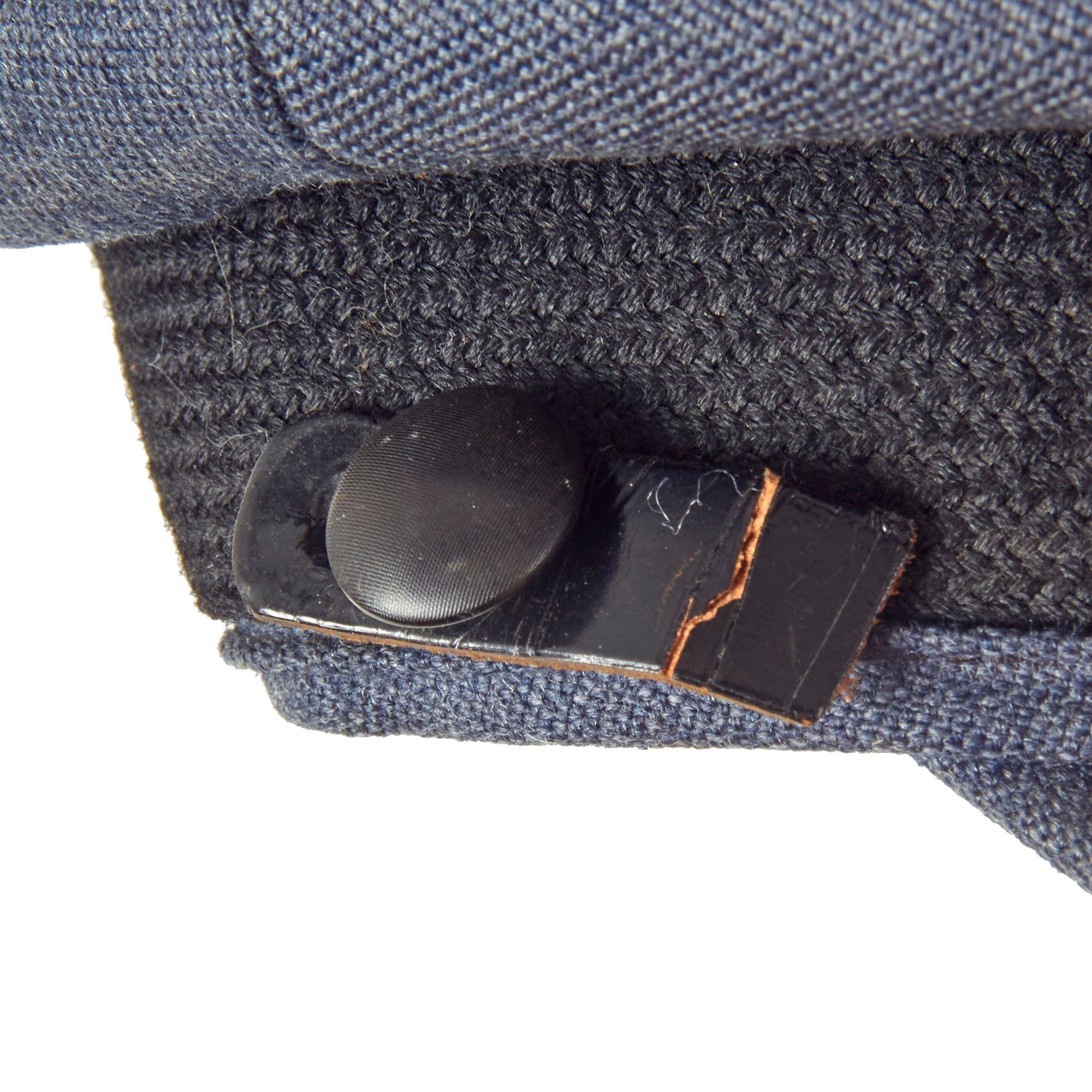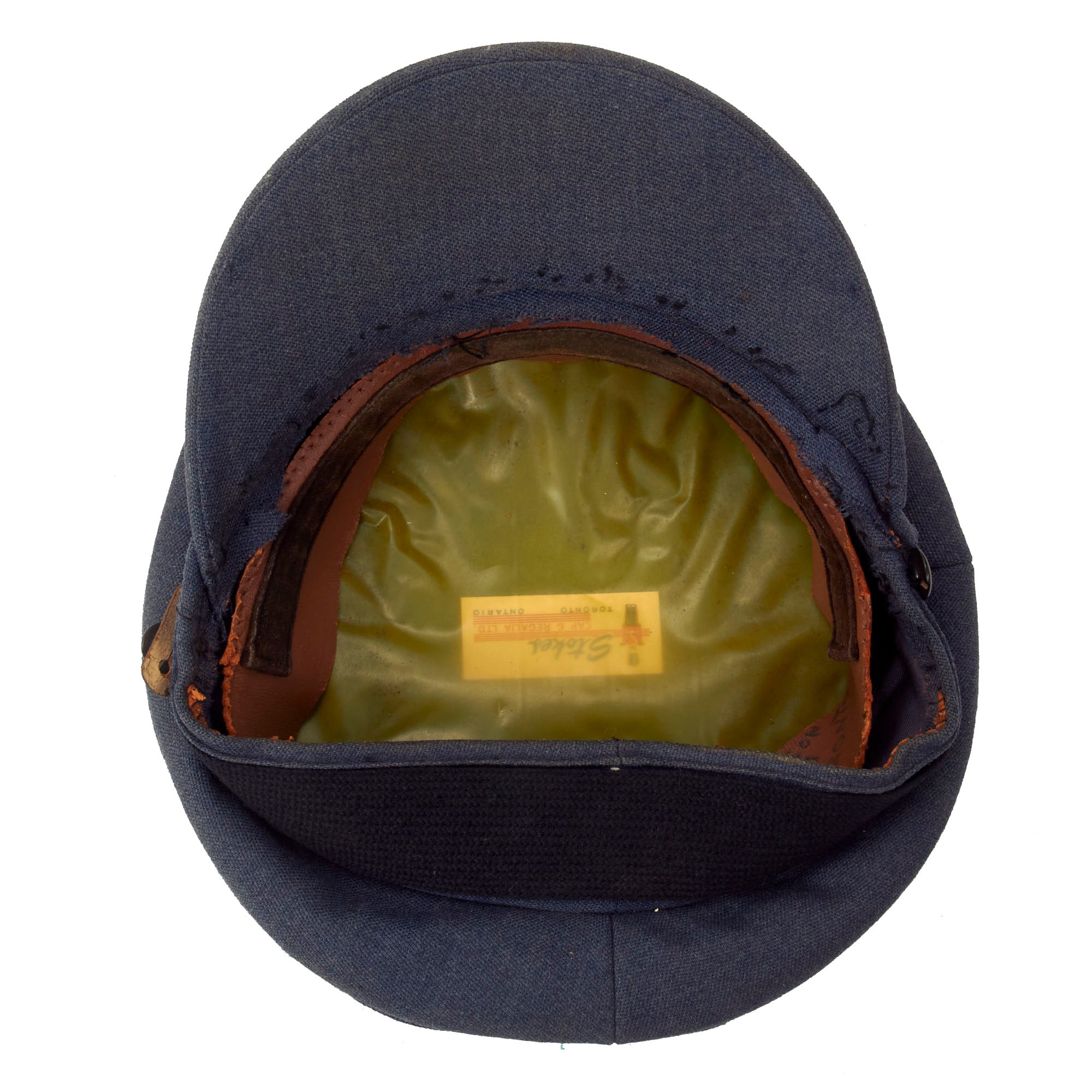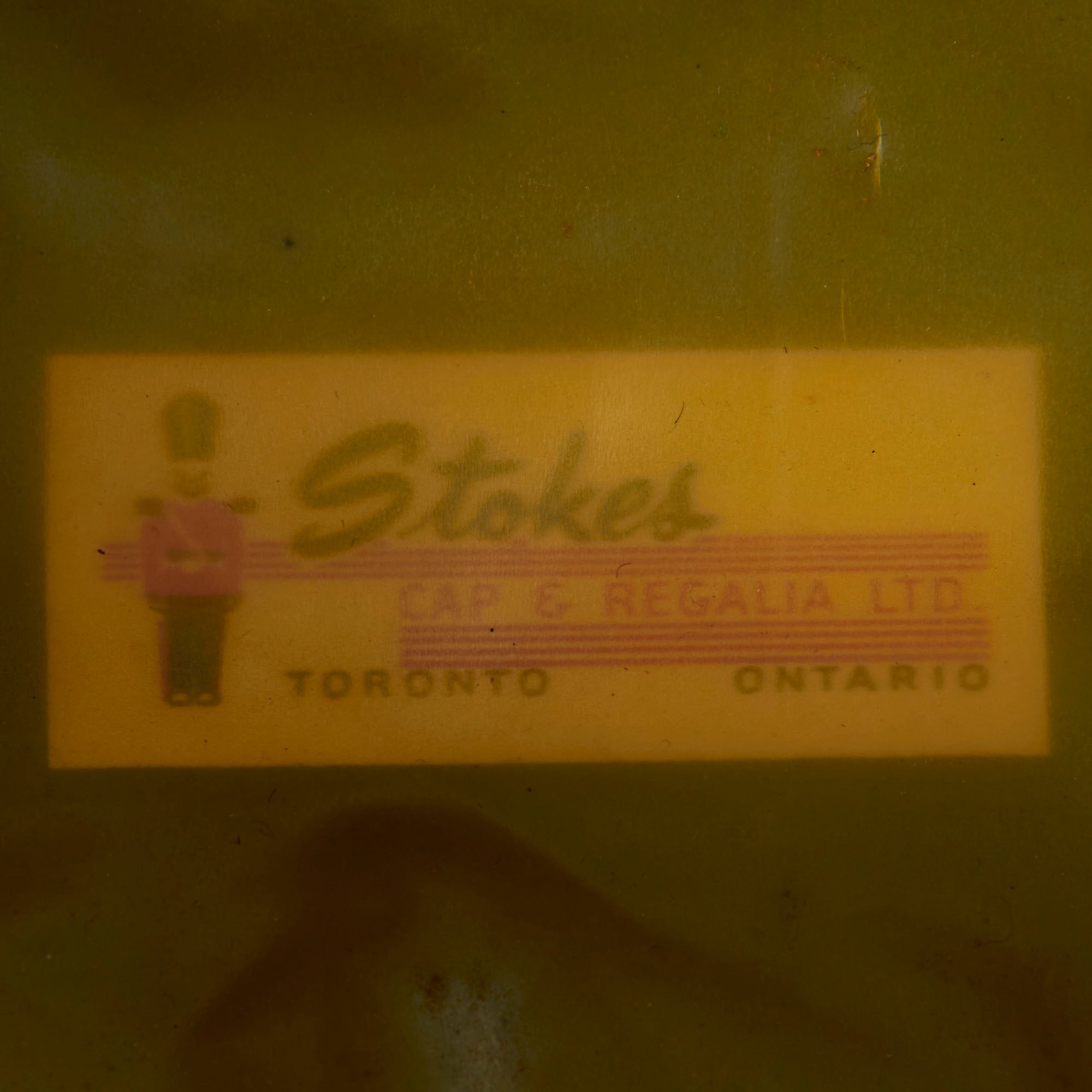 The peaked visor was an addition to the uniform to complete a wonderful display appearance. The visor itself appears to be a late war or immediate post war produced version and has a leather liner that is torn and almost completely detached. The crown insignia which can be removed witht he hat band is a queens crown (post 1952 for Elizabeth). There is a name present in the visor but we have not made any attempts to locate service information.
