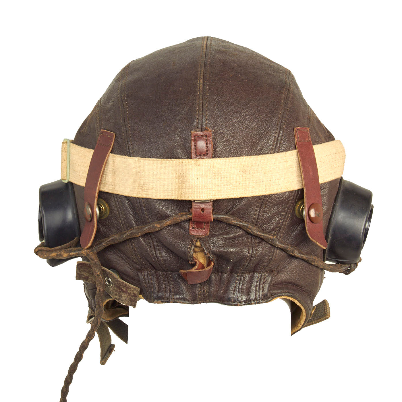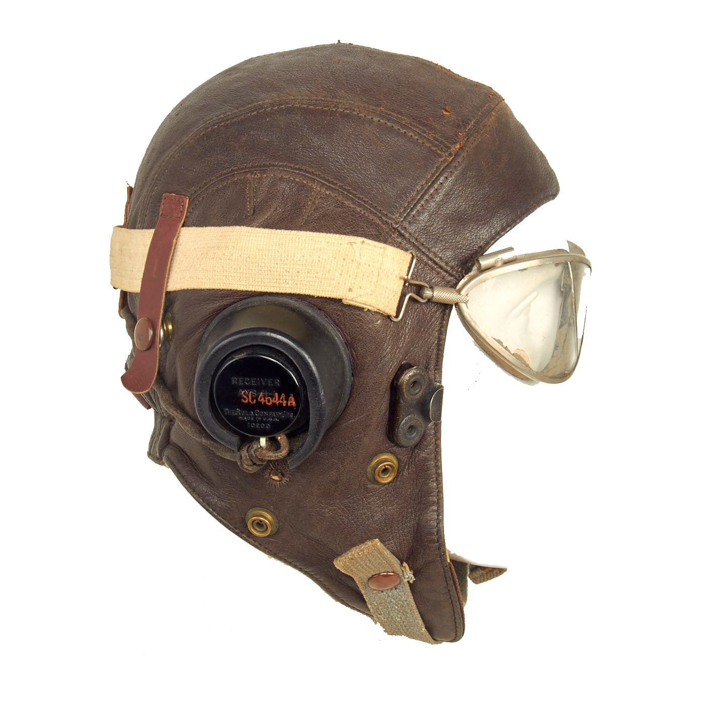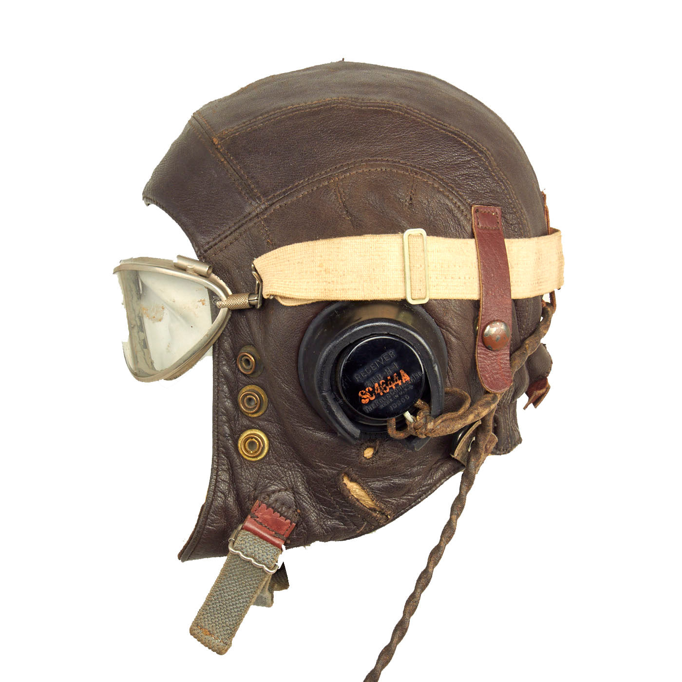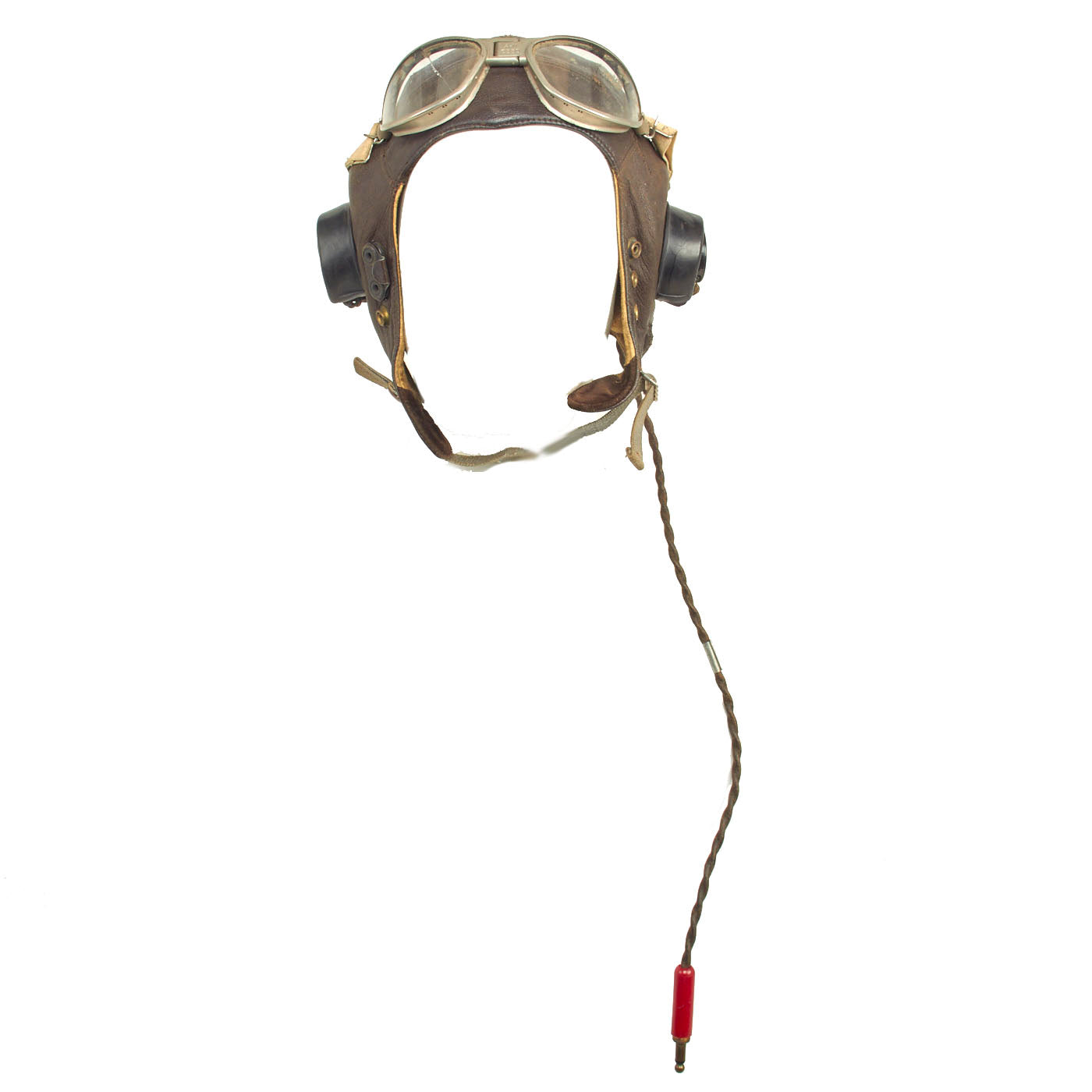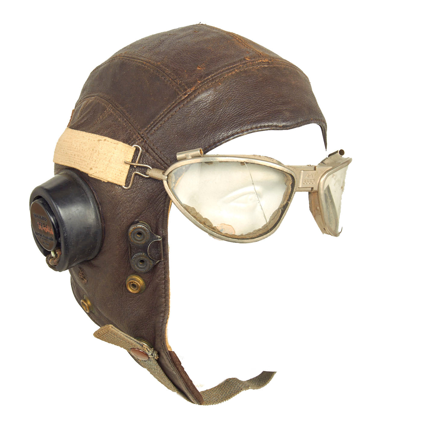 Original Items: Only One Set Available. This is a wonderful World War Two Royal Air Force brown leather chamois-lined flying helmet with elastic snap chinstrap. This fine example comes with front goggle straps and features an elastic chinstrap and a built in clip on the right side to accommodate the oxygen mask attachment hook.