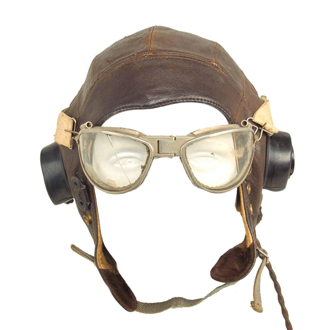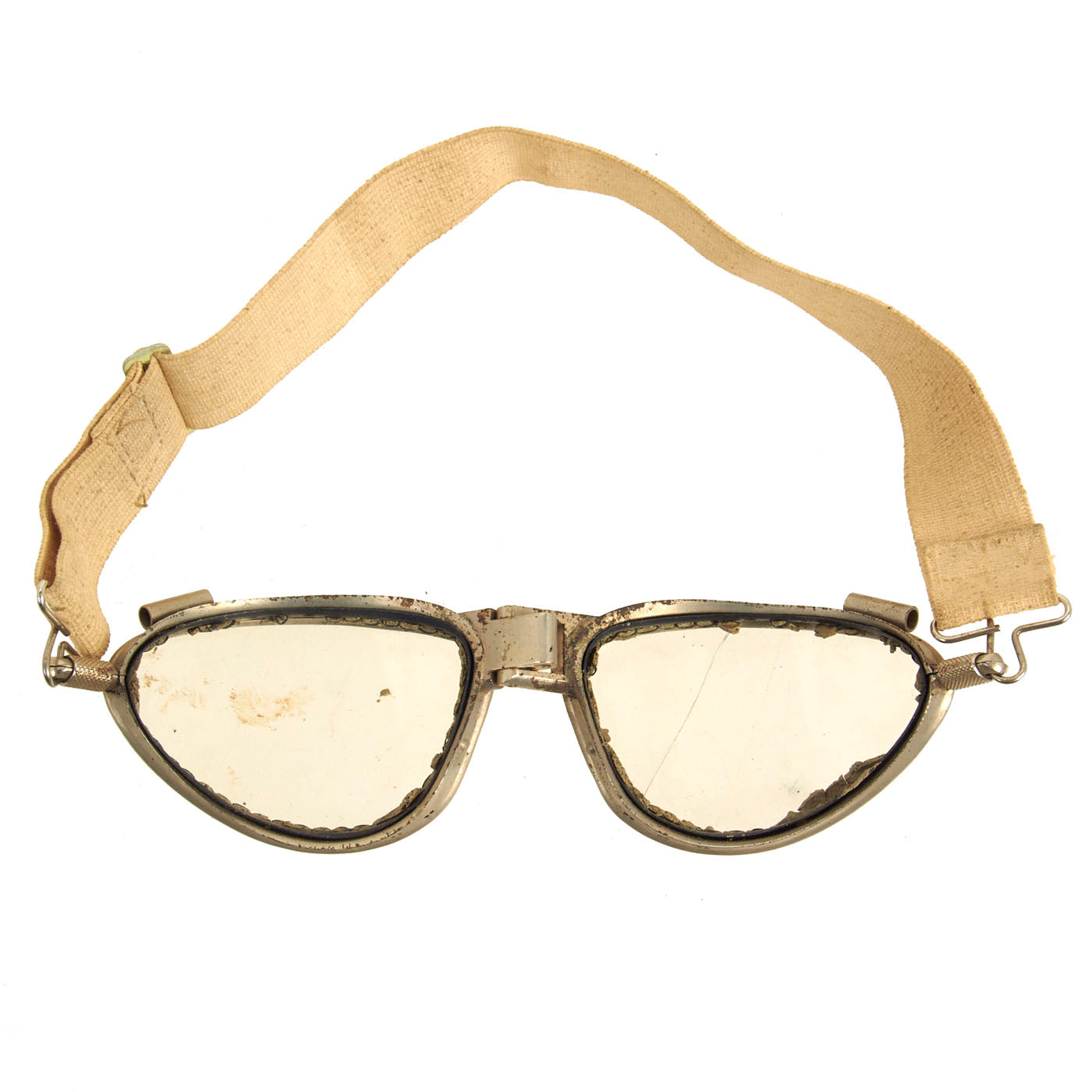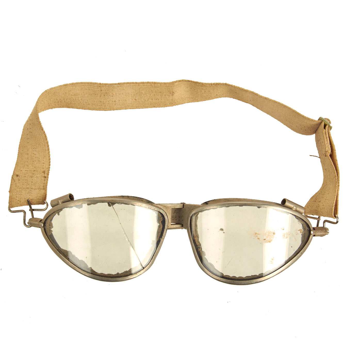 The goggles are classic A-N 6530 goggles. AN-6530 Goggles were produced during World War II as eye protection for United States Army and Navy flight crews. In 1943, the AN-6530 design replaced as standard the nearly identical USAAF B-7 goggle produced by Chas Fischer Spring Company of Brooklyn, New York. Contracts for AN-6530 goggles were awarded to Chas Fischer Spring Co. and American Optical.