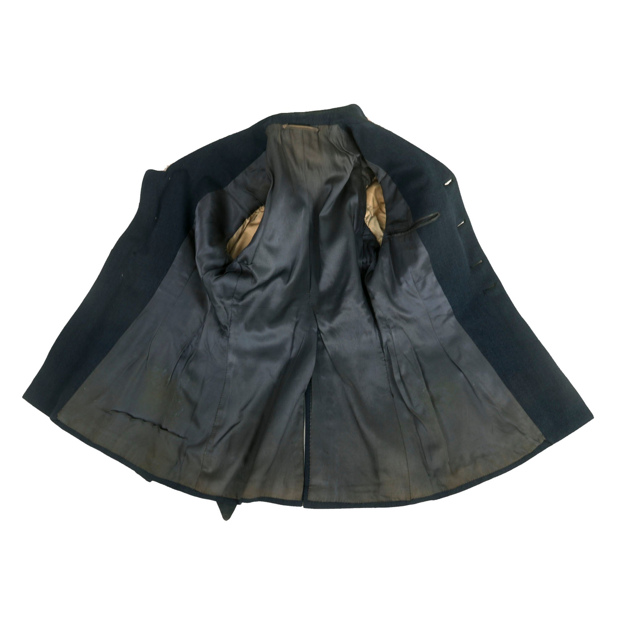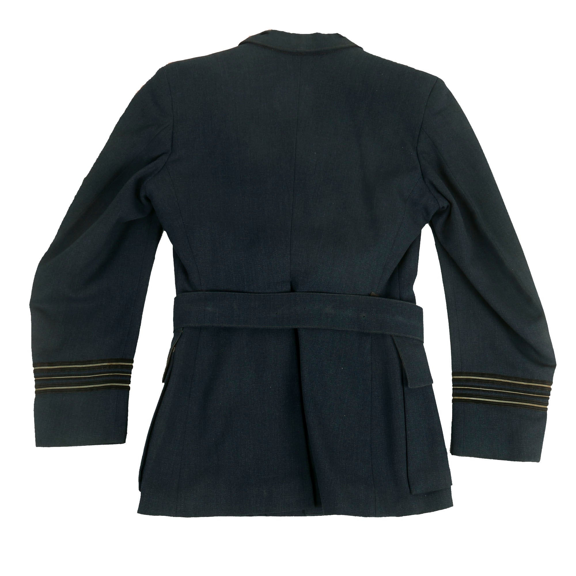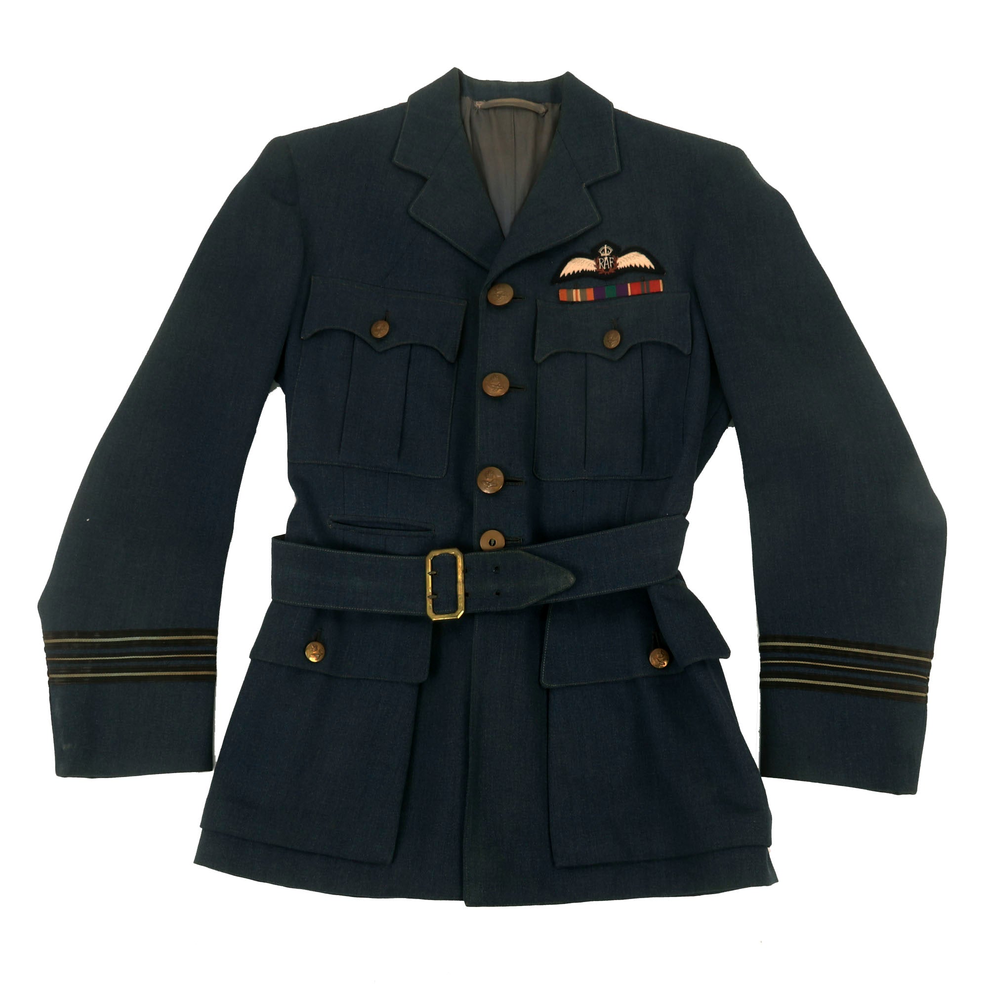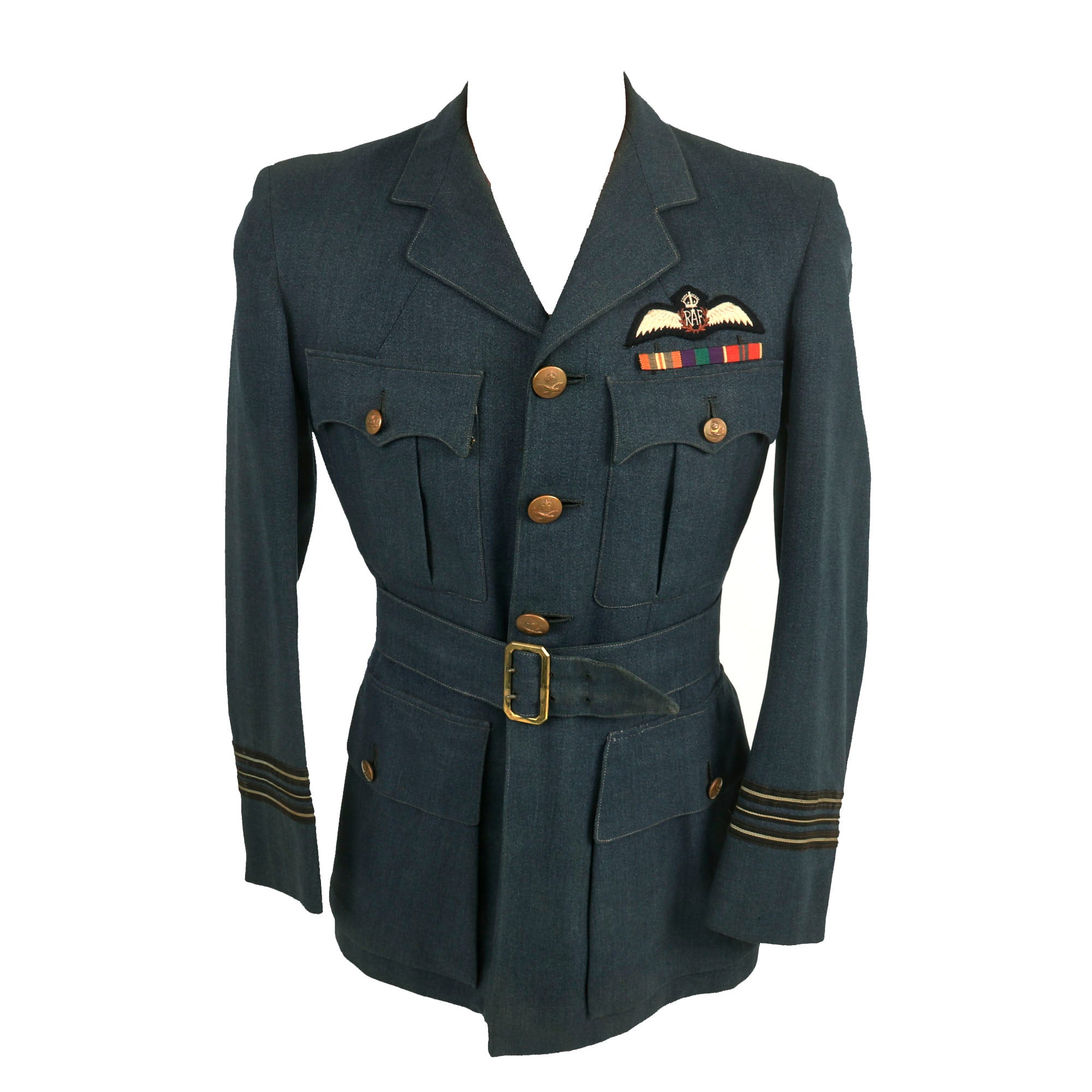 - Blue wool RAF officer tunic marked to the rank of Squadron Leader. Approximates size US 40 offered in very good condition. Features embroidered RAF wings, and medal ribbons for the 1939 War Medal, the General Service Medal, and the Queen Elizabeth II Coronation Medal. The internal chest pocket bears a tailor label from MOSS BROS & CO LTD of London, W.C. and is ink marked E/LT. A. R. SATON BR27/413. The jacket is in fantastic condition with a few condition issues. The front right breast pocket is missing one of its snaps. The belt still functions very well.