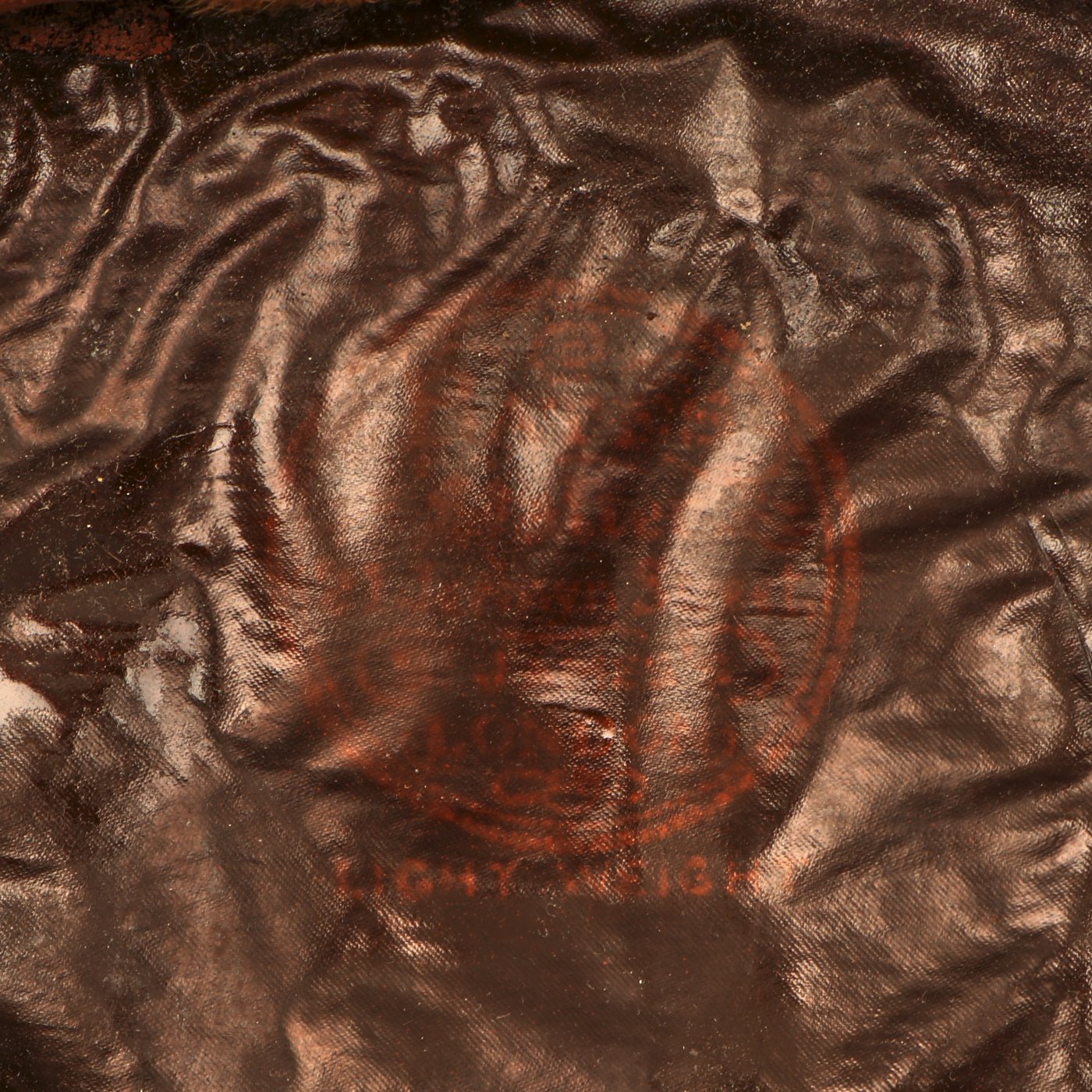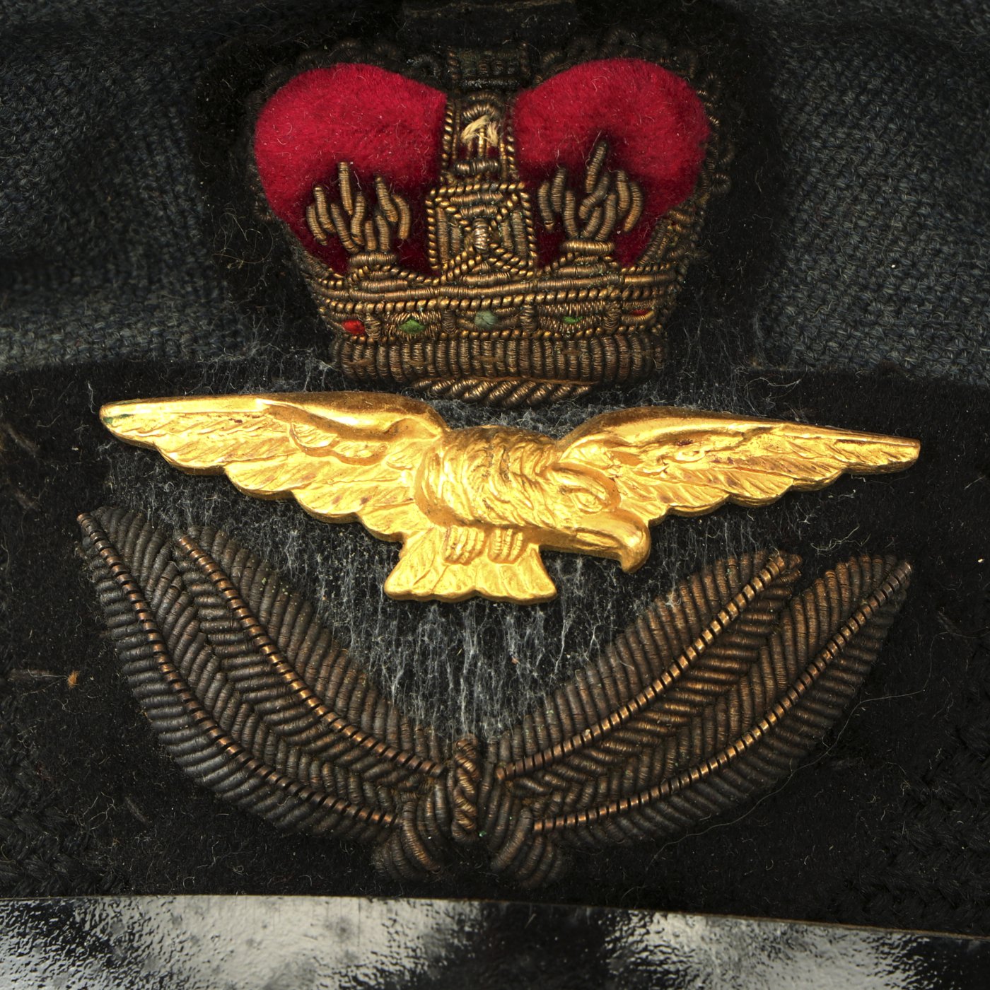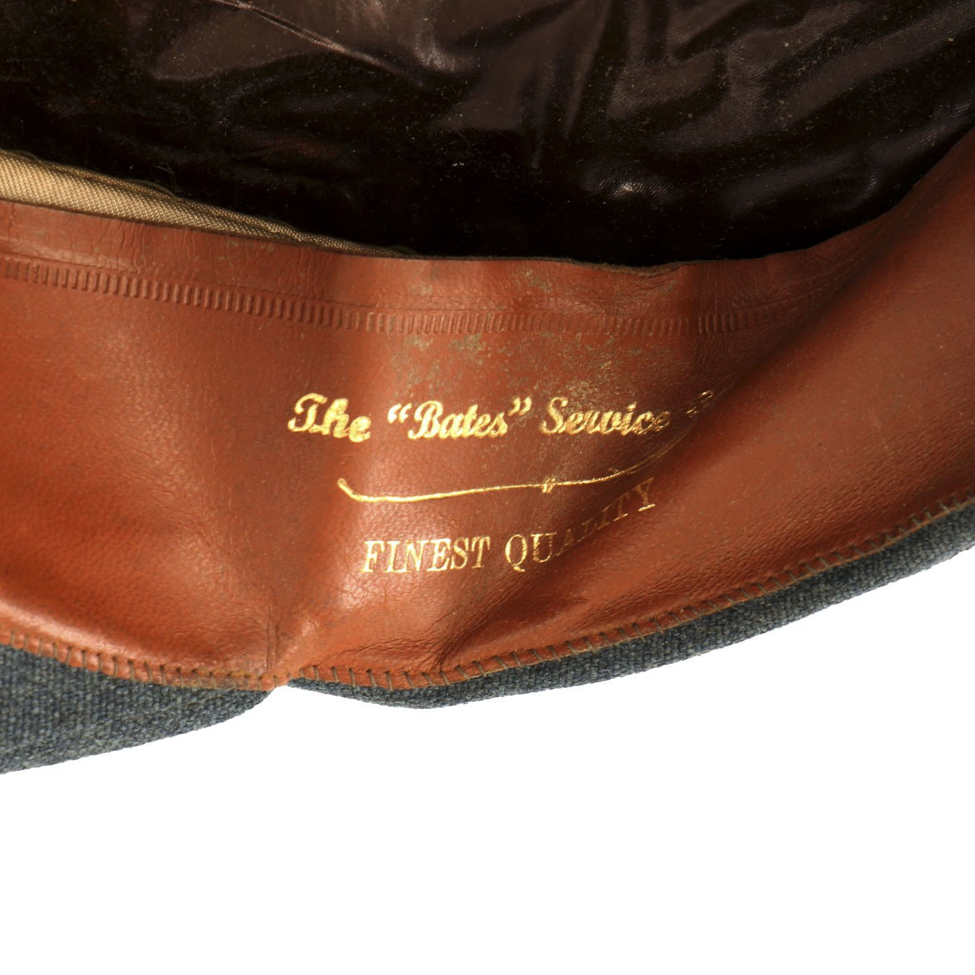 The sweatband also notes that this is The "Bates" Service Cap and is of FINEST QUALITY. It is constructed of the usual Royal Air Force blue barathea wool with a black mohair band. The style of the cap, and the celluloid sweat shield are definitely WWII Period. However, the padded bullion embroidered cap badge has a QUEEN'S CROWN on the top, not the expected King's Crown. It has the correct laurel leaves below a gold washed metal eagle, so we believe that this cap was owned by an officer who remained in service after 1952, when Queen Elizabeth II assumed the British throne.