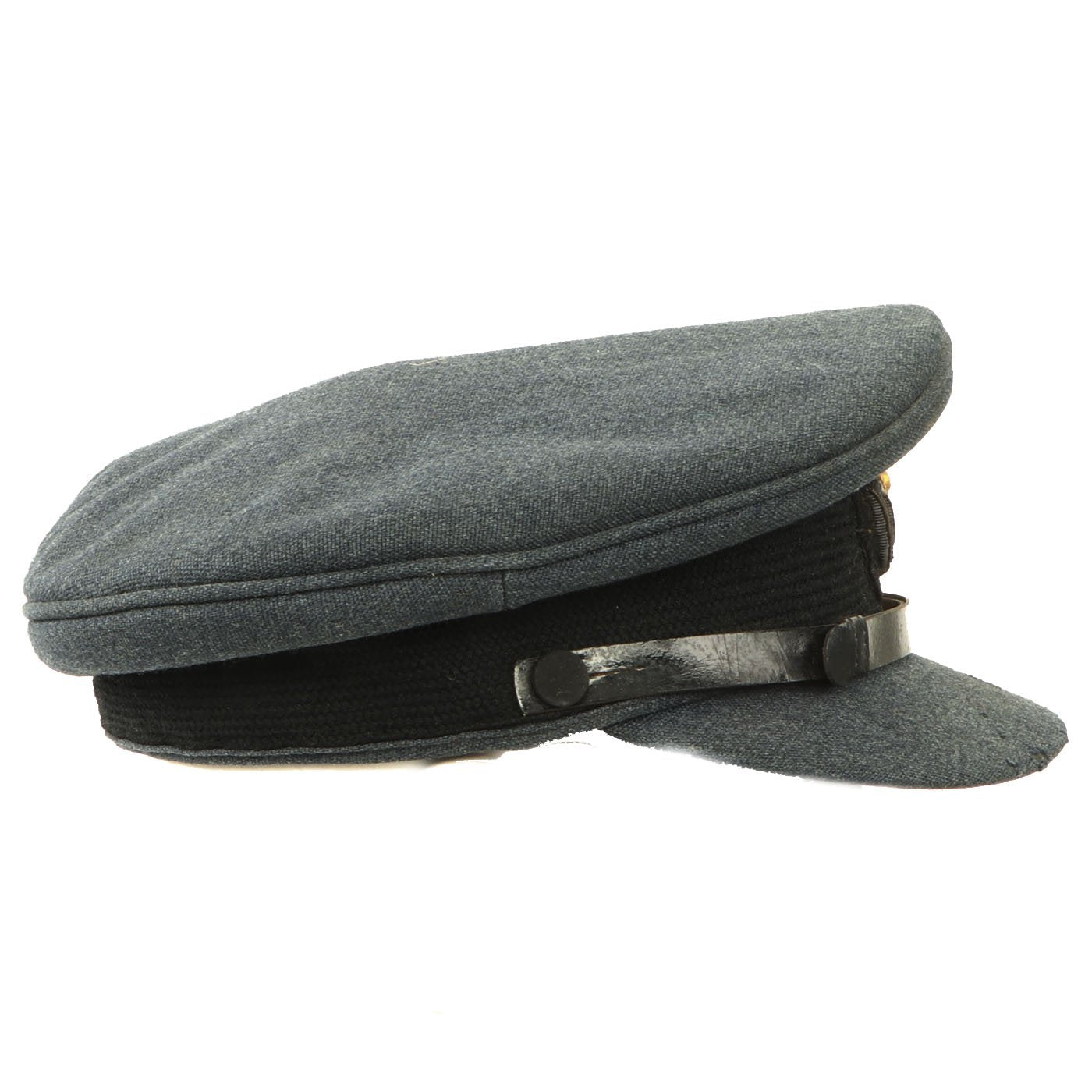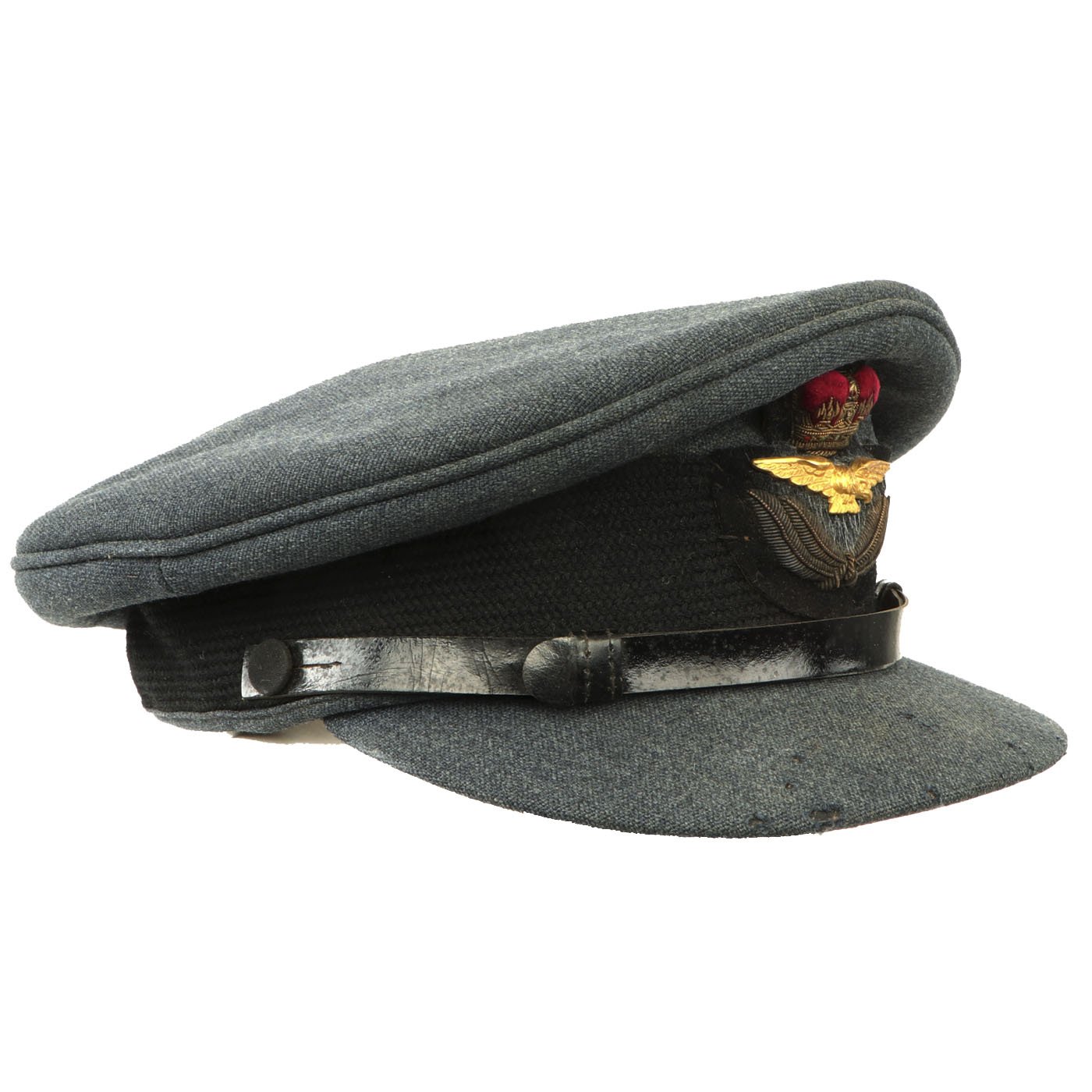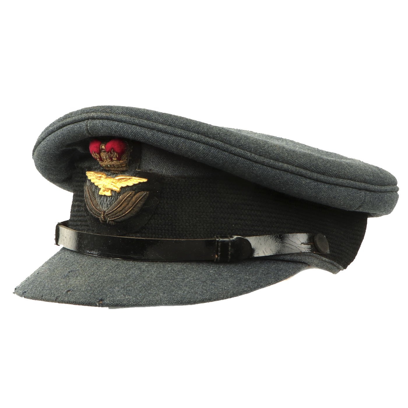 Original Item: Only One Available. This is a beautifully tailored RAF officer's peaked visor cap dating from right after WWII, around 1948. It is marked on the sweatband and under the crown sweat shield with: